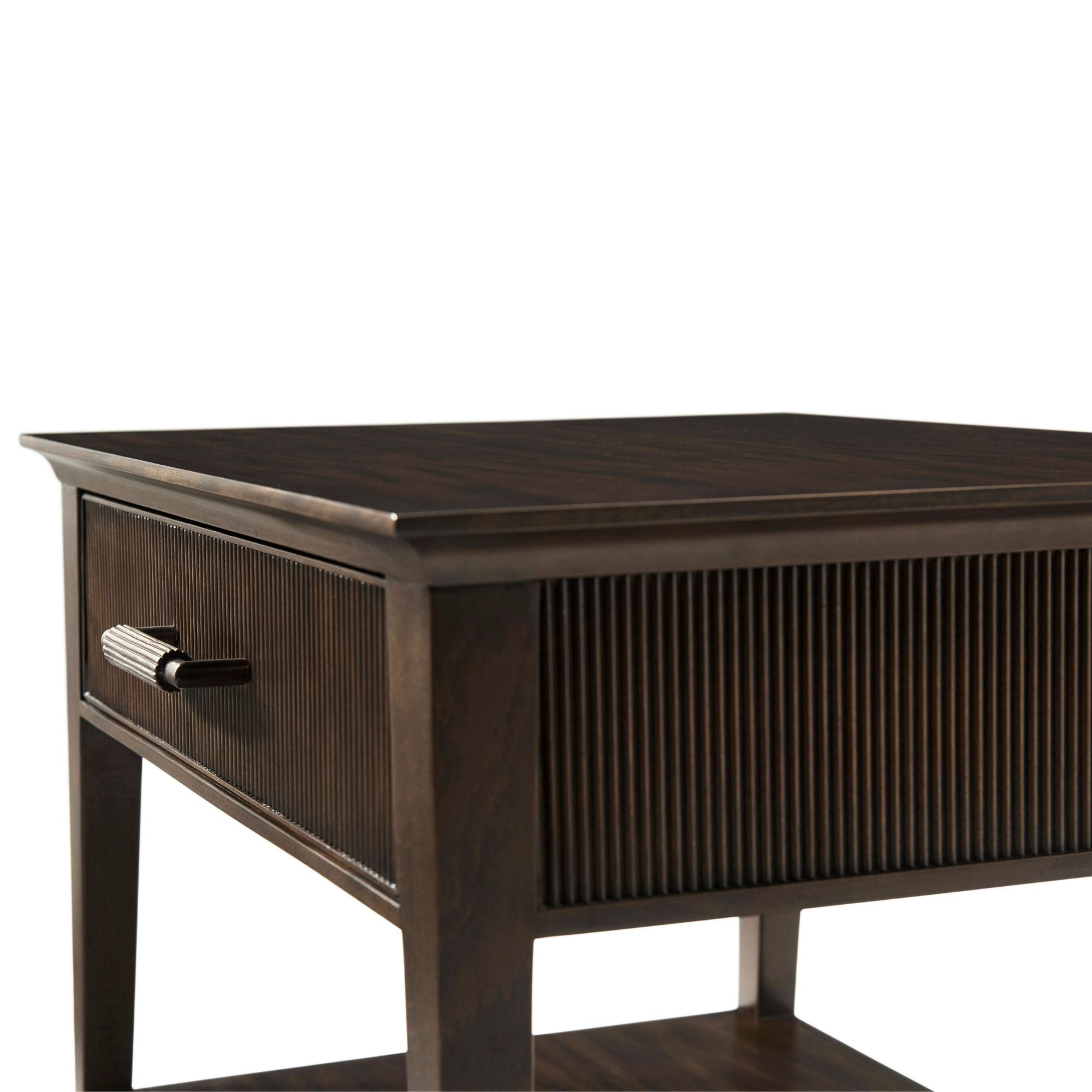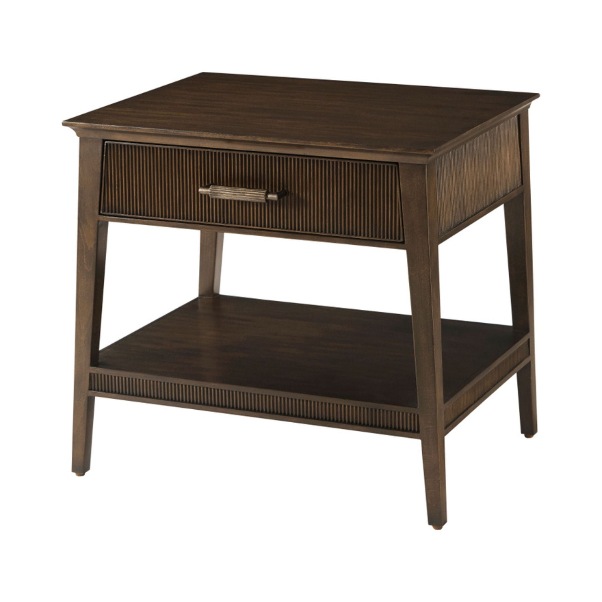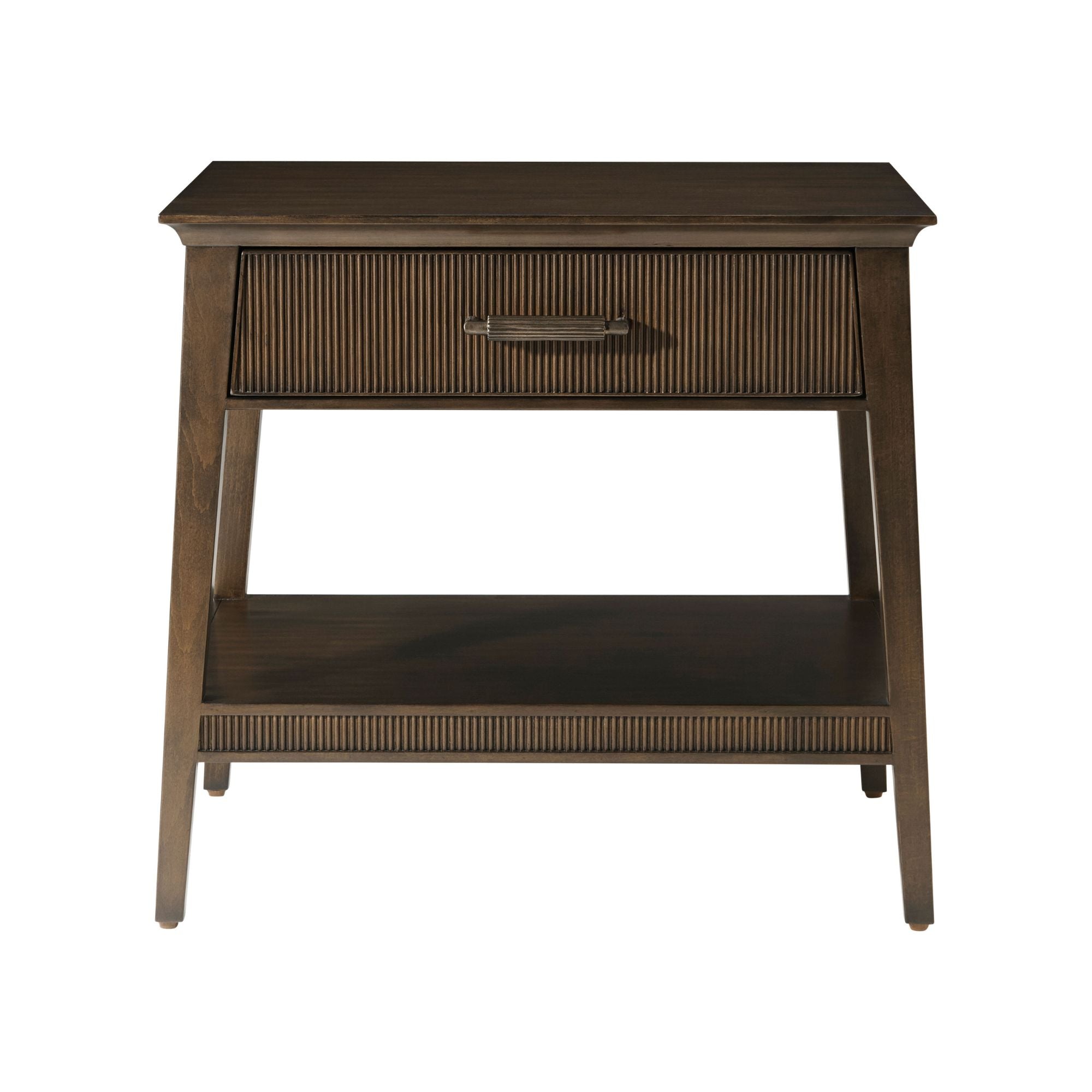 The Lido Nightstand V, crafted from Prima Vera in our Bistre finish, features a sophisticated tapered silhouette and reeded drawer and shelf. The custom forged hardware, finished in a dark rubbed bronze, echoes the reeded details throughout.