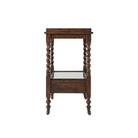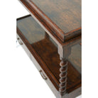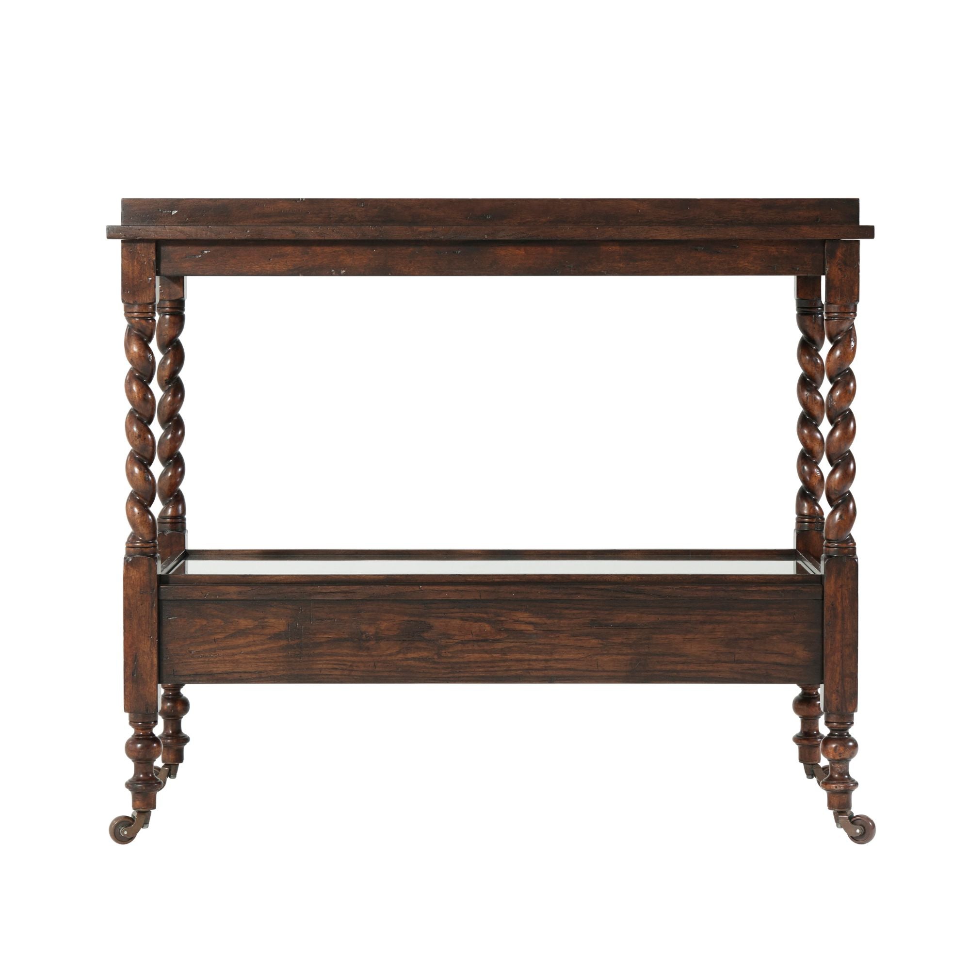 A Khaya and reclaimed oak veneered serving table, the galleried top and undertaker with glass overlay, on spiral turned legs joined by an undertier fitted with two drawers, on turned legs with brass castors.