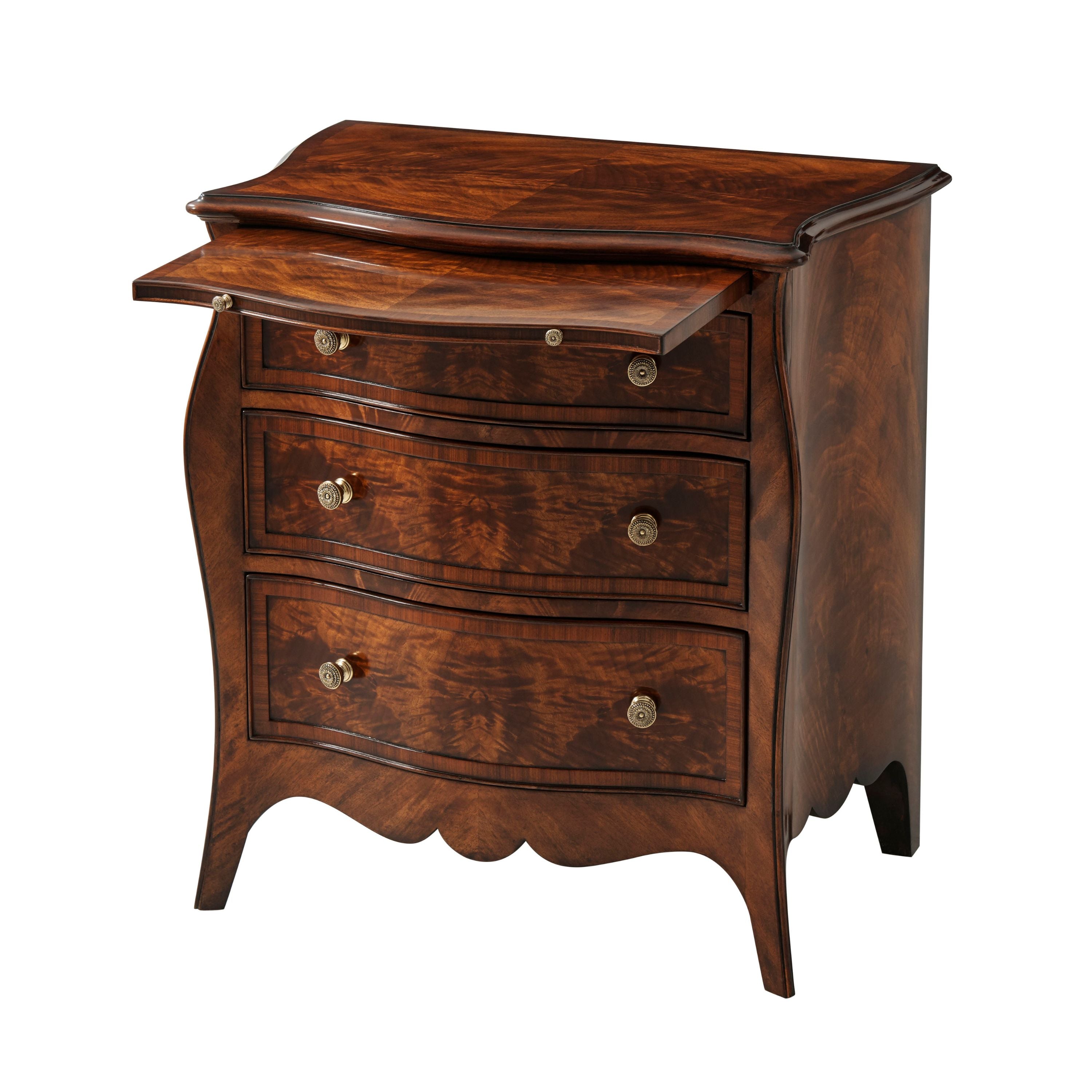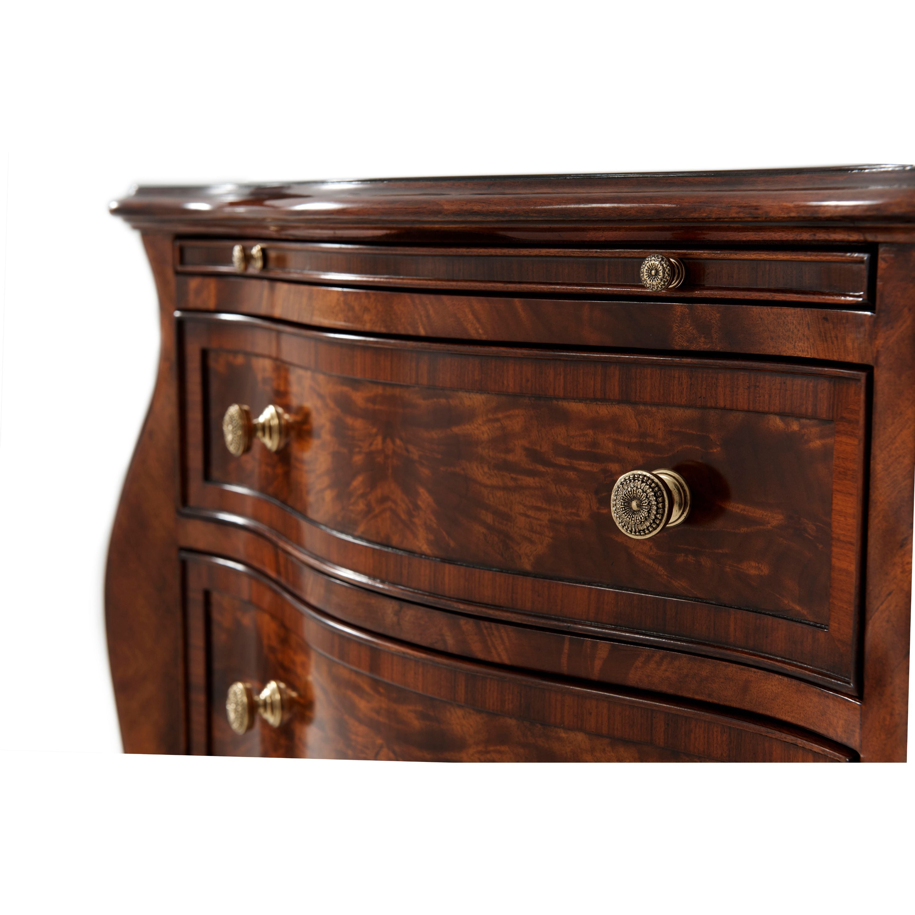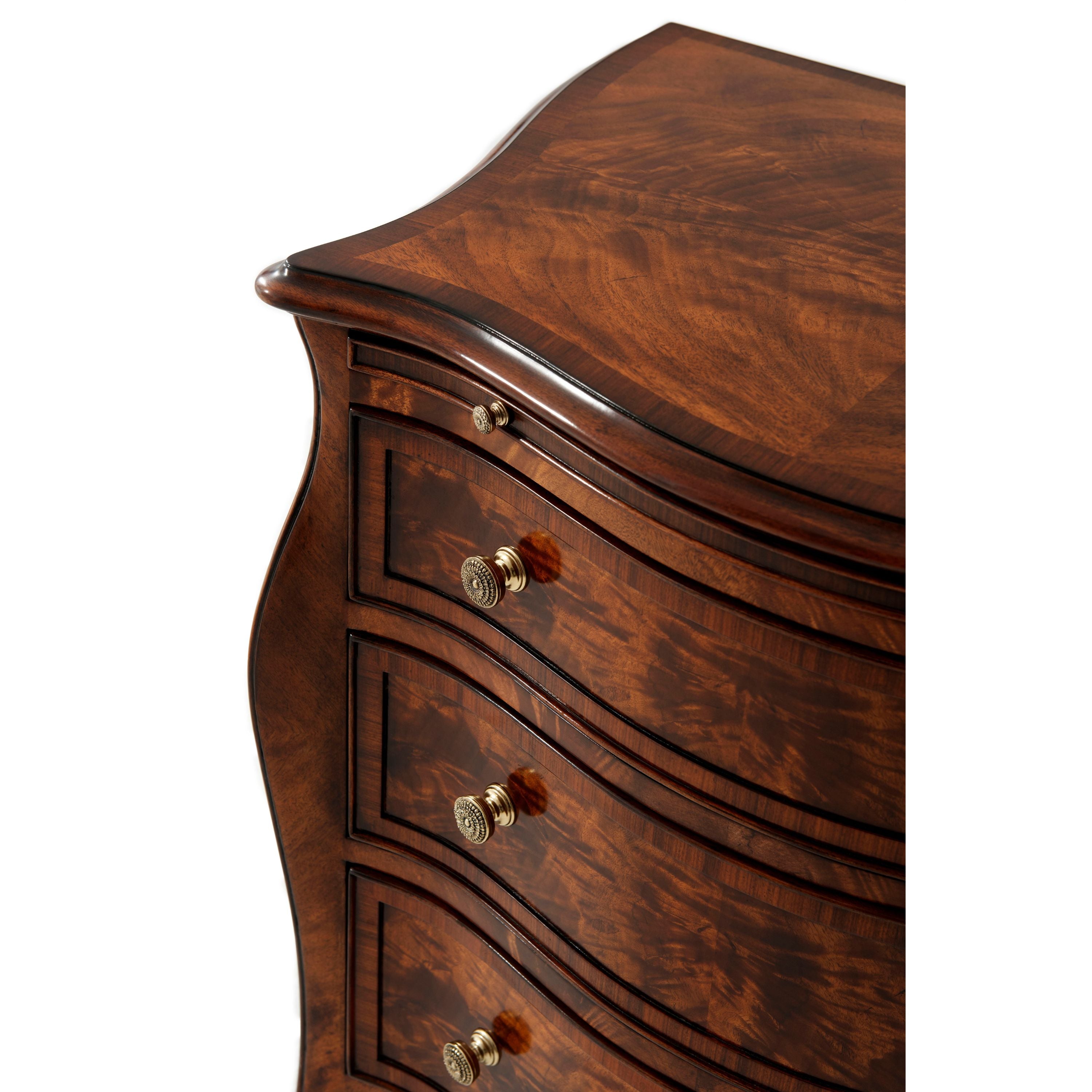 صندوق جانبي للسرير من خشب الماهوجني الفاخر، مُغطى بقشرة من خشب الماهوجني المتوهج وخشب الورد، بتصميم متقاطع، وفوقه حافة مصبوبة بشكل متعرج. زلاجة مصقولة مرصعة بالقشرة، وثلاثة أدراج متدرجة الشكل. مستوحى من تصميم أصلي لجورج الثالث.
