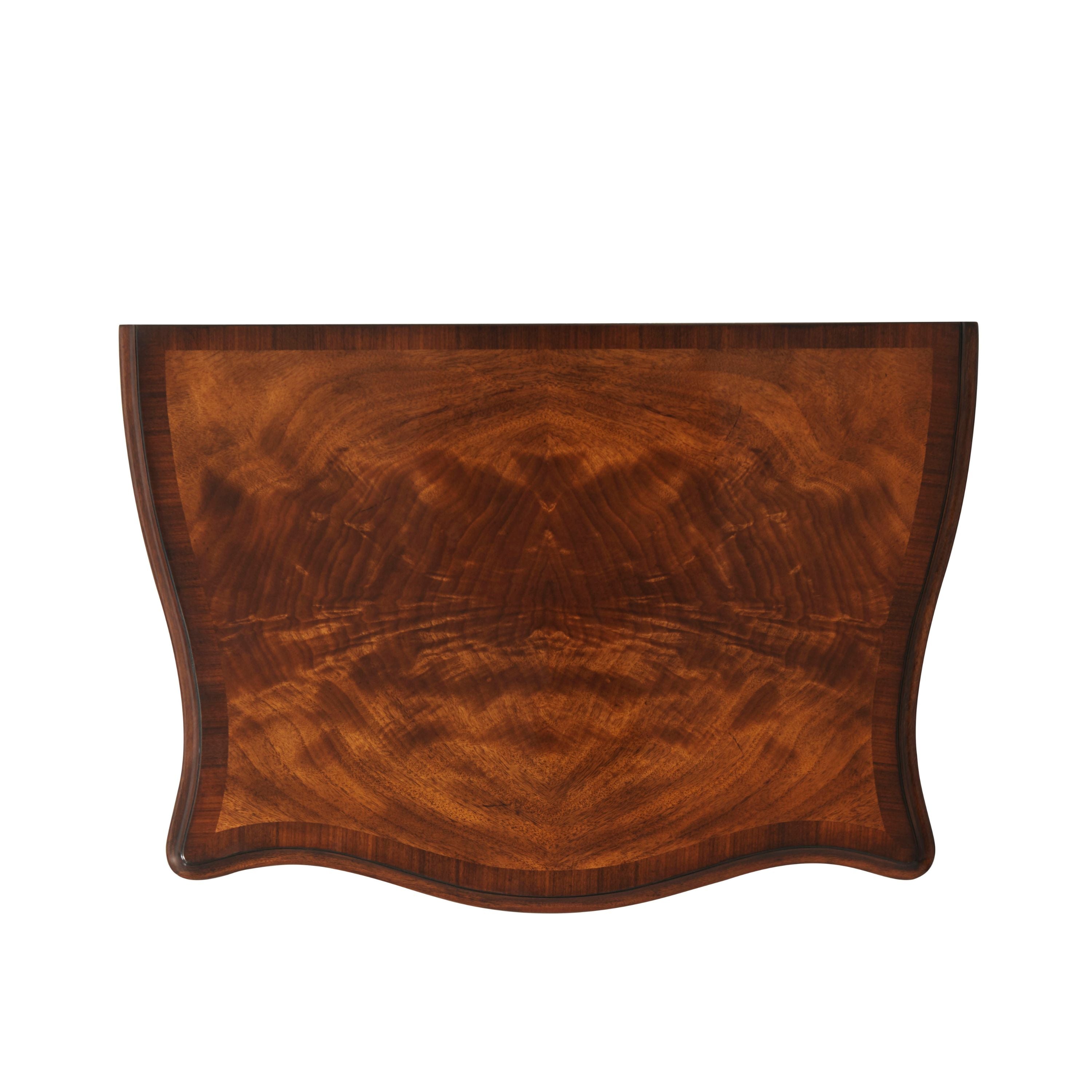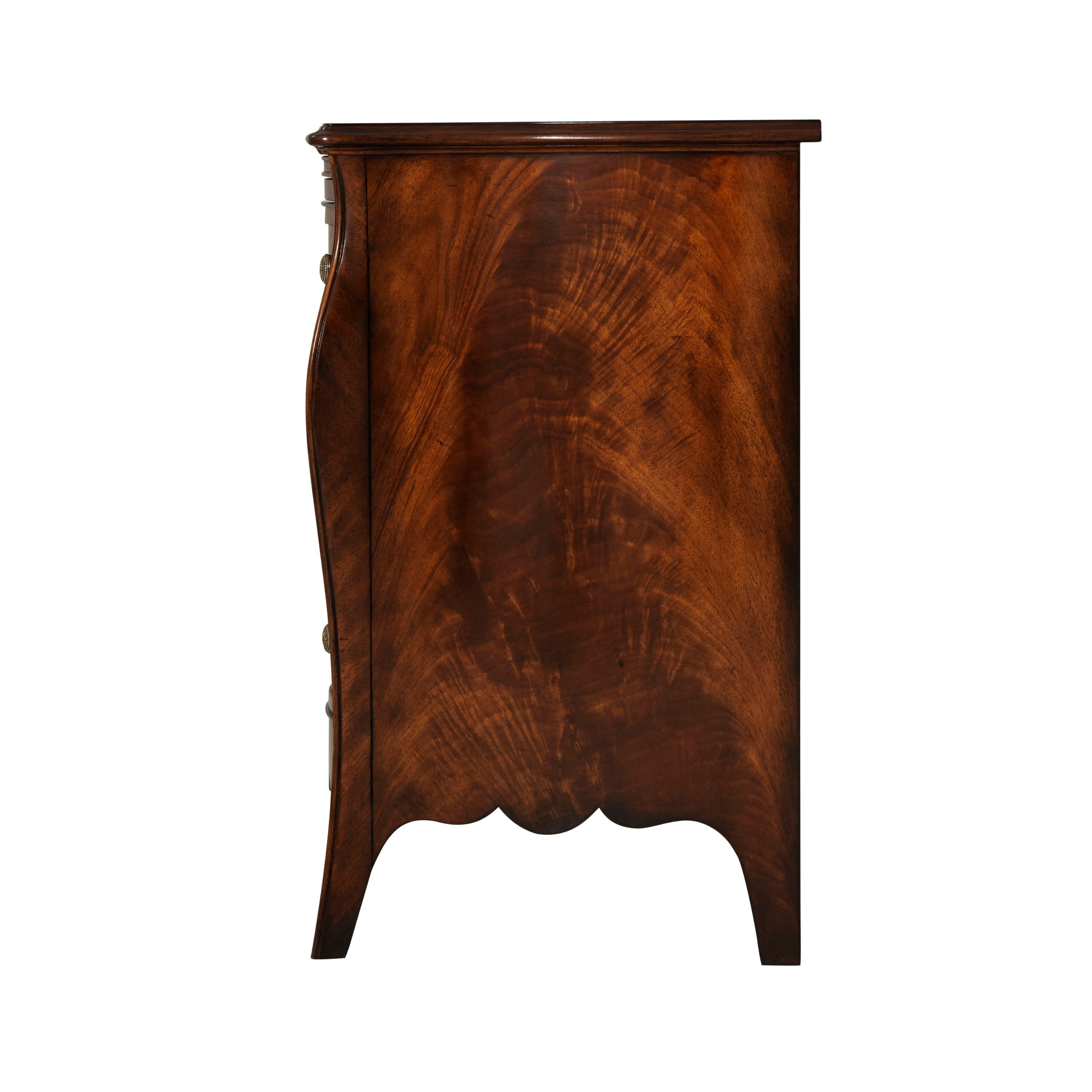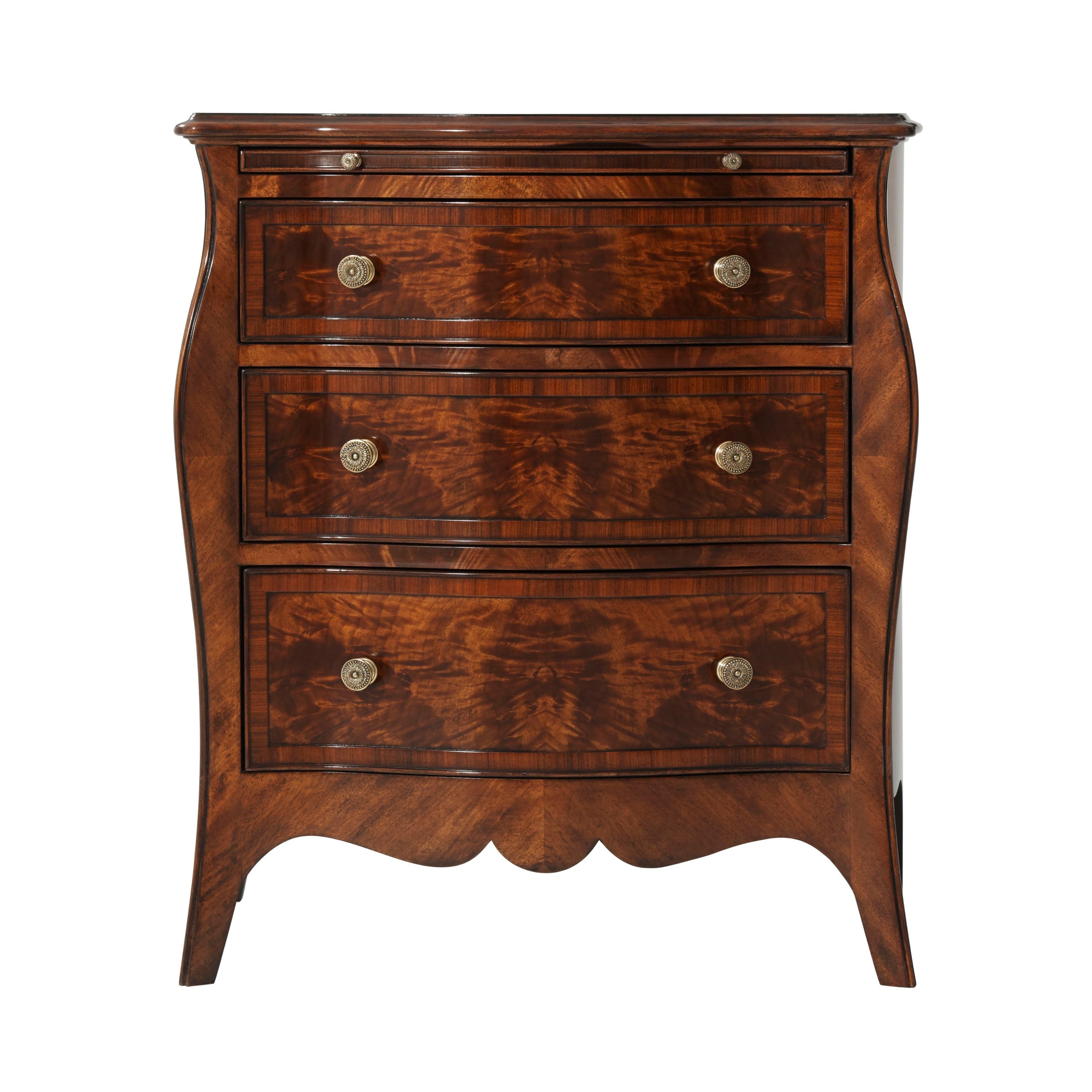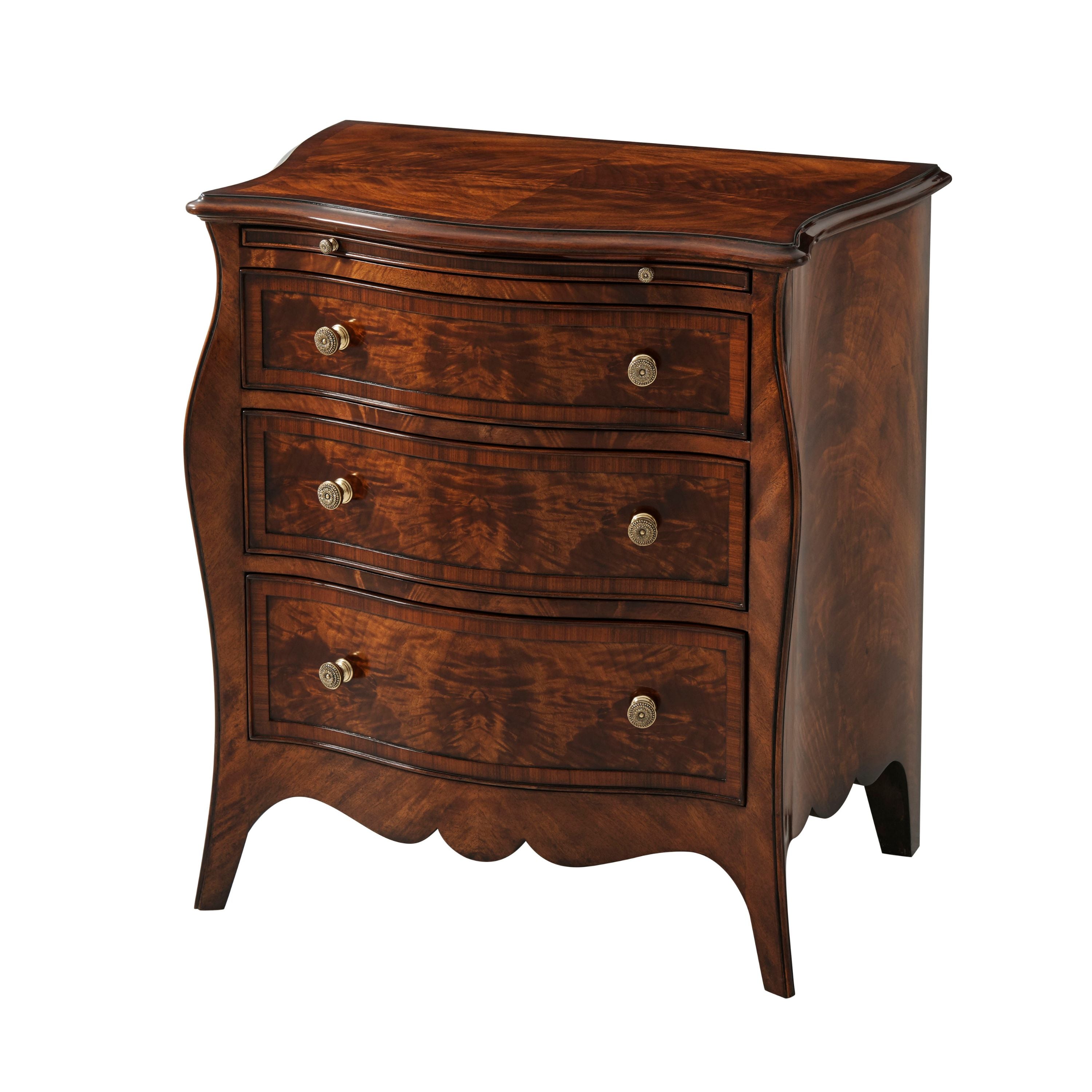 صندوق جانبي للسرير من خشب الماهوجني الفاخر، مُغطى بقشرة من خشب الماهوجني المتوهج وخشب الورد، بتصميم متقاطع، وفوقه حافة مصبوبة بشكل متعرج. زلاجة مصقولة مرصعة بالقشرة، وثلاثة أدراج متدرجة الشكل. مستوحى من تصميم أصلي لجورج الثالث.