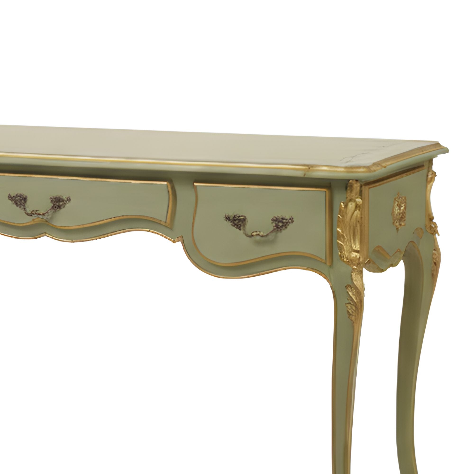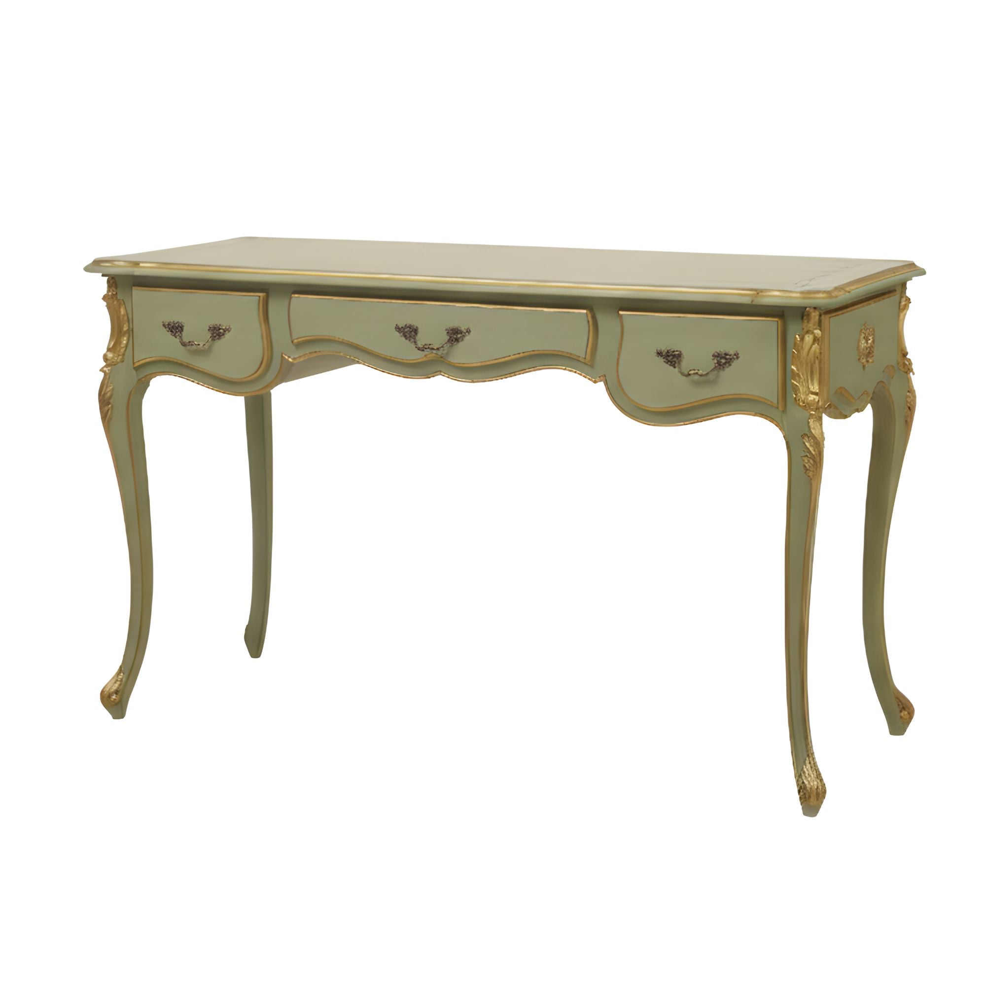 The Angela Dressing Table in green is a refined expression of classic elegance, crafted in wood with graceful cabriole legs and soft gilded accents. Its cream finish with subtle green undertones and ornate gold detailing evokes timeless sophistication, while the three-drawer design offers both beauty and functionality. A statement piece for any dressing room or bedroom, balancing artistry with everyday luxury.