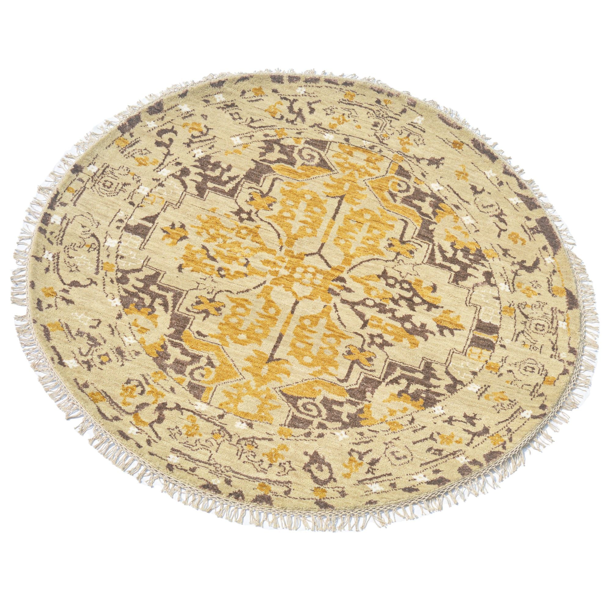 أضفِ لمسةً من الأناقة إلى مساحتك مع هذه السجادة المعقودة يدويًا، المصنوعة من الصوف المنسوج يدويًا والحرير الطبيعي. تتفتح في المنتصف ميدالية ذهبية غنية، محاطة بزخارف نباتية رقيقة بألوان دافئة من الأصفر والكستنائي. يُبرز اللمعان الناعم للحرير التصميم المعقد، بينما تُضفي قاعدة الصوف أناقةً ملموسةً وواقعية. مثالية للديكورات الداخلية التي تجمع بين التقاليد الخالدة والفخامة البسيطة.