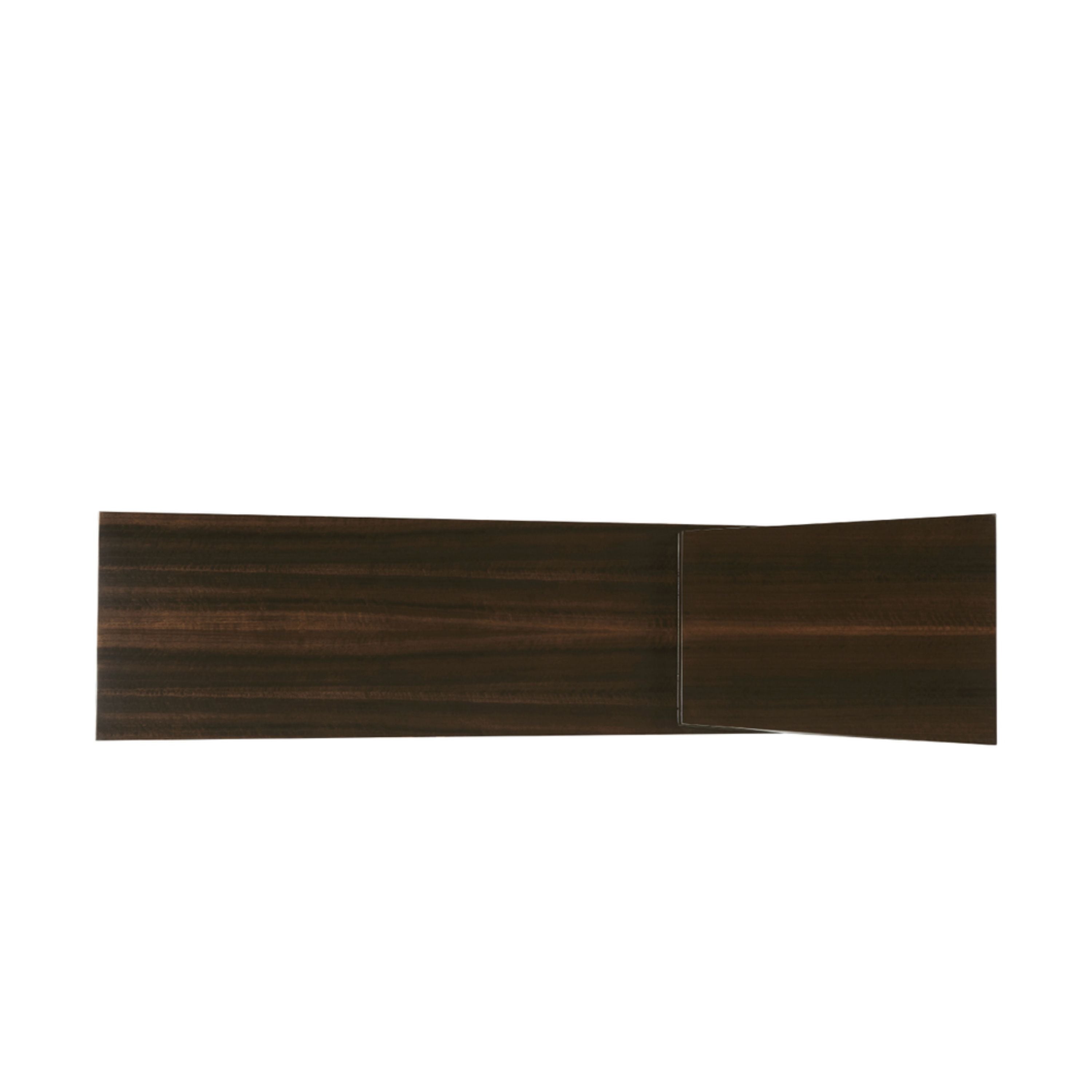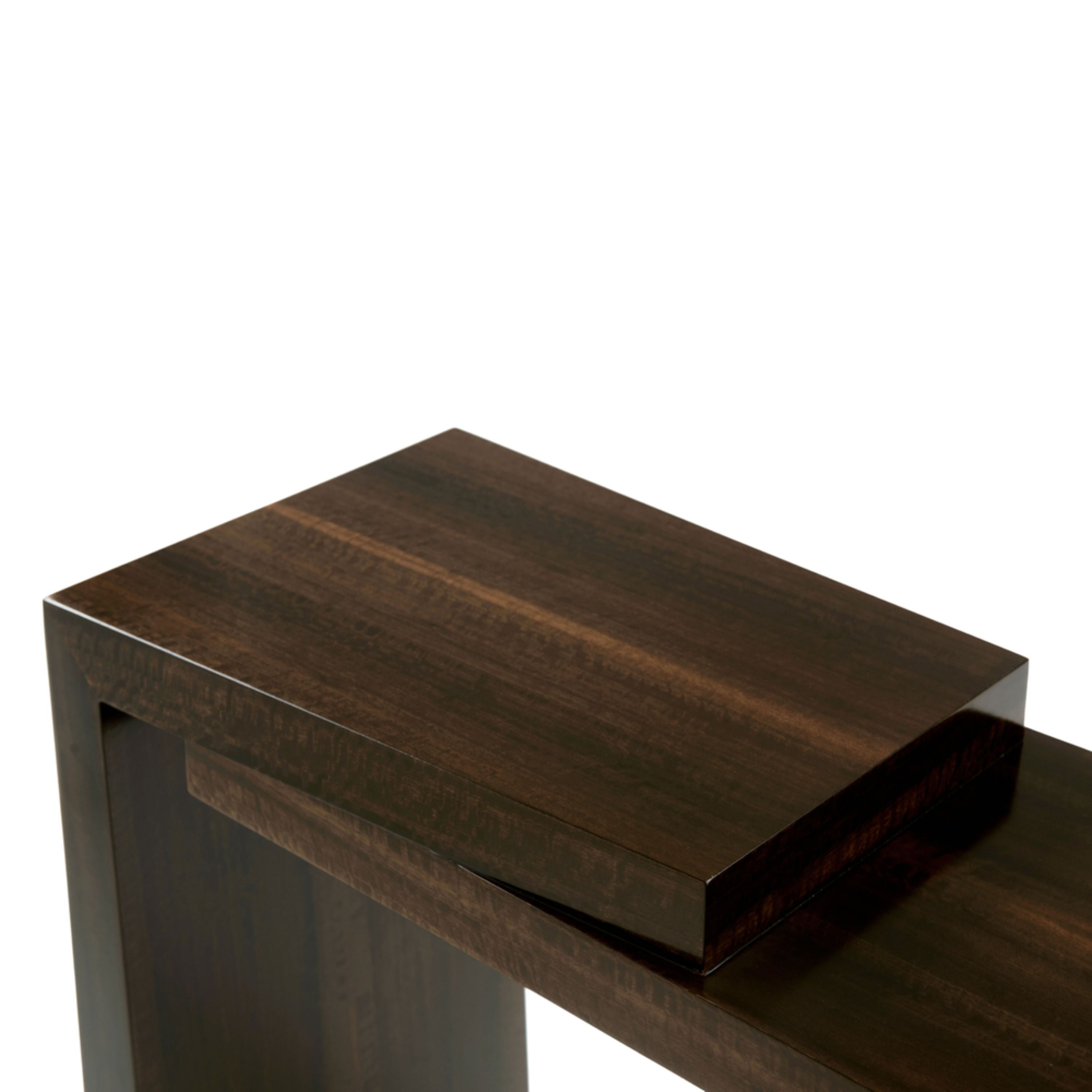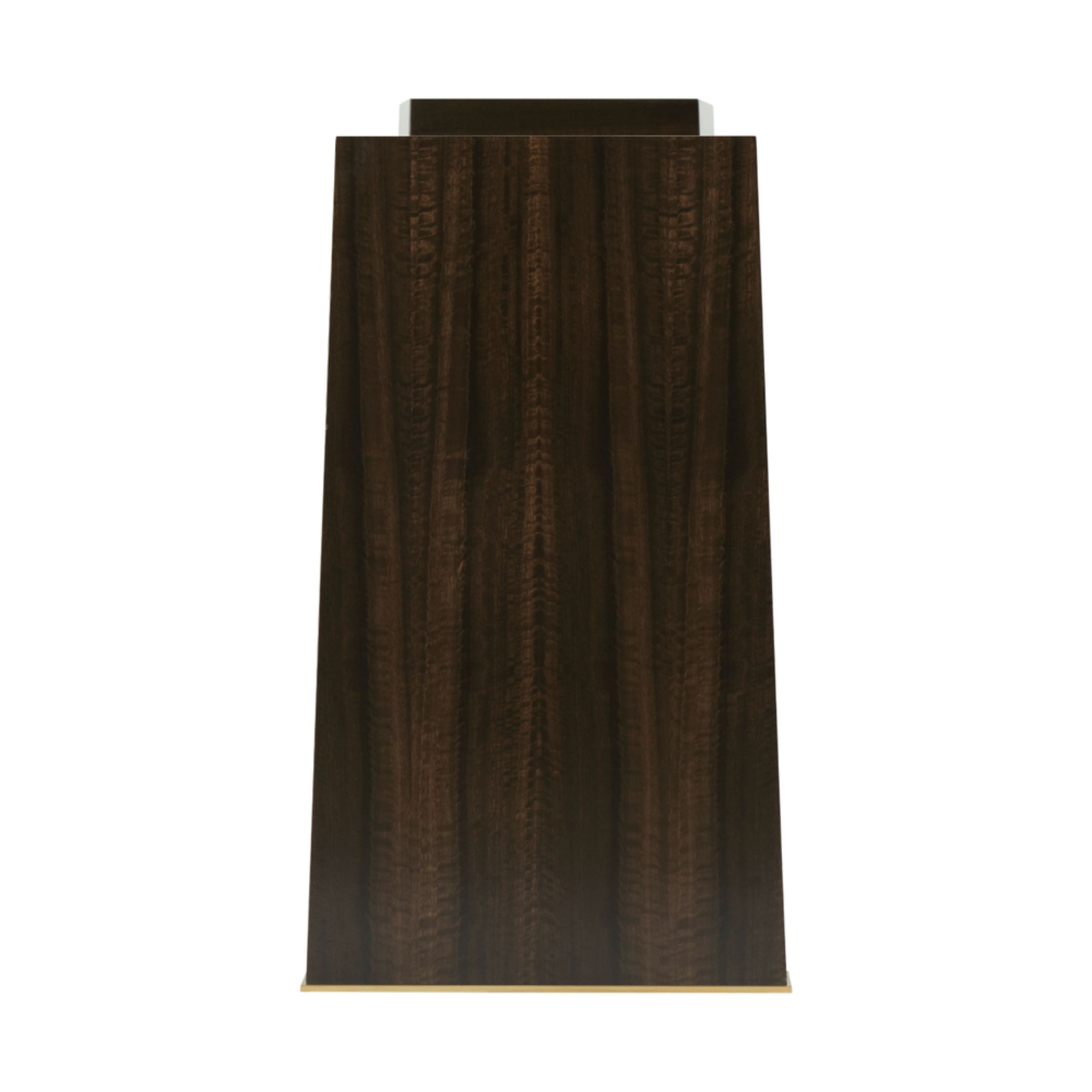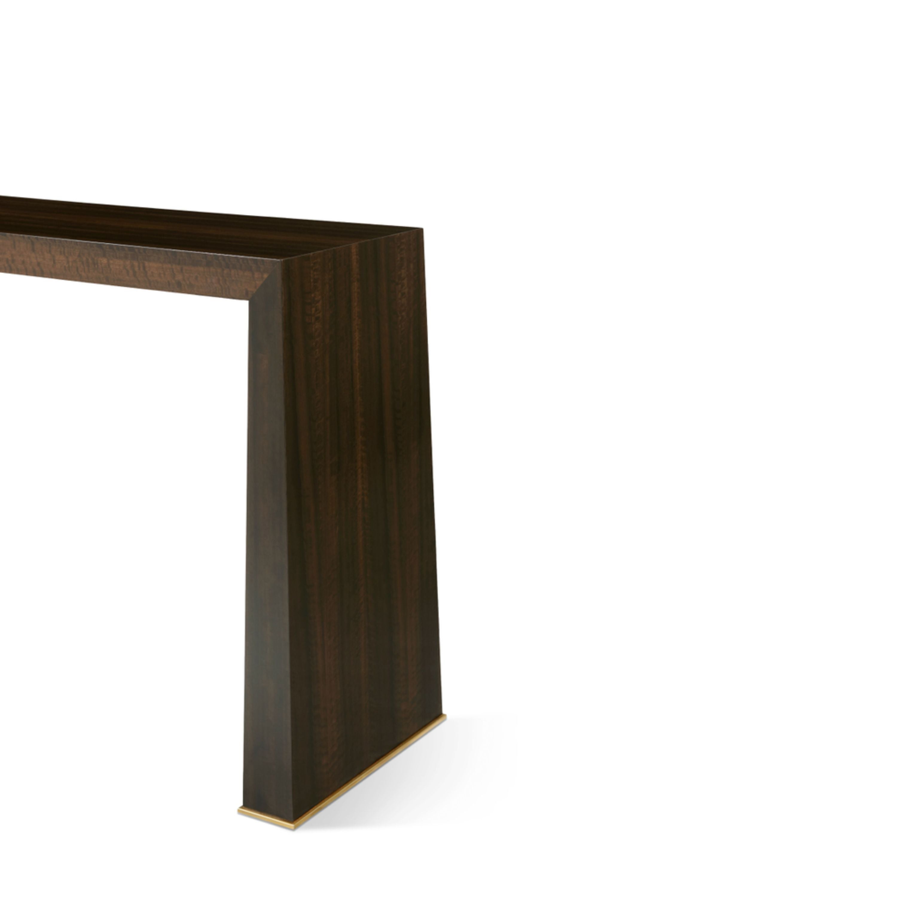 طاولة كونسول أنيقة مستطيلة الشكل من خشب الأوكالبتوس، بسطح علوي ناعم من طبقتين. تتميز هذه الطاولة بقاعدة أمامية وخلفية مائلة بلمسات نحاسية، وتتميز بلمسة نهائية من خشب الأوكالبتوس المدخن.