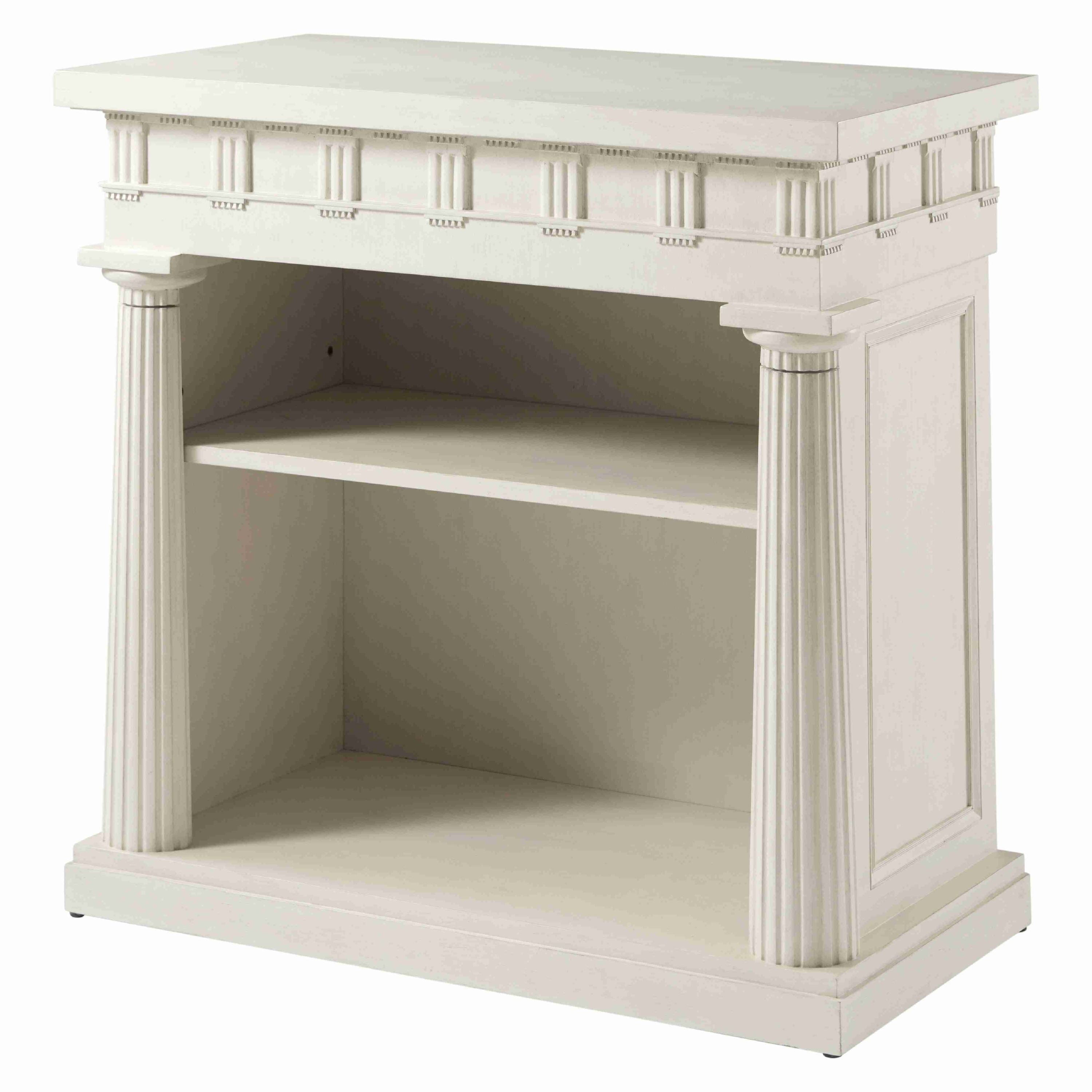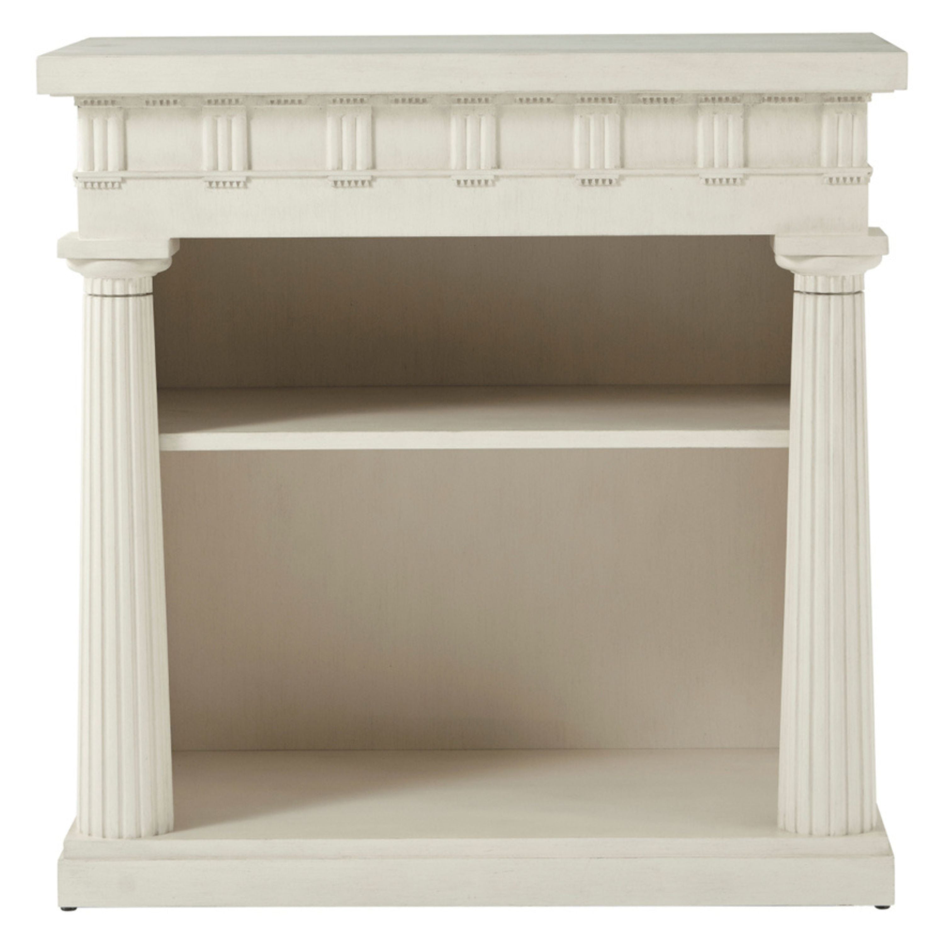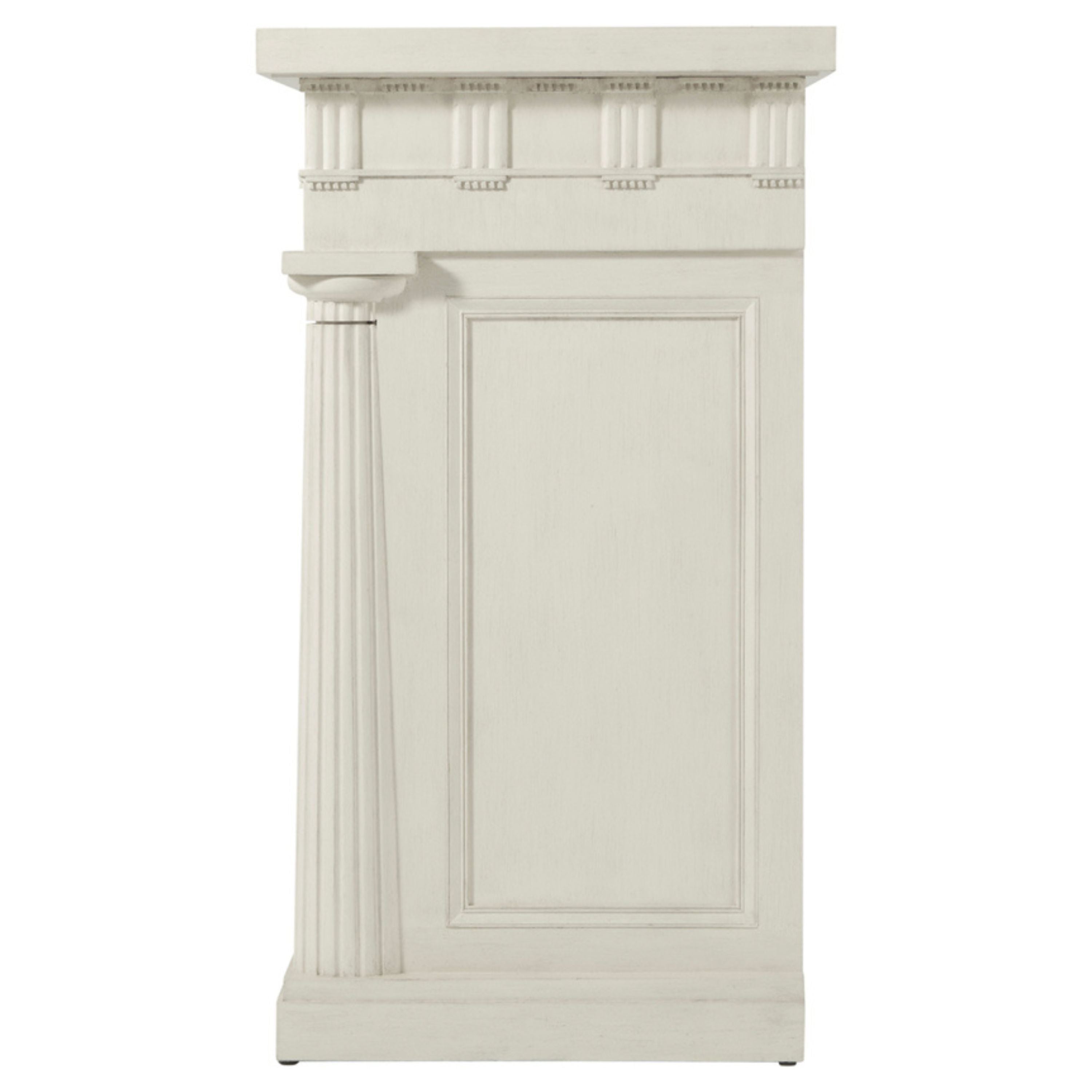 طاولة مكتبة تيمبيتو، مصممة لشقة أليكسا، تتميز هذه الجوهرة بجميع العناصر الكلاسيكية: أعمدة دوريكية مزخرفة، وإفريز بزخارف ثلاثية وزخارف ميتوبيسية، وألواح جانبية غائرة. معروضة باللون الأبيض المملح.