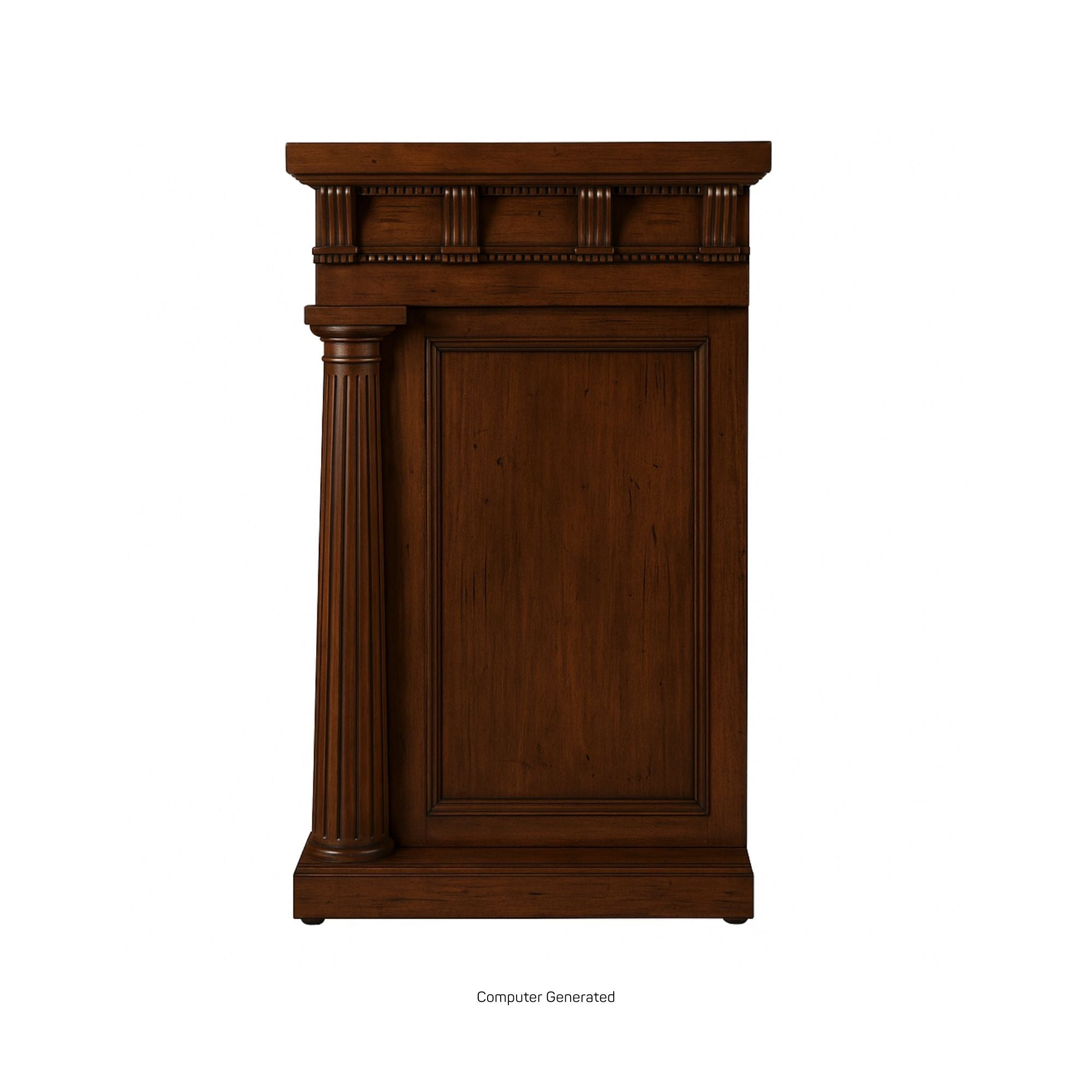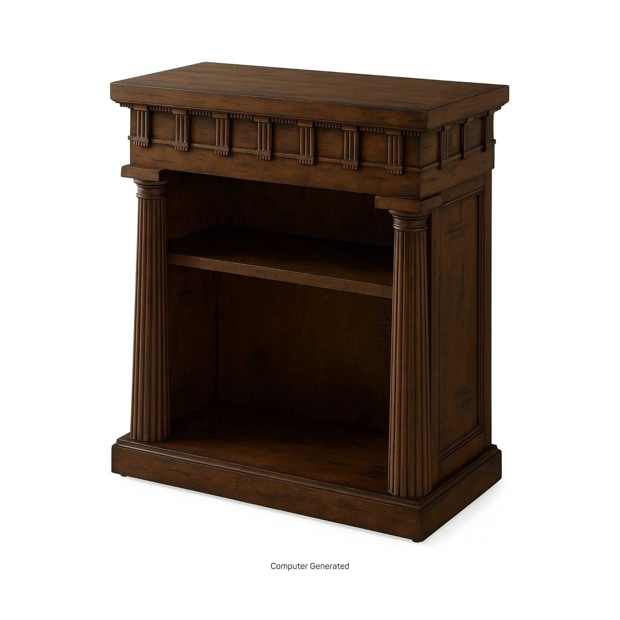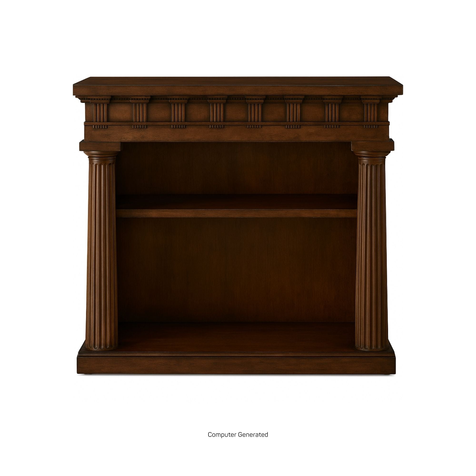 طاولة مكتبة تيمبيتو، مصممة لشقة أليكسا، تتميز هذه الجوهرة بجميع العناصر الكلاسيكية: أعمدة دوريكية مزخرفة، وإفريز بزخارف ثلاثية وزخارف ميتوبيسية، وألواح جانبية غائرة. معروضة باللون الأبيض المملح.