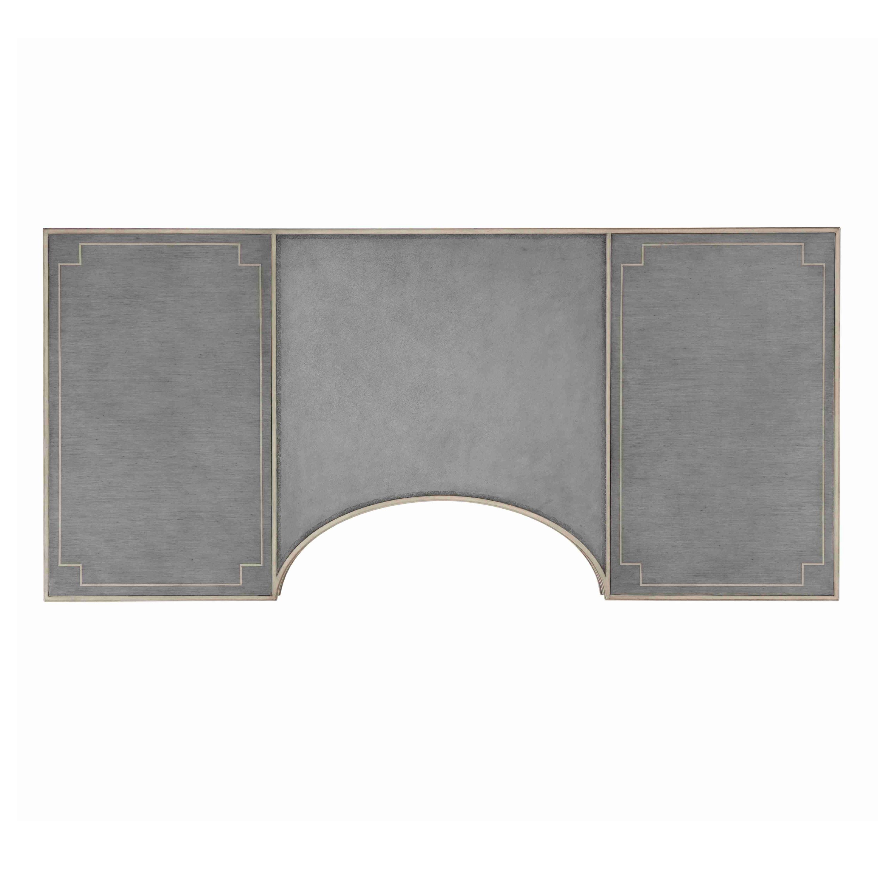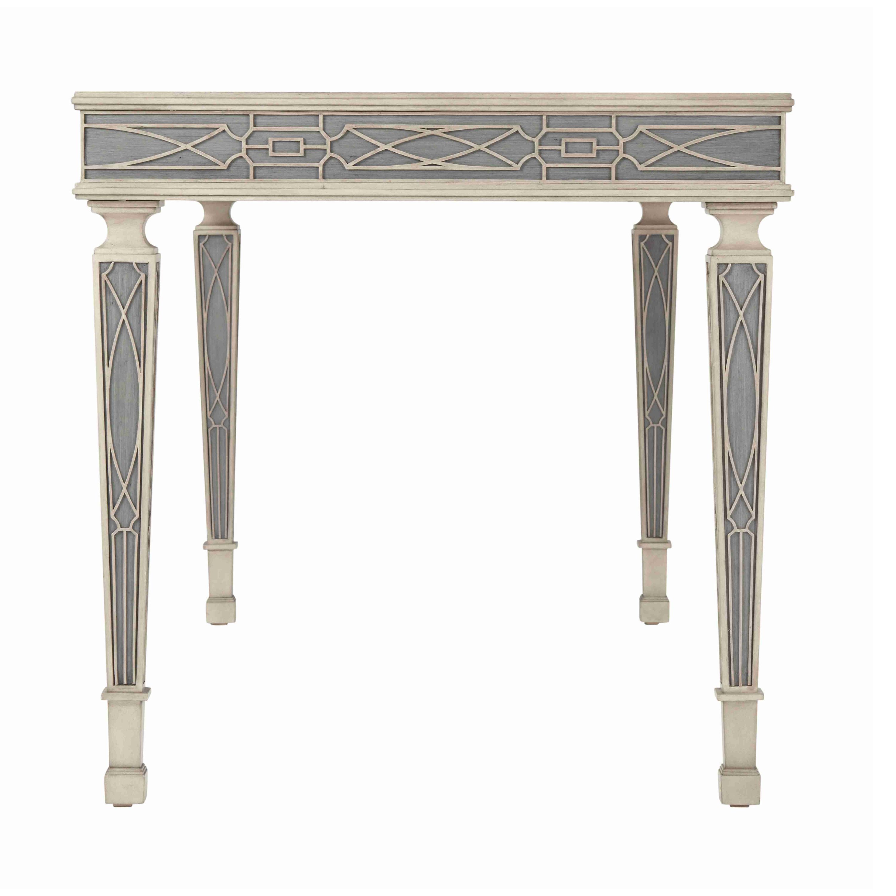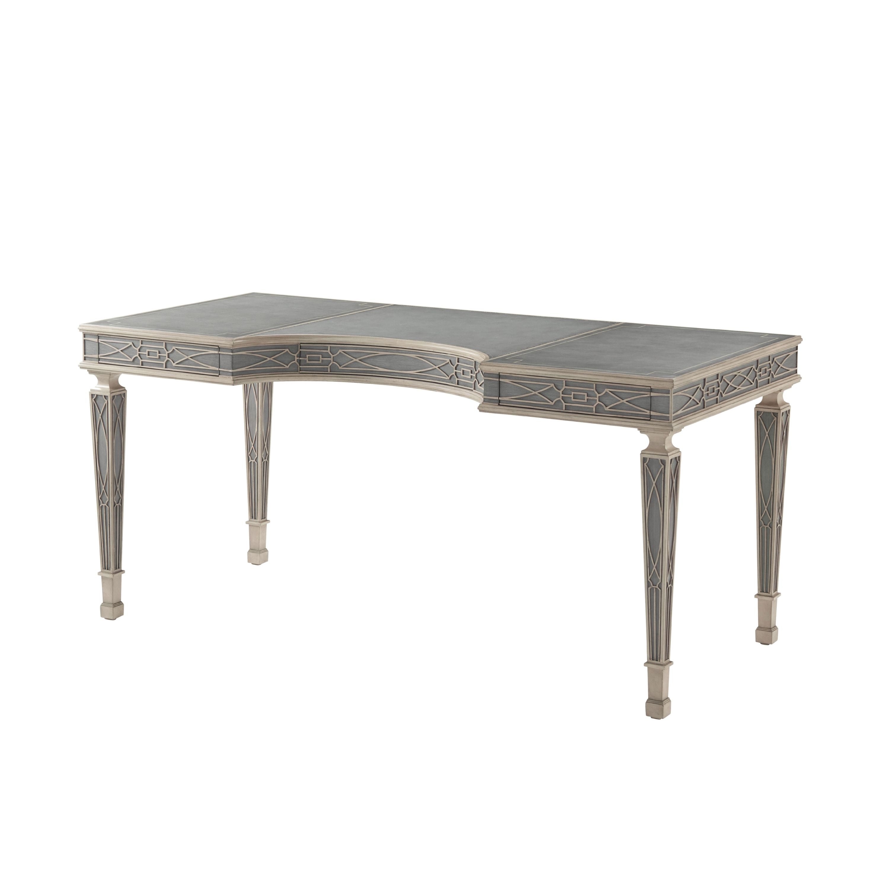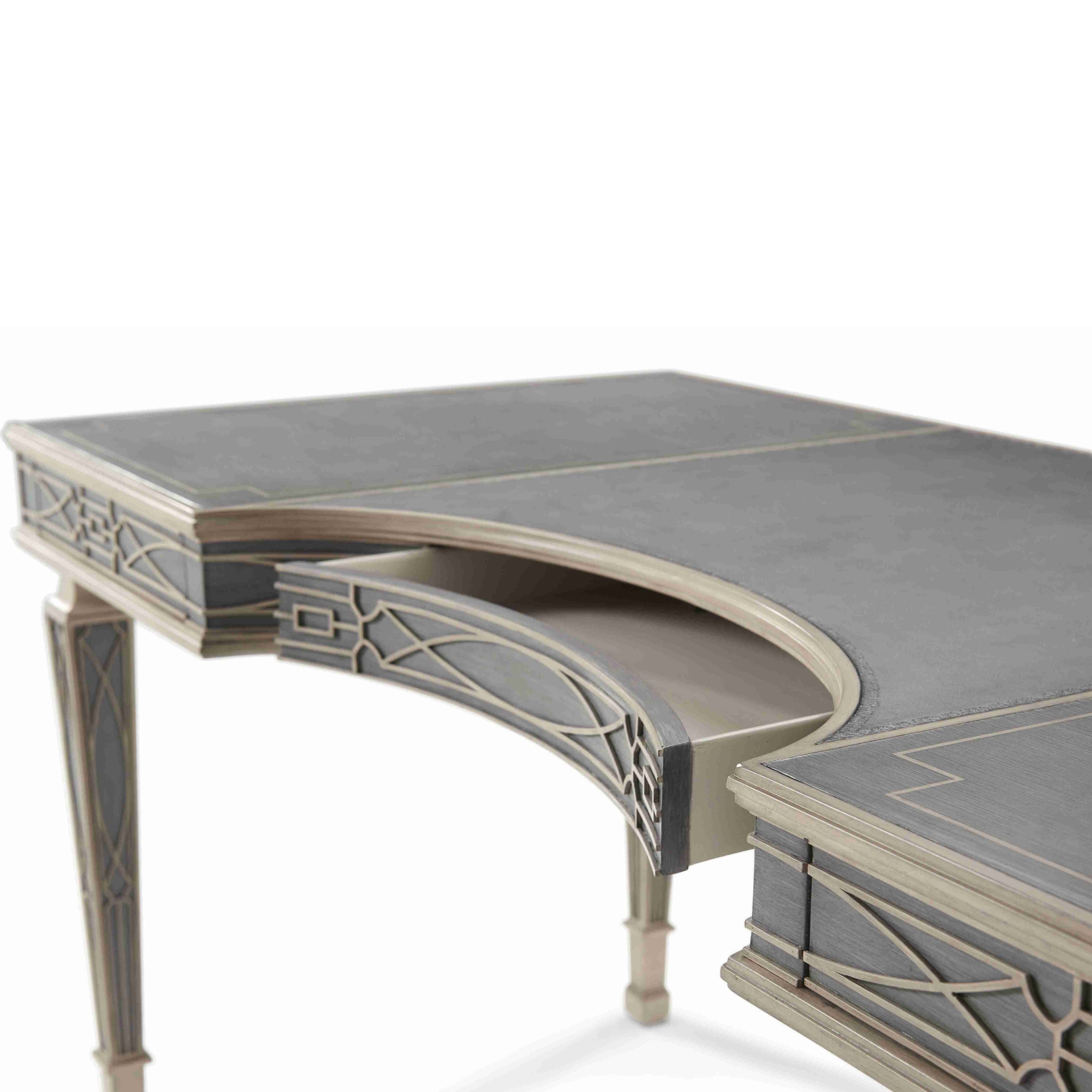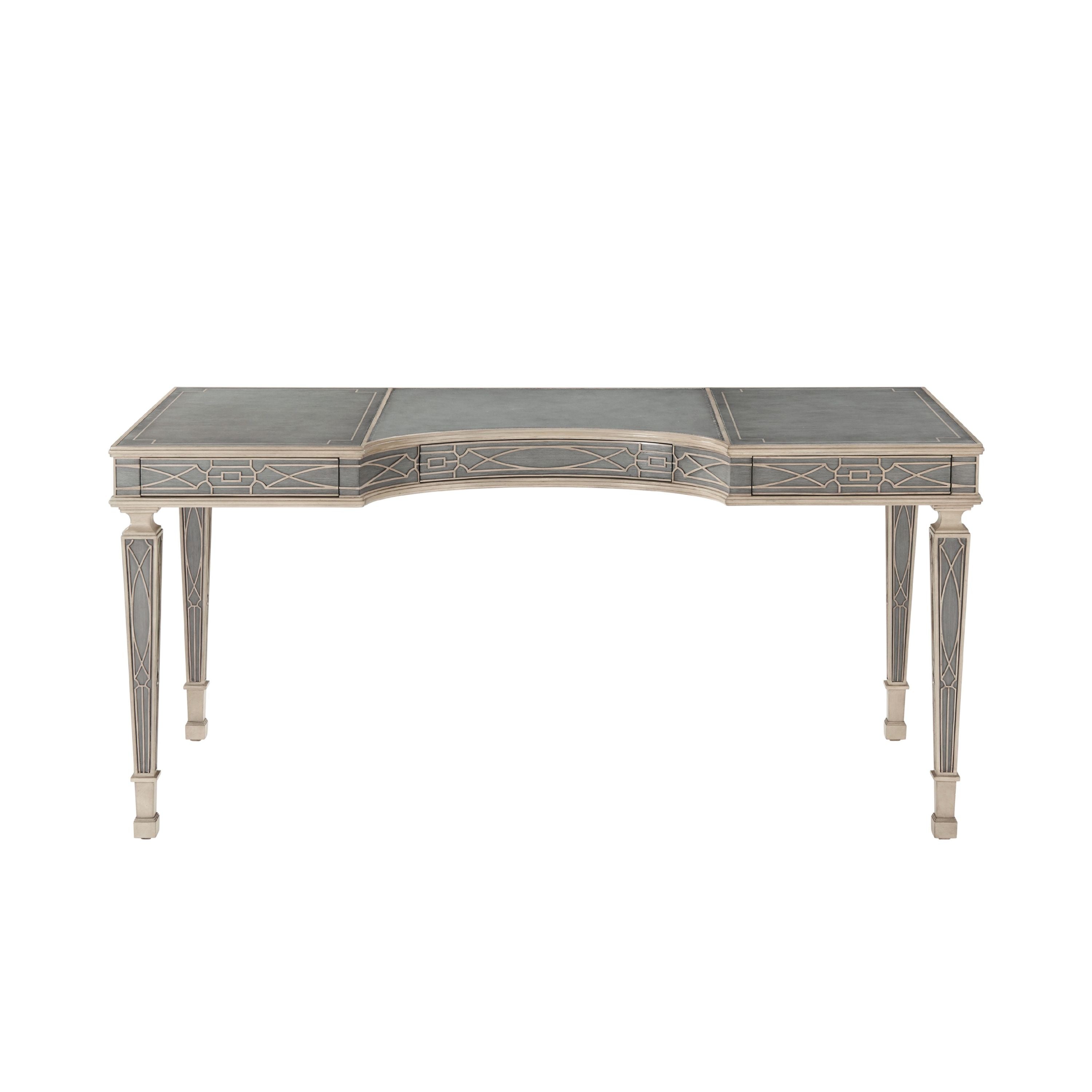 يُكمّل المئزر المقطوع على شكل نصف قمر والجلد المُزخرف المُقوّس في مكتب "مورنينغ روم" بأناقة الأدراج الثلاثة المُستوحاة من الإفريز في مكتبنا المطلي باللون الرمادي الجيري بتصميمه المُشَكَّل بأشرطة. يُرى بساق مُدببة مُزخرفة بتفاصيل مُتداخلة مُزيّنة بأرجل مُكعبة.