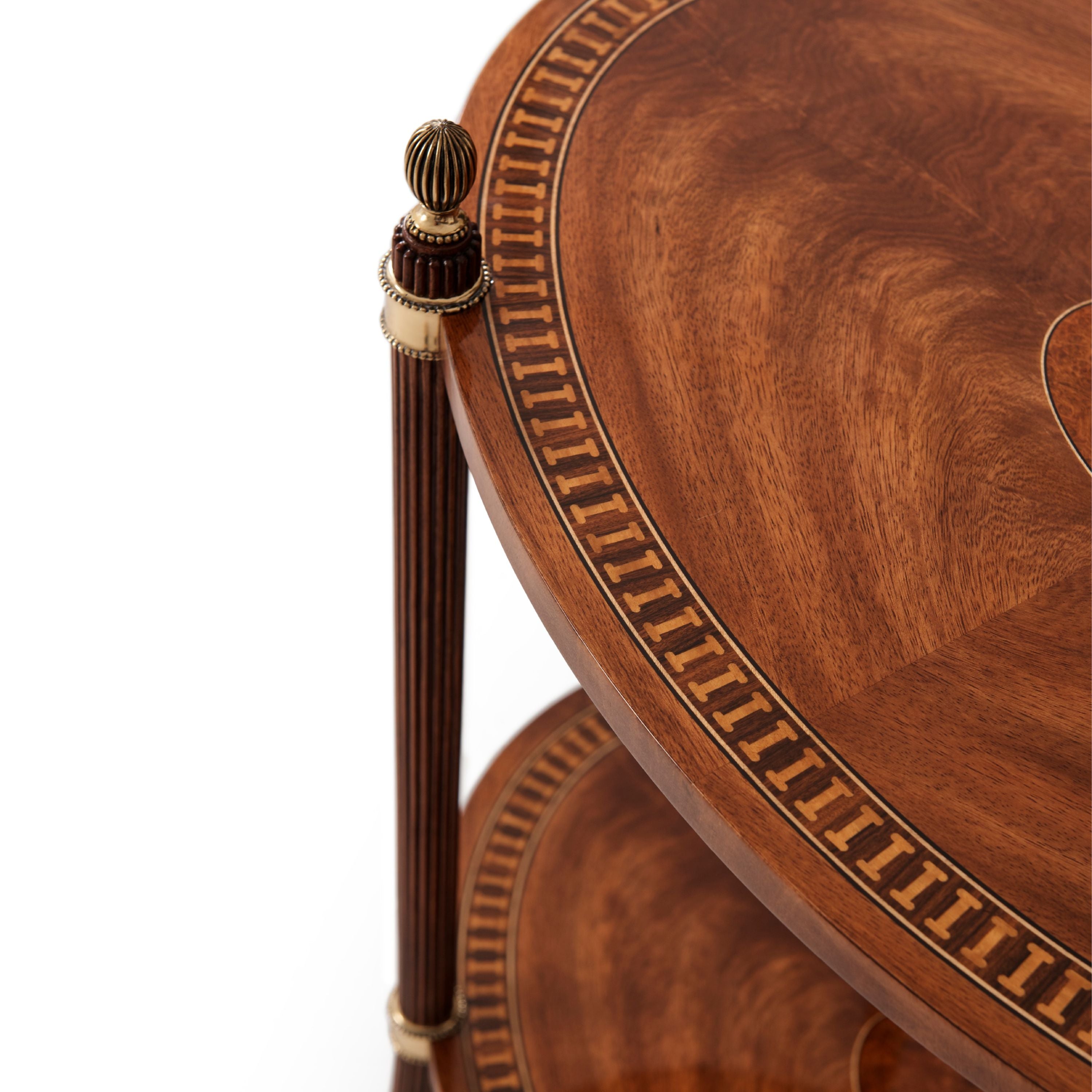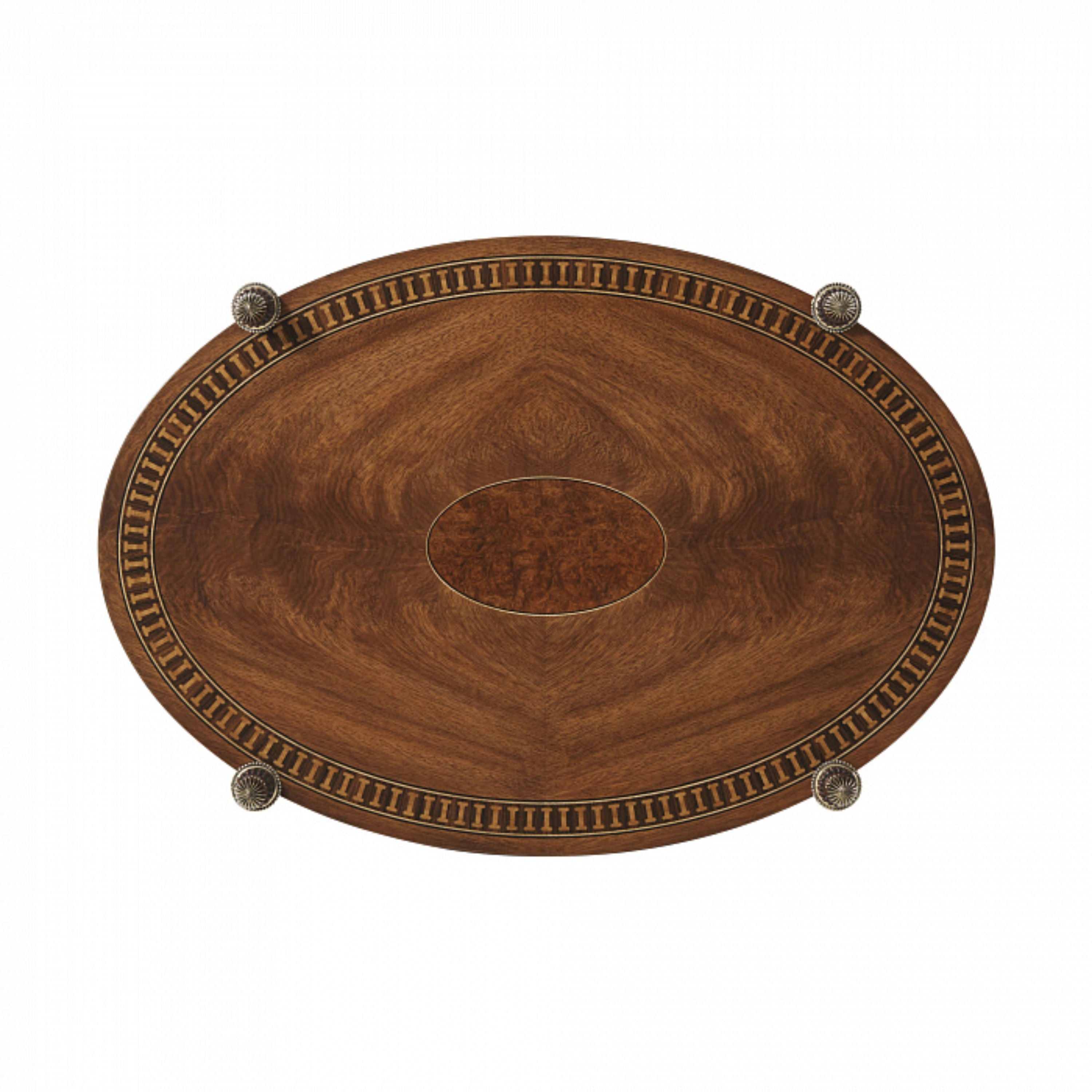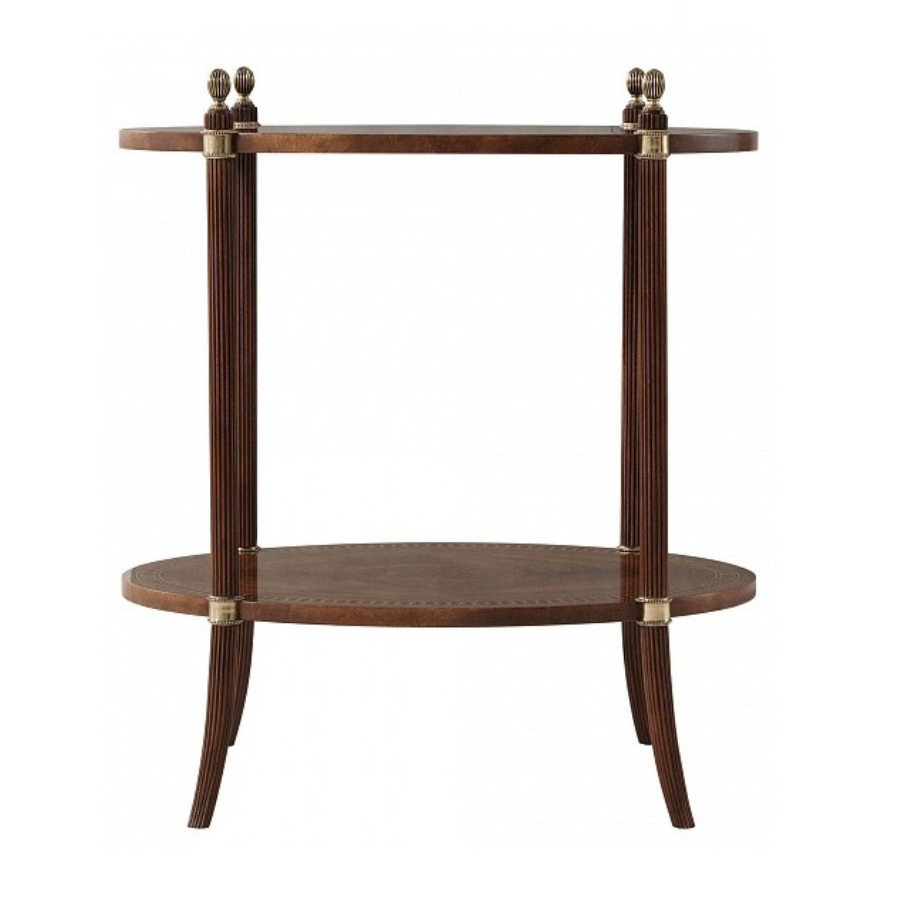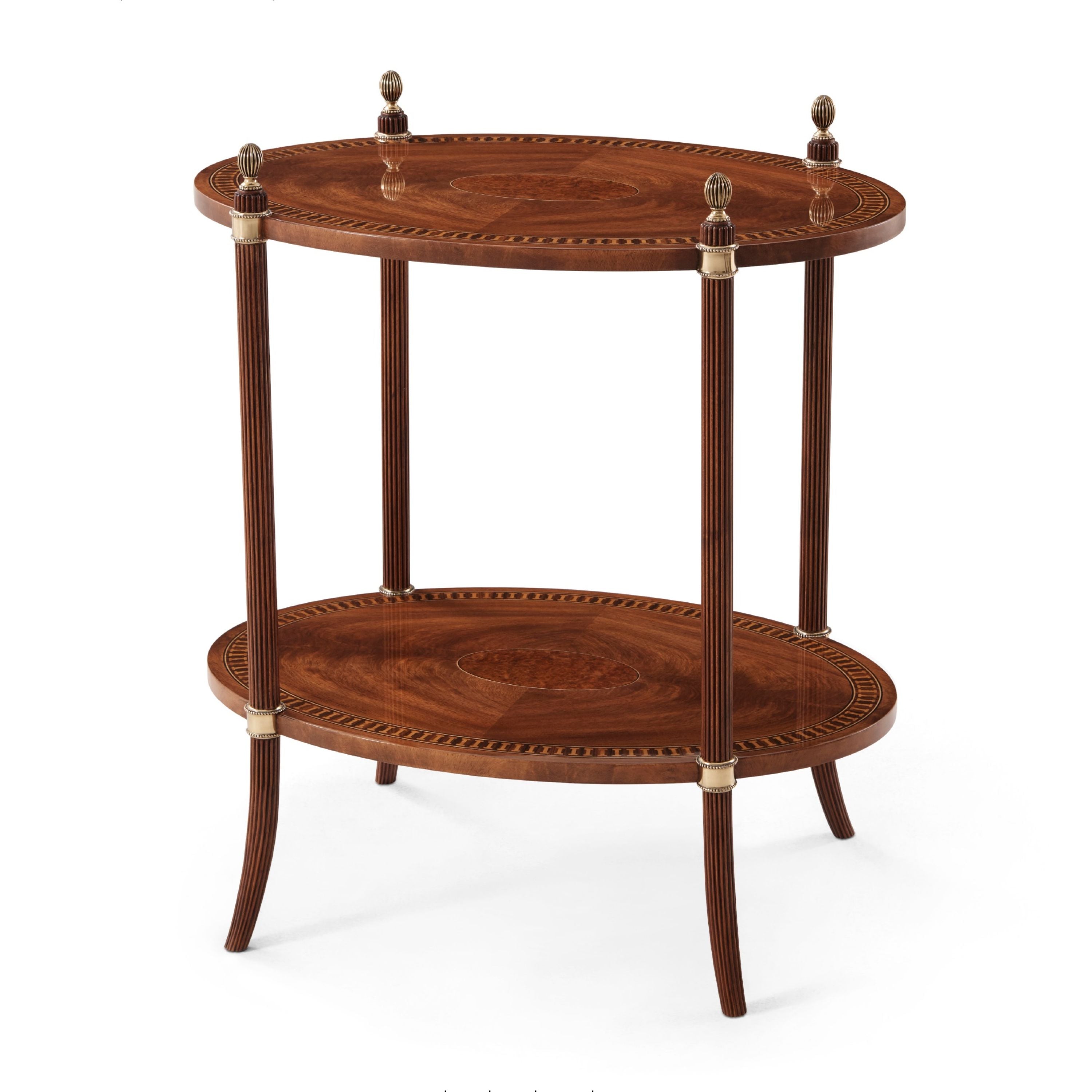 طاولة جانبية مصنوعة من خشب Cerejeira المغطى بقشرة من خشب Morado وSycamore ومزينة بأشرطة خشبية، الجزء العلوي والجزء السفلي بيضاويان بخيوط مزدوجة دقيقة تتوسطها عقدة بيضاوية من خشب الجوز، على دعامات أعمدة مضلعة مع لمسات نهائية من النحاس الأصفر على الطراز الإنجليزي القديم وزخارف نهائية، على أرجل مضلعة متباعدة.