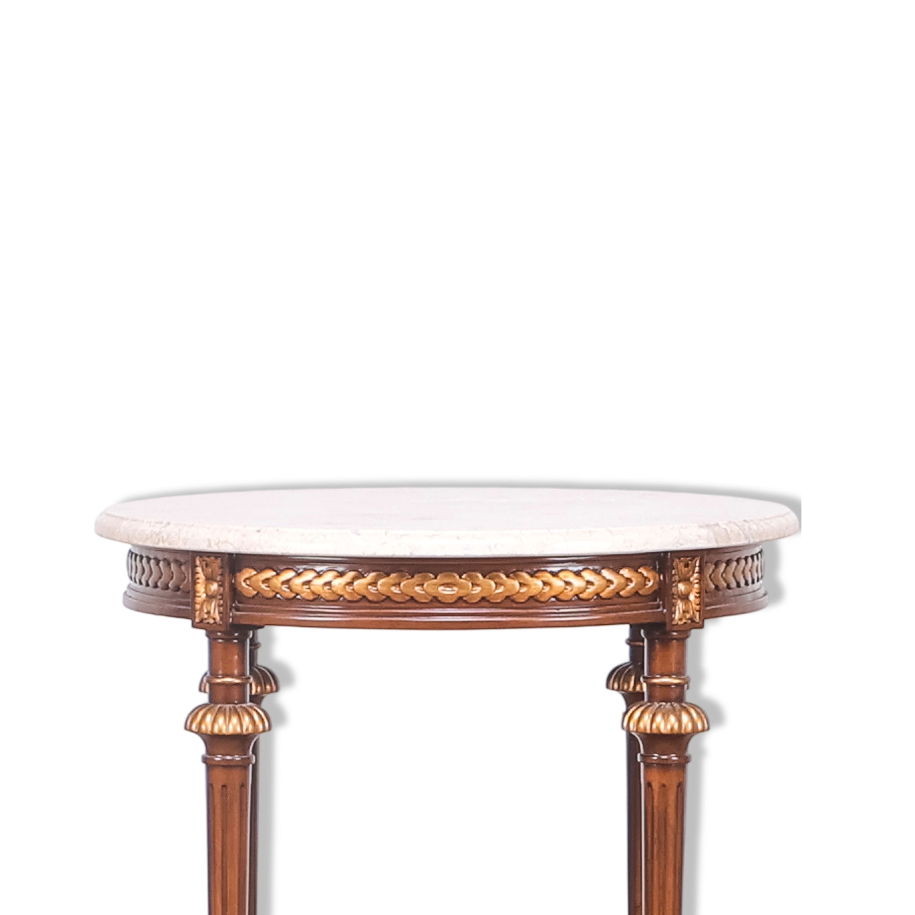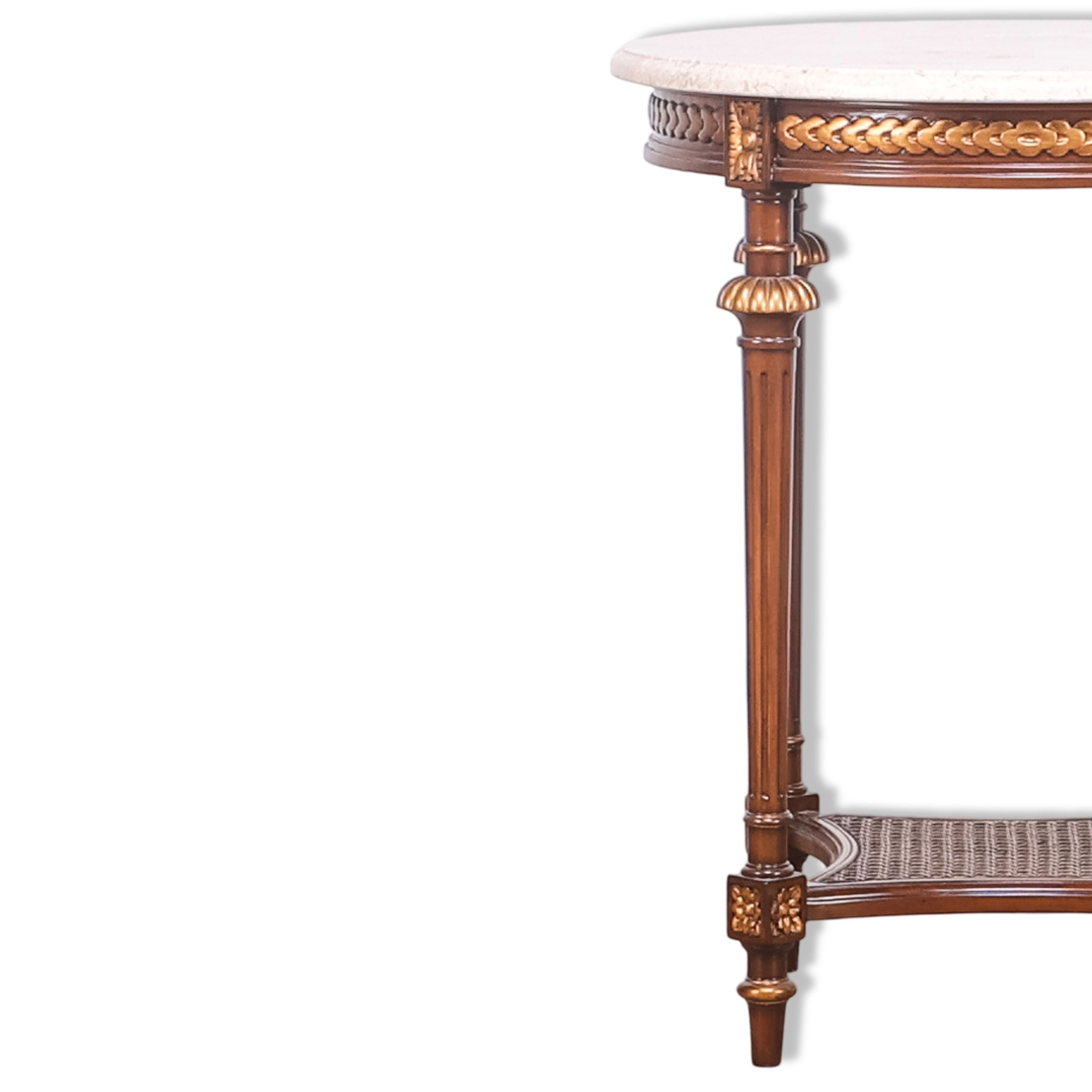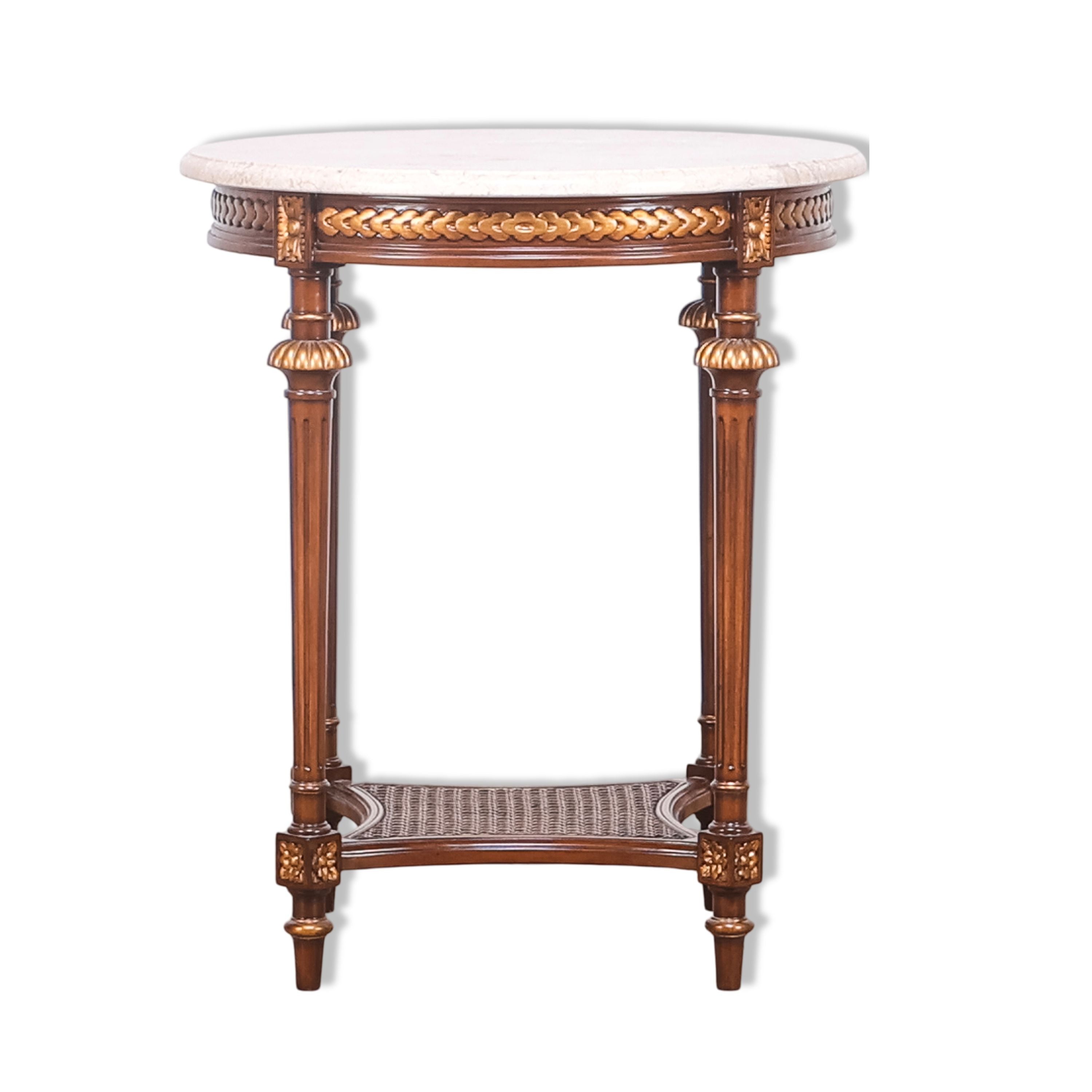 طاولة جانبية مستديرة أنيقة بسطح حجري كريمي، ومئزر مذهب بنقشة شريطية، وأرجل مزخرفة. الرف السفلي المصنوع من القصب يُضفي عمقًا ووظيفةً مميزة، مما يجعلها لمسةً راقيةً تُناسب الأجواء الكلاسيكية.