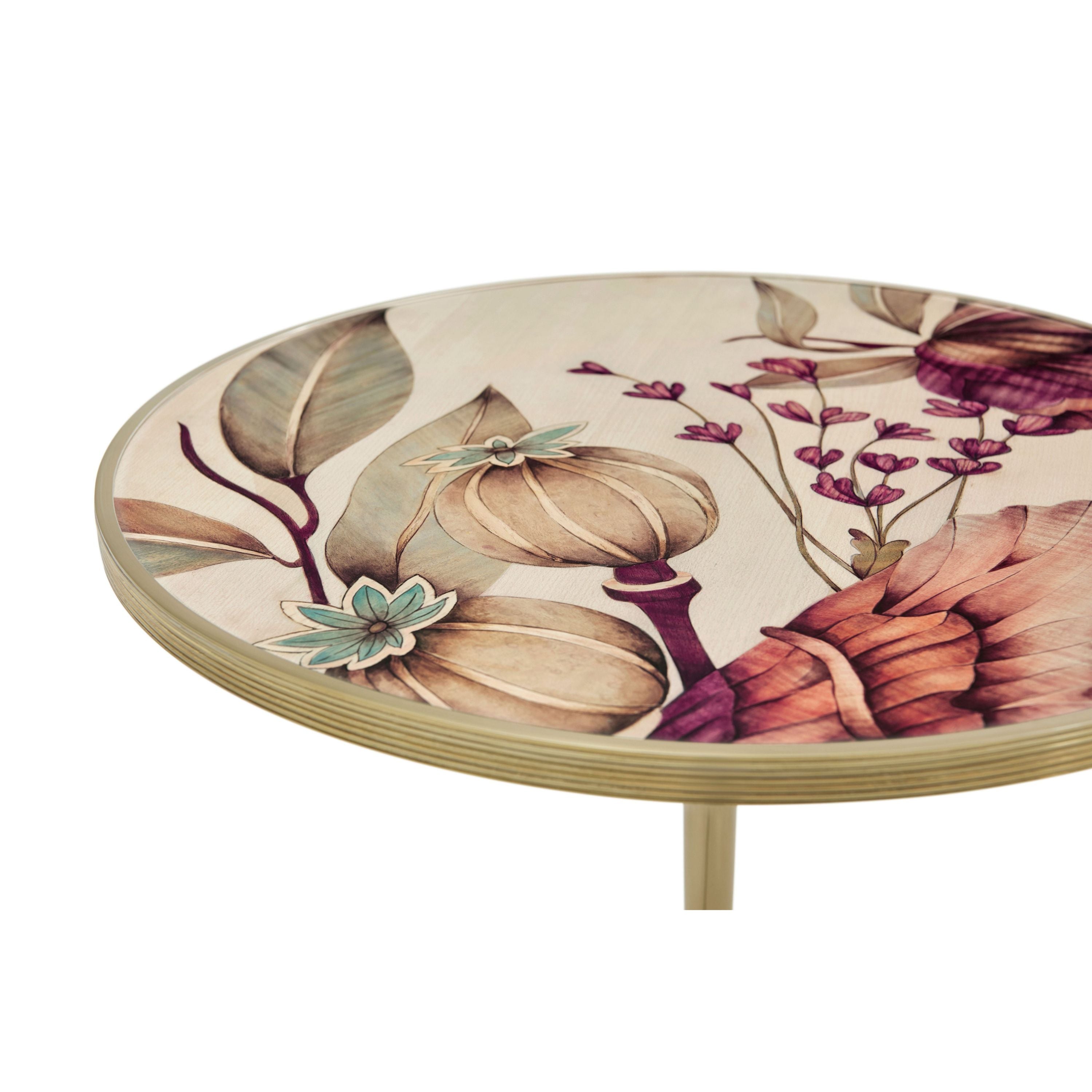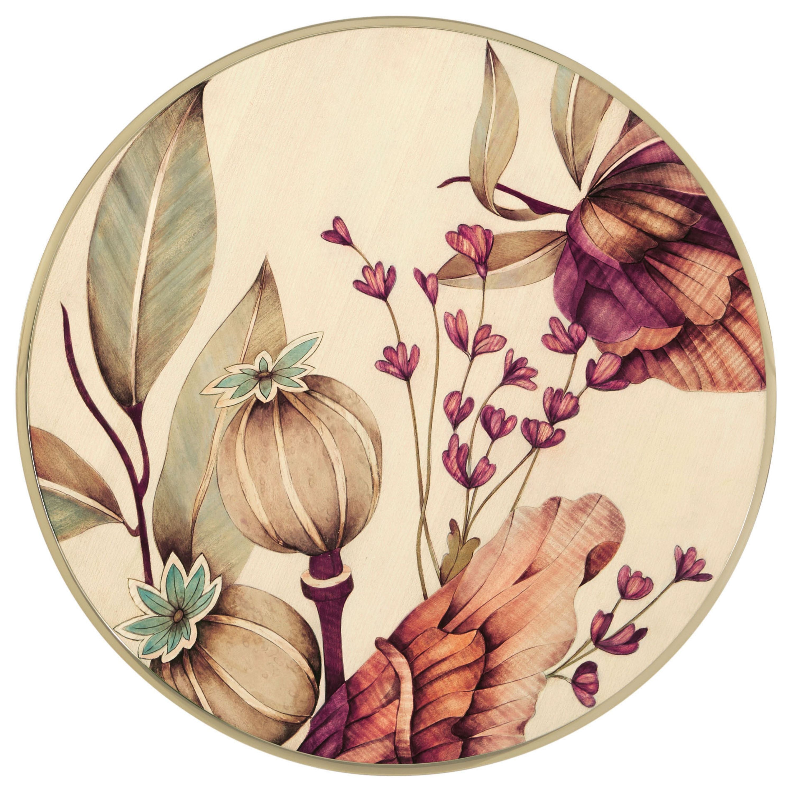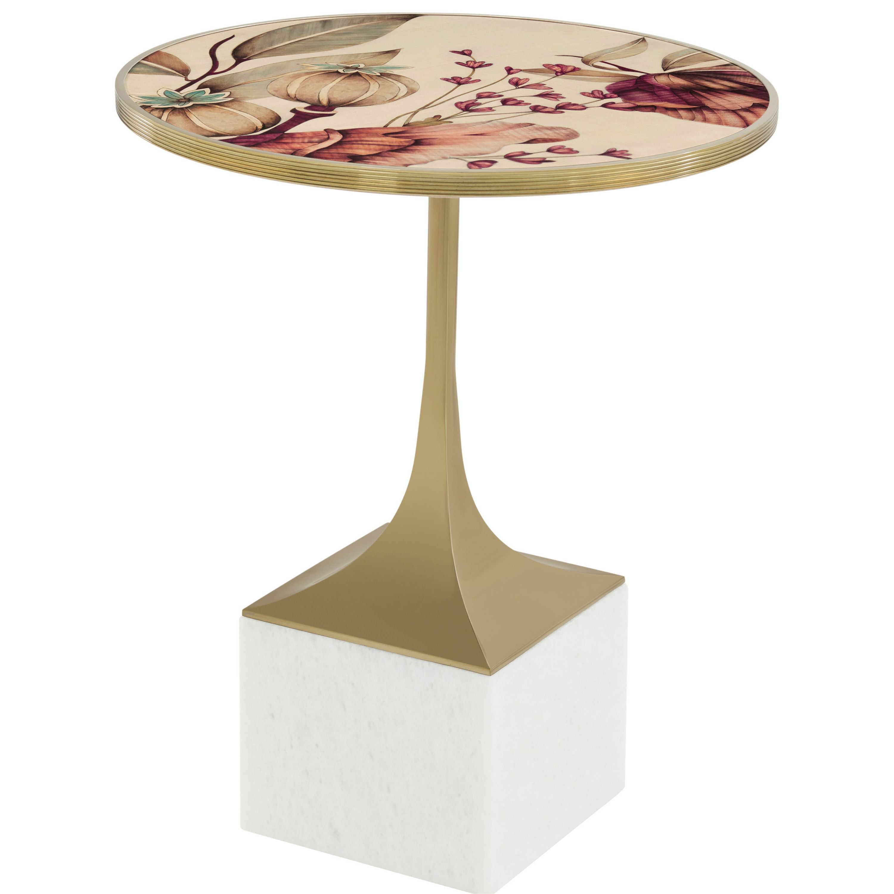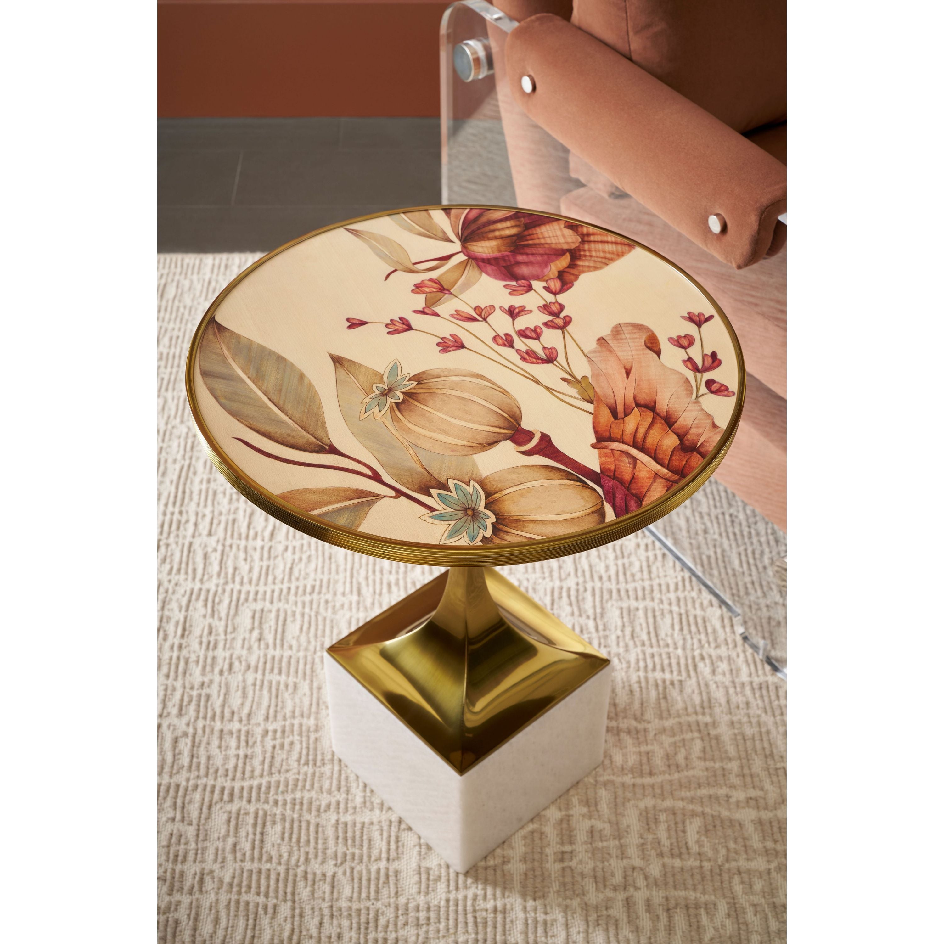 طاولة جانبية مزينة بباقة زهور تُضفي لمسةً فنيةً على الطاولة، مصنوعة من المعدن المصبوب يدويًا. سطحها مُطعّم بالقشرة. قاعدتها مطلية بالبرونز. يتميز الرخام بتنوعات طبيعية، وقد يختلف شكله من قطعة لأخرى.