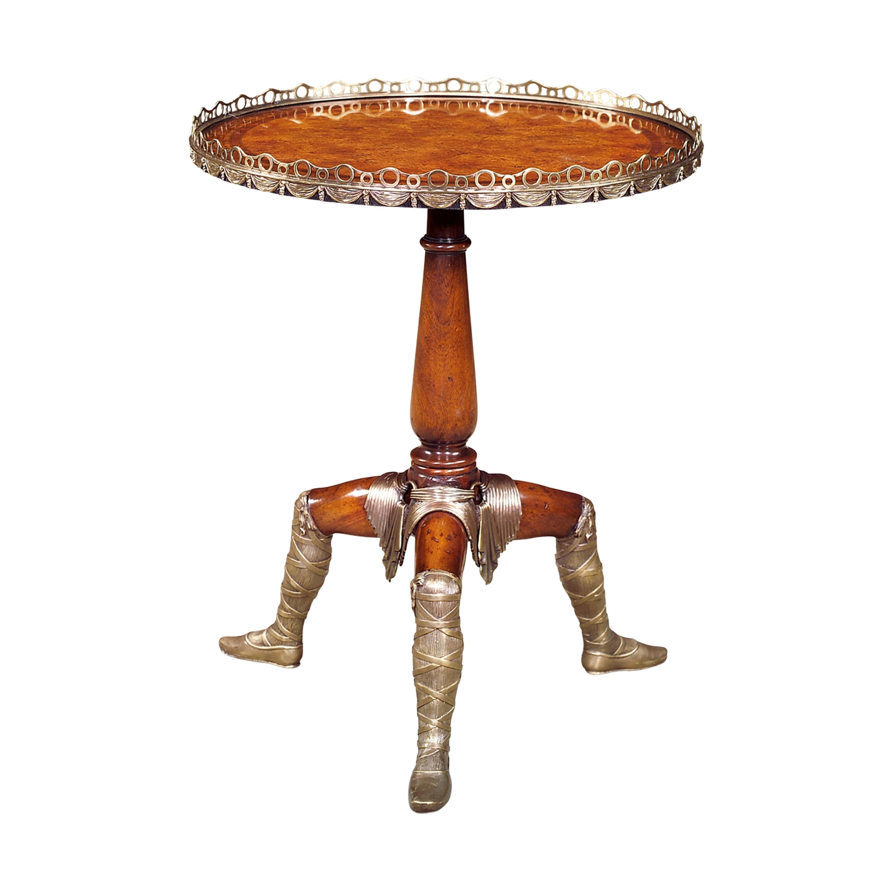 طاولة ثلاثية القوائم رائعة ونادرة للغاية مصنوعة من خشب المانكس المقطوع وخشب الماهوجني، ذات سطح دائري مع معرض نحاسي مصبوب مزخرف بشكل جيد مدعوم على عمود مدور بأرجل راقصة باليه غير عادية مع ركبتين مثنيتين وحوامل نحاسية مصبوبة بشكل جيد وأقدام أحذية مربوطة.