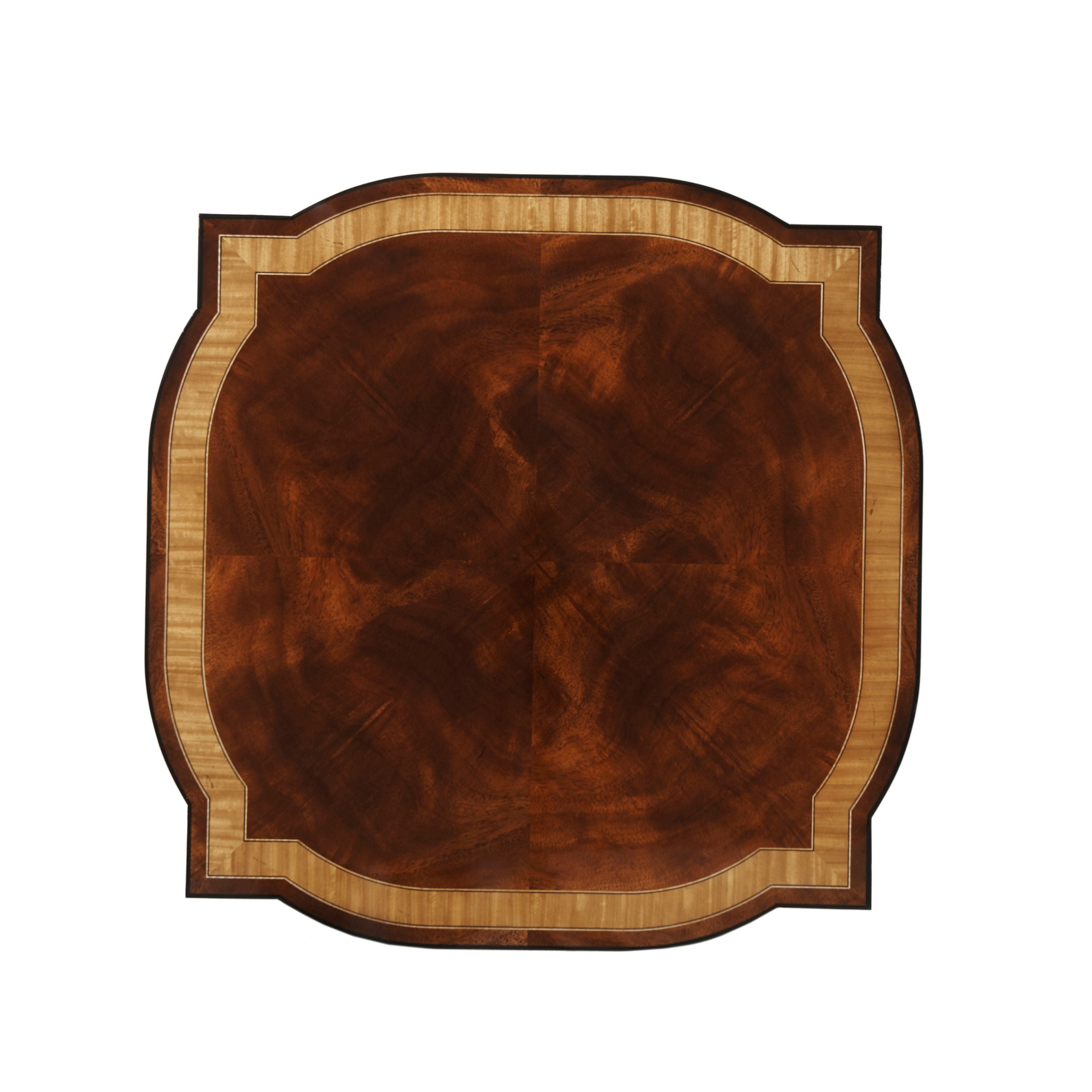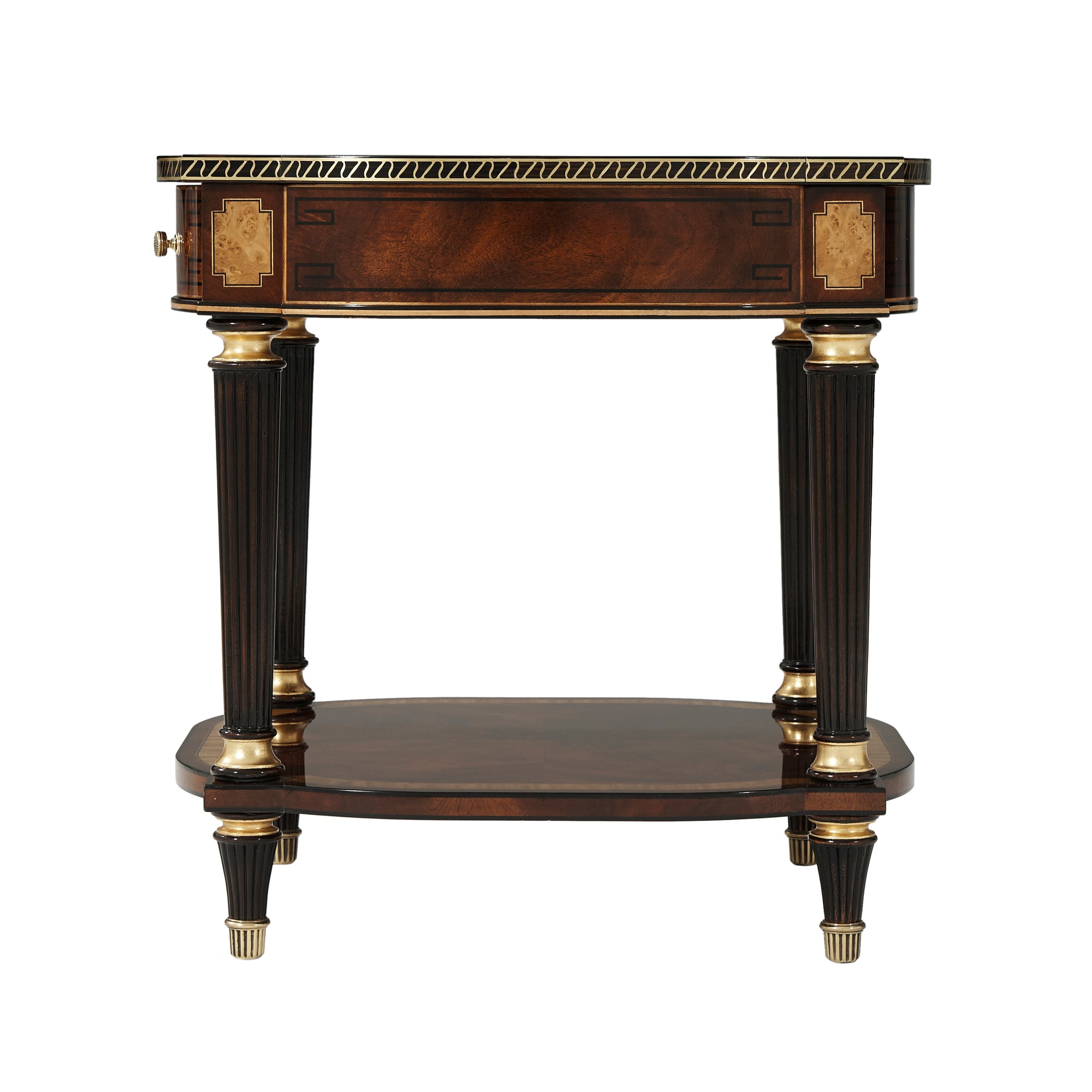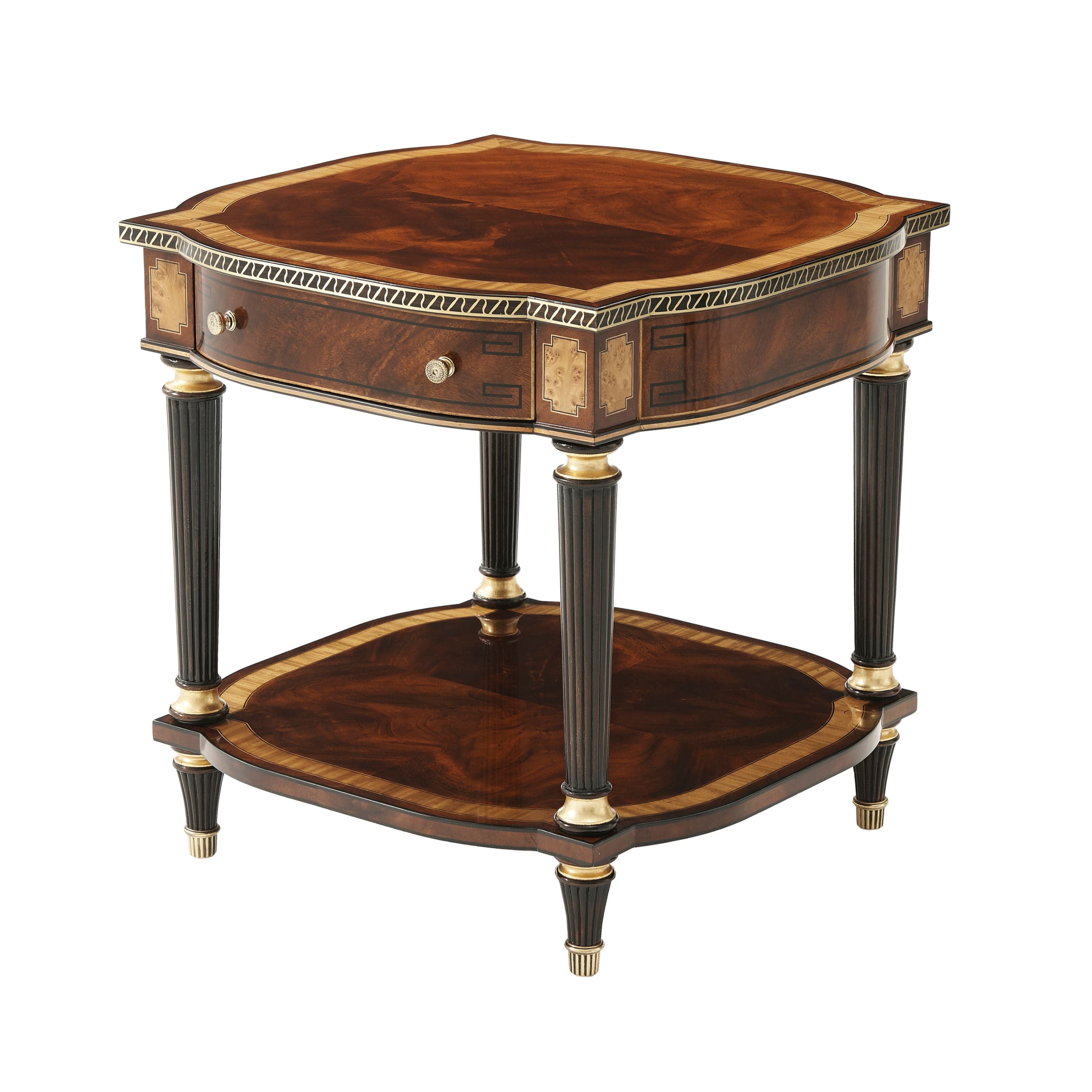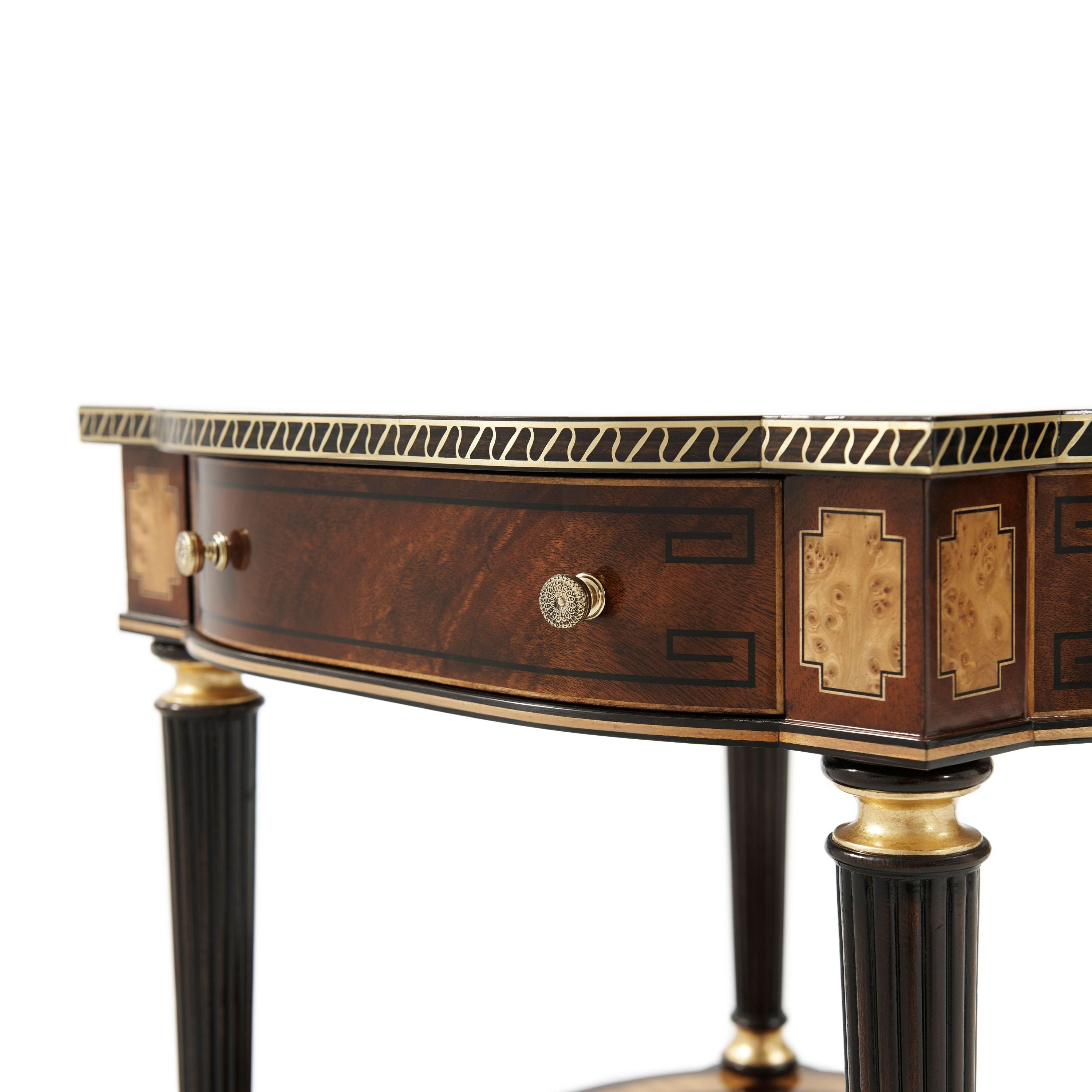 طاولة مميزة مصنوعة من خشب الماهوجني المكسو بخشب الساتان، وجوانبها الأمامية المقوسة ذات حافة مطعمة بالنحاس فوق درج إفريز وألواح زاوية مكسوة بقشرة من خشب الطقسوس، على دعامات مضلعة متصلة بطبقة سفلية من خشب الماهوجني المكسو بخشب الساتان، على أقدام خشبية مزخرفة بأغطية نحاسية.