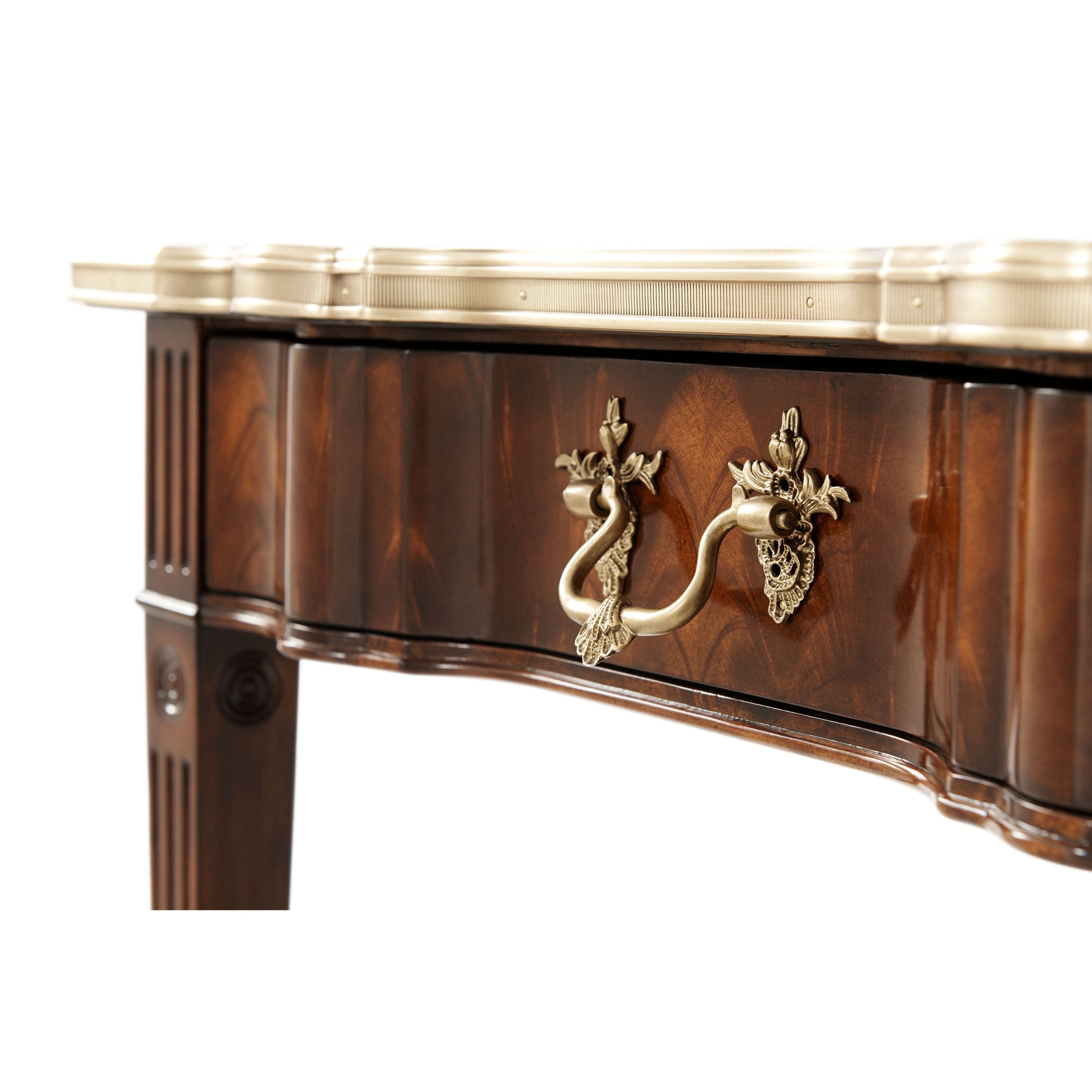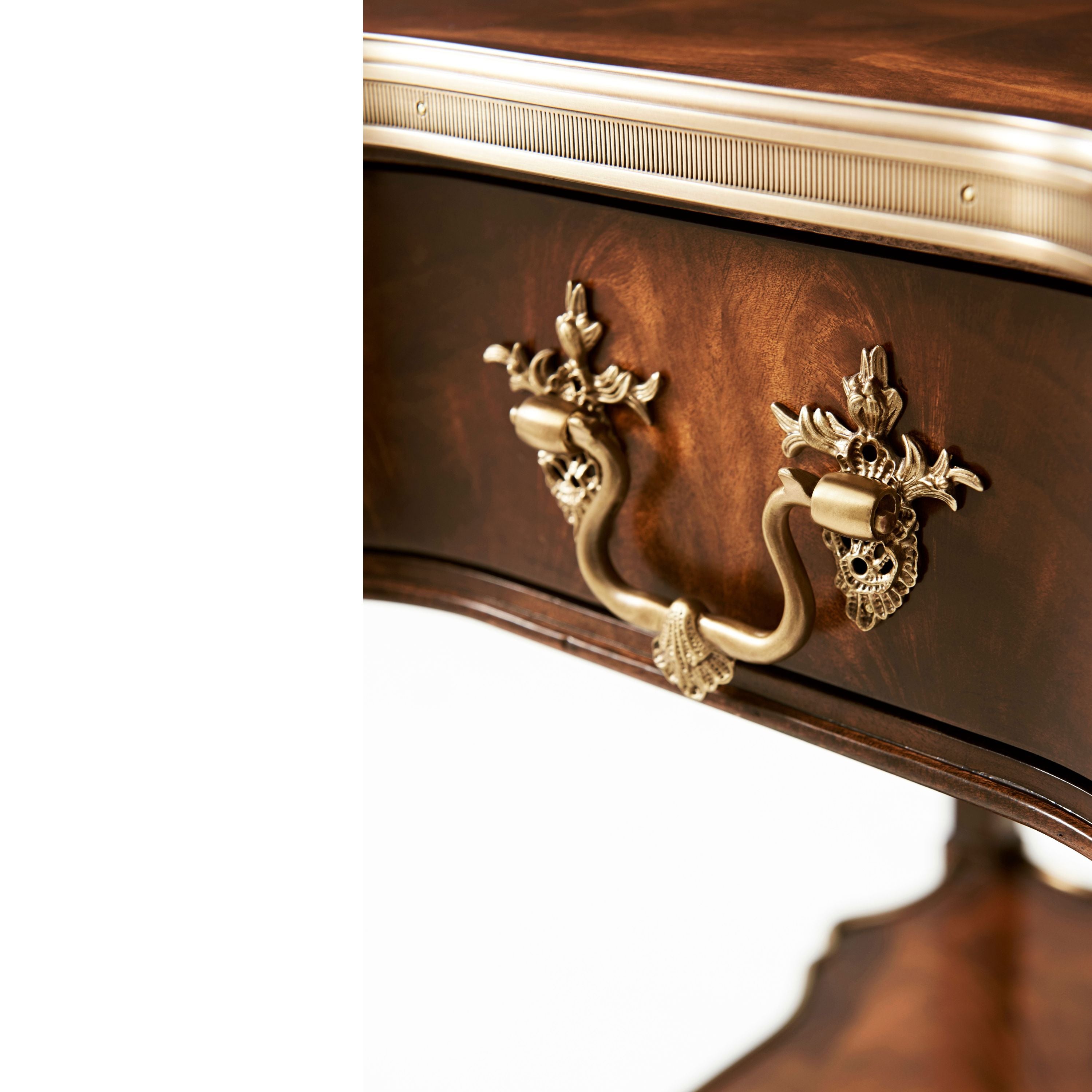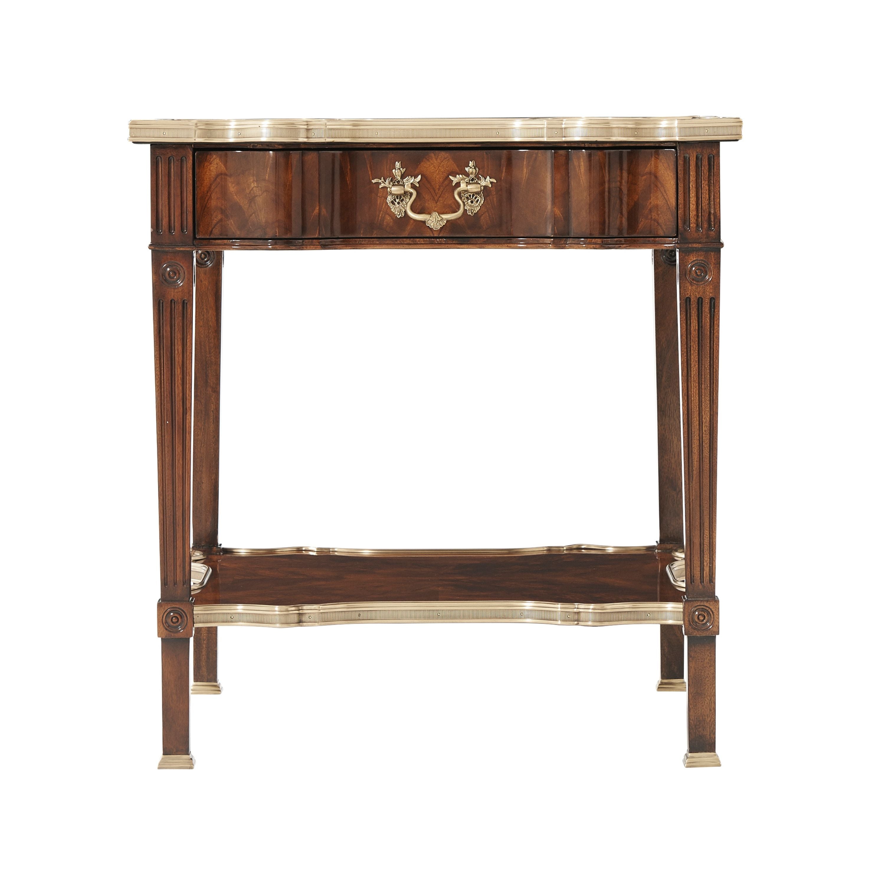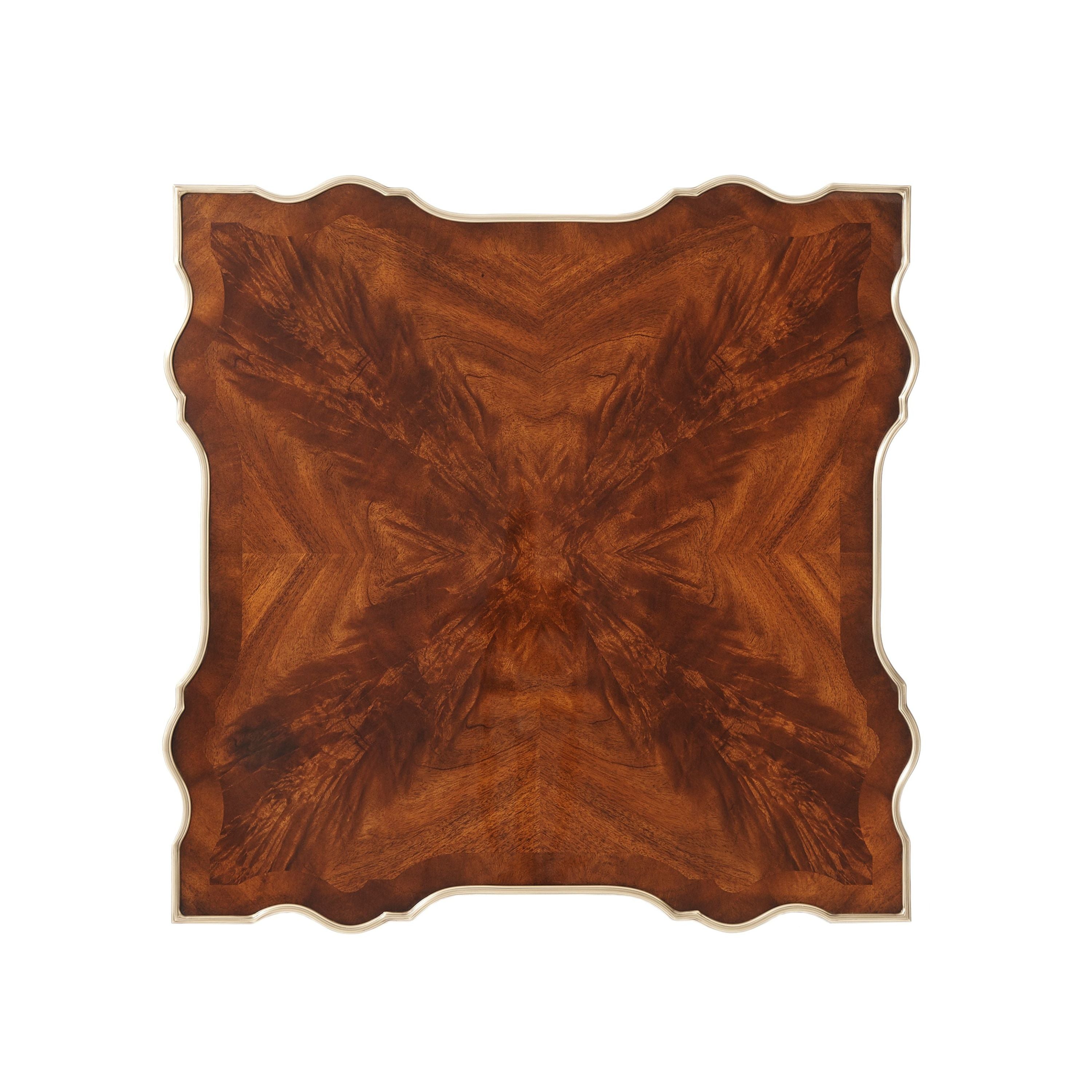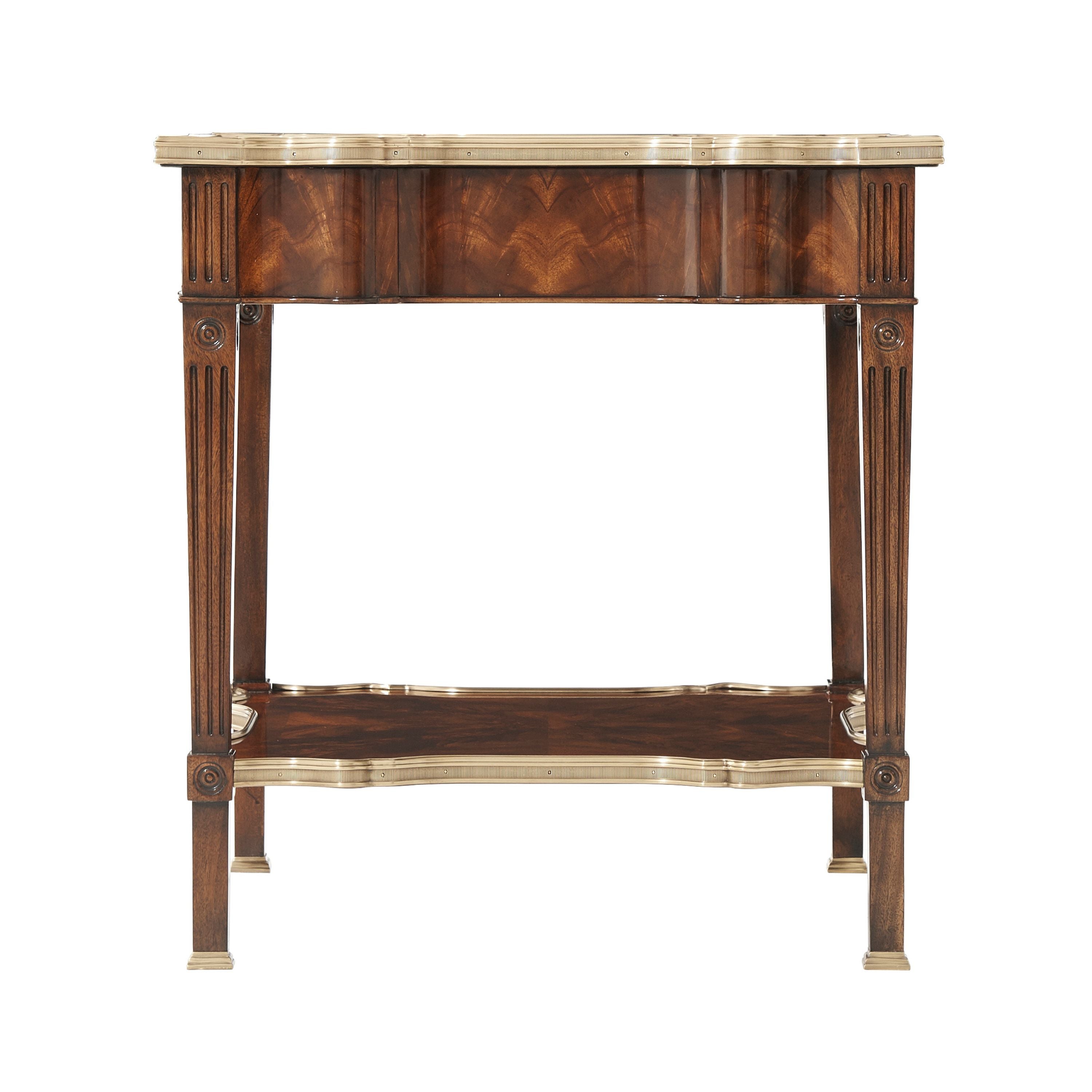 طاولة مصباح مصنوعة من خشب الماهوجني الصلب ومغطاة بقشرة من اللهب، ذات سطح مربع على شكل ثعبان محاط بالنحاس فوق درج إفريز على شكل مربع مع مقبض روكاي من النحاس المصبوب بدقة، على أرجل مربعة الشكل مدببة ومزخرفة بأشكال دائرية ومتصلة بطبقة سفلية محاطة بالنحاس على شكل ثعبان.