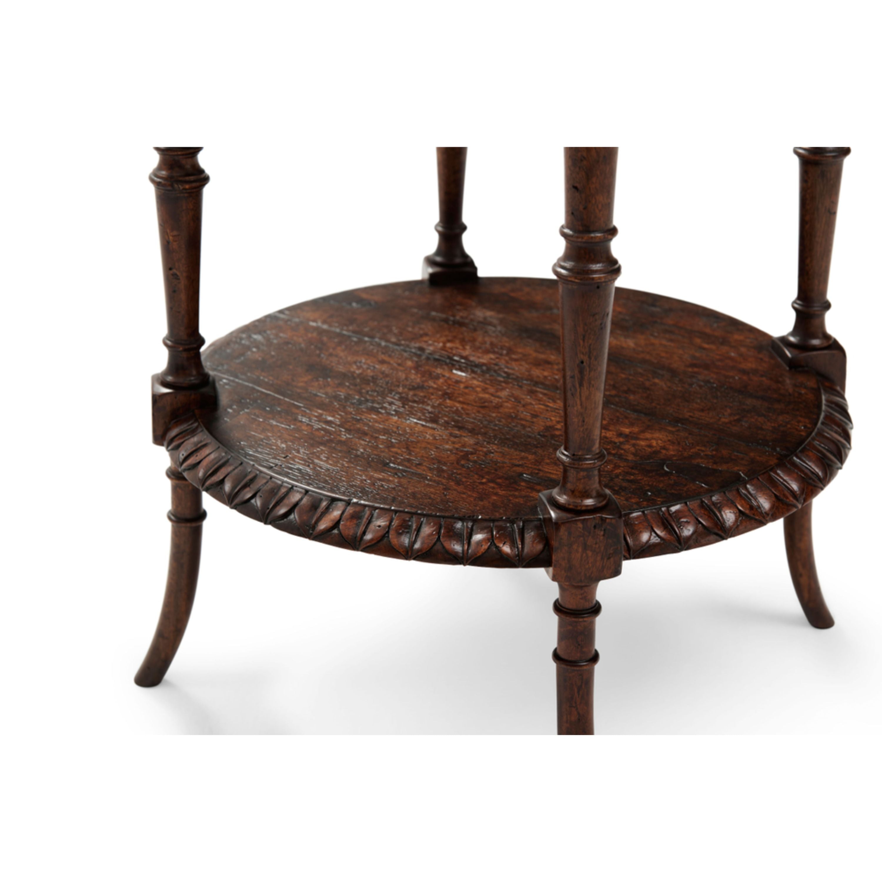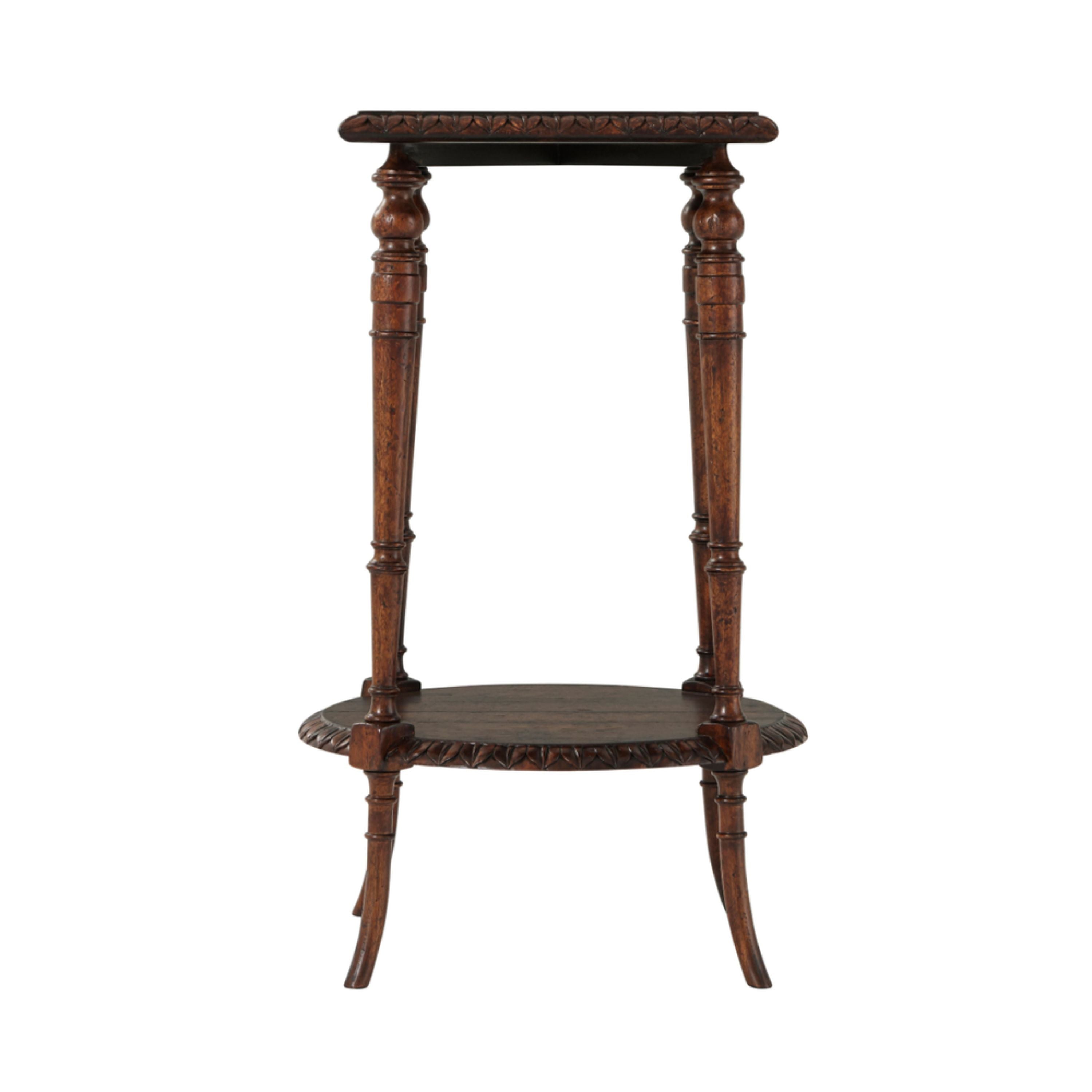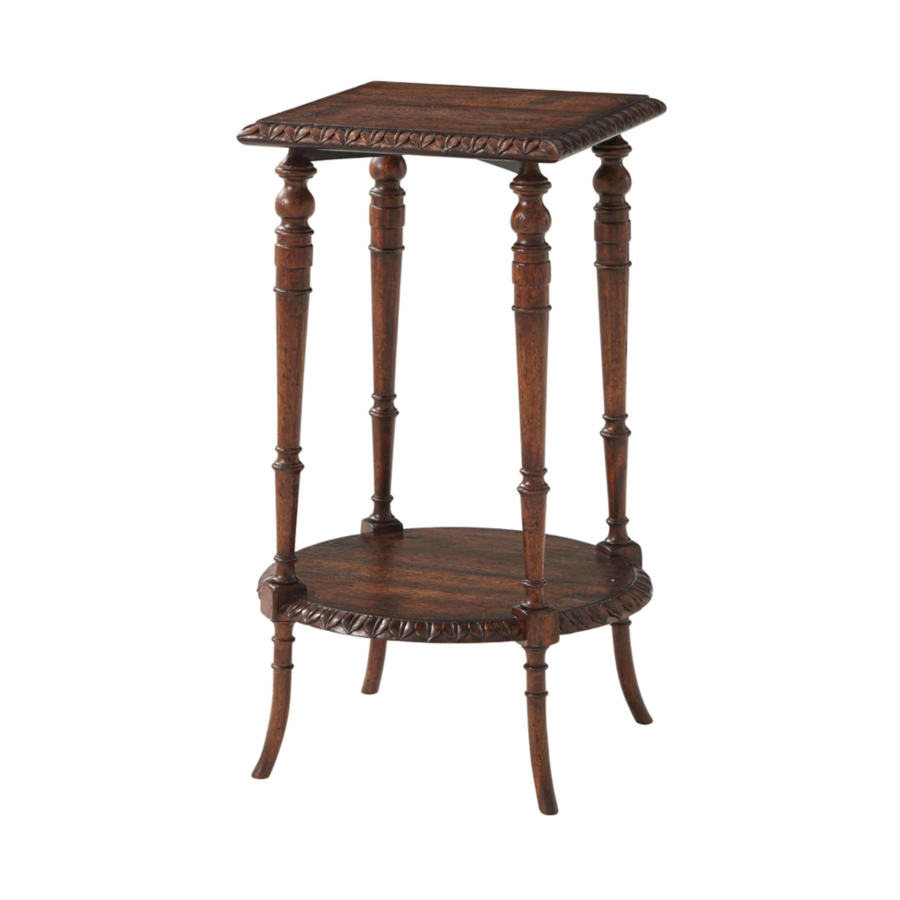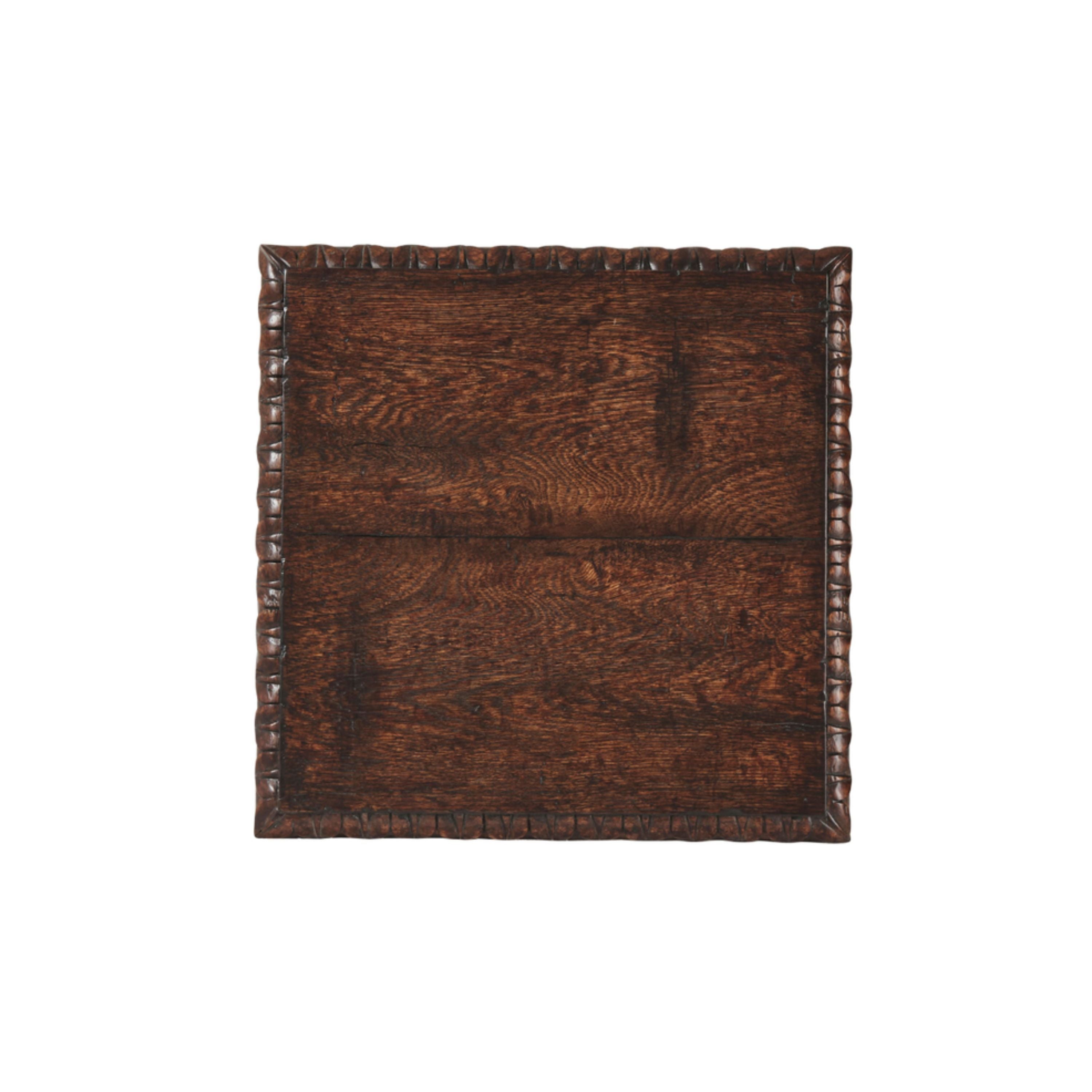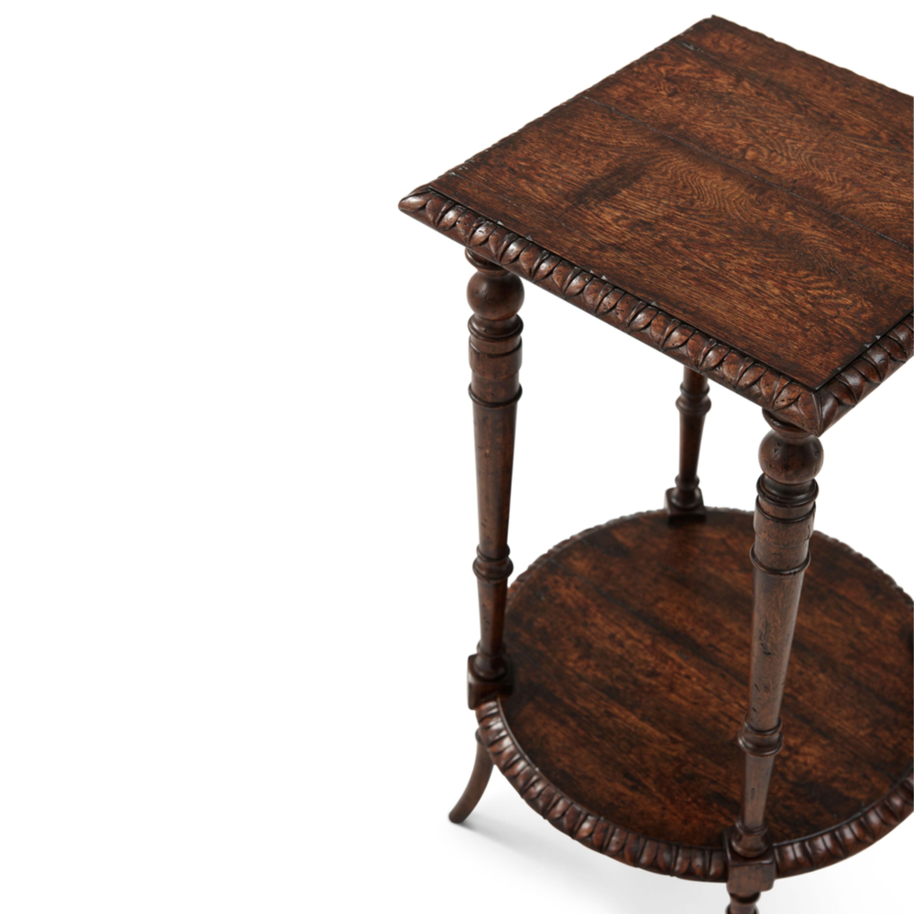 طاولة جانبية من خشب البلوط الريفي تتميز بجزء علوي مربع الشكل منحوت على شكل أوراق ورف دائري منحوت على شكل أوراق متصل بأربعة أرجل دائرية.