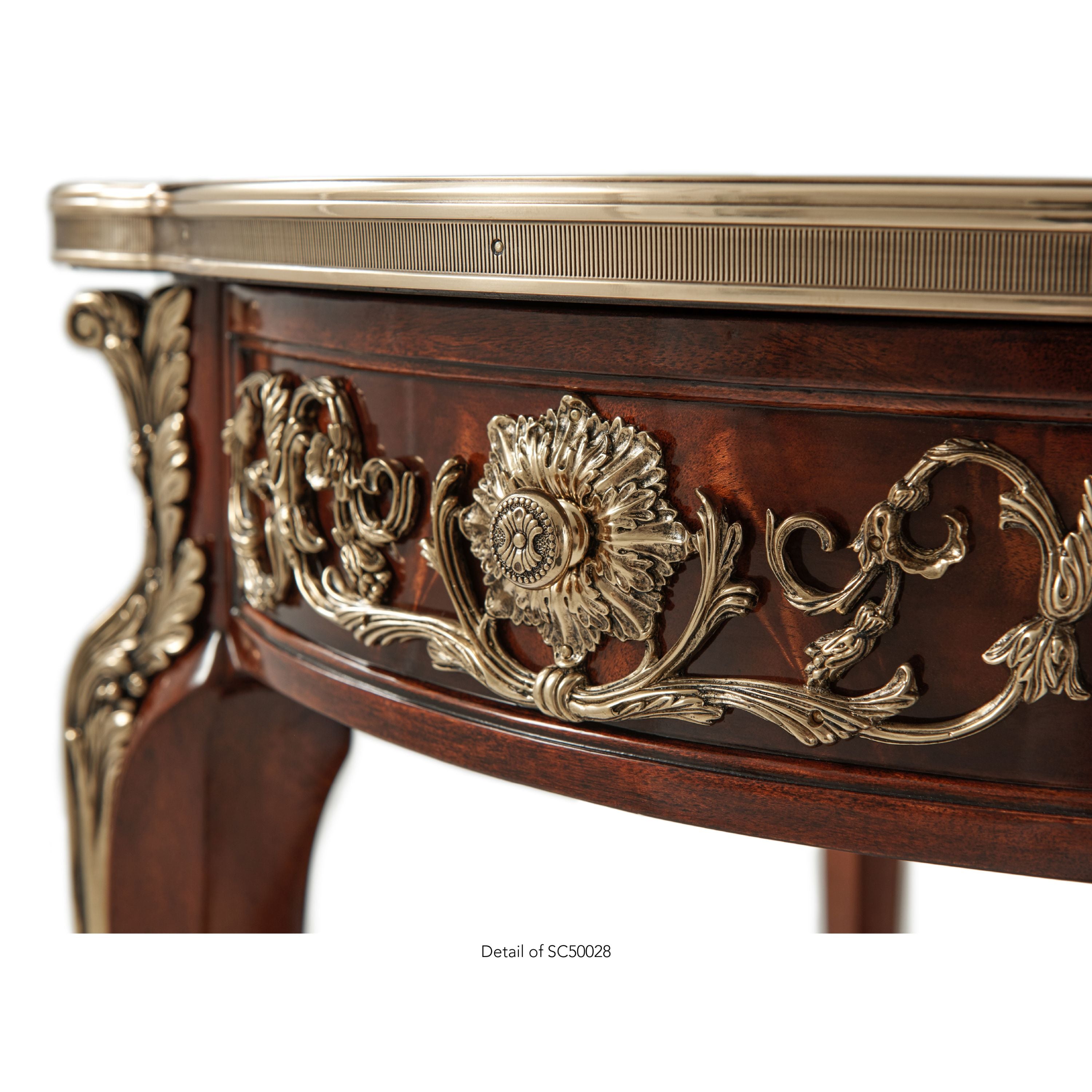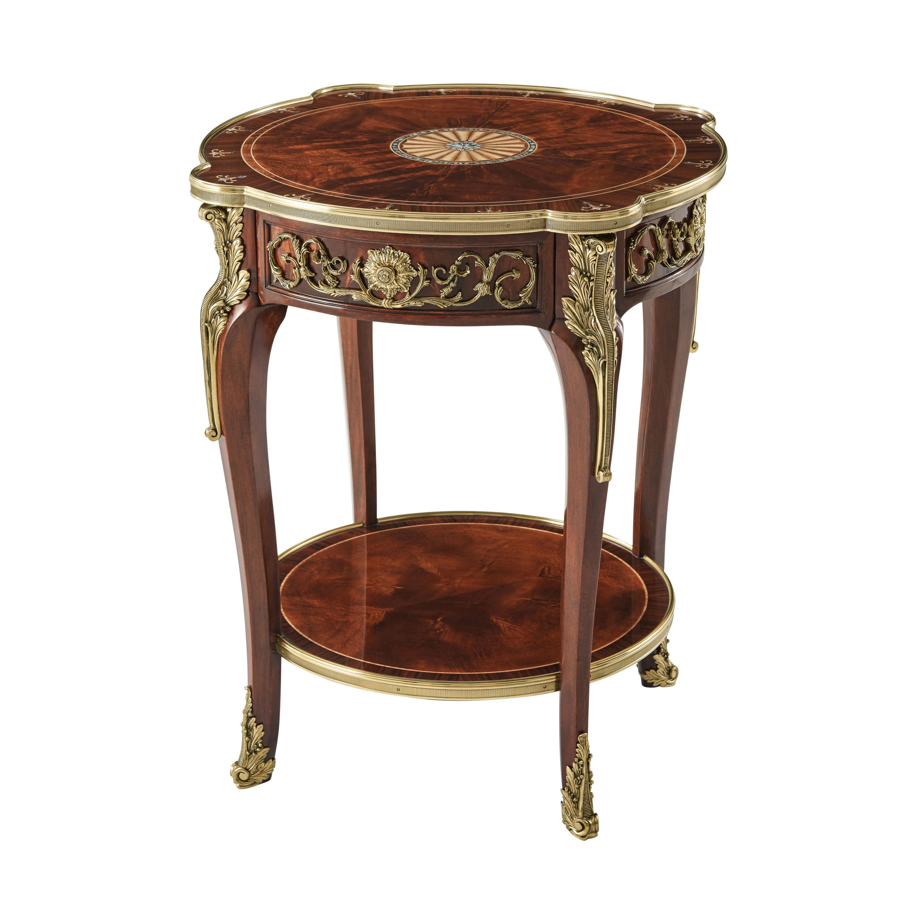 طاولة جانبية مصنوعة من خشب الماهوجني المشتعل وخشب المورادو مع تطعيمات مروحية وخطوط نحاسية وتطعيمات من عرق اللؤلؤ، وسطح دائري من النحاس الأصفر على الطراز الإنجليزي القديم مع زوايا مفصصة، فوق إفريز من النحاس المصبوب على شكل لفافة من نبات الأقنثة مع درج واحد، على أرجل من النحاس المصبوب مغطاة بغطاء من نبات الأقنثة مع أقدام مصبوبة على شكل لفافة ومتصلة بطبقة سفلية محاطة بالنحاس ومغطاة بالقشرة.