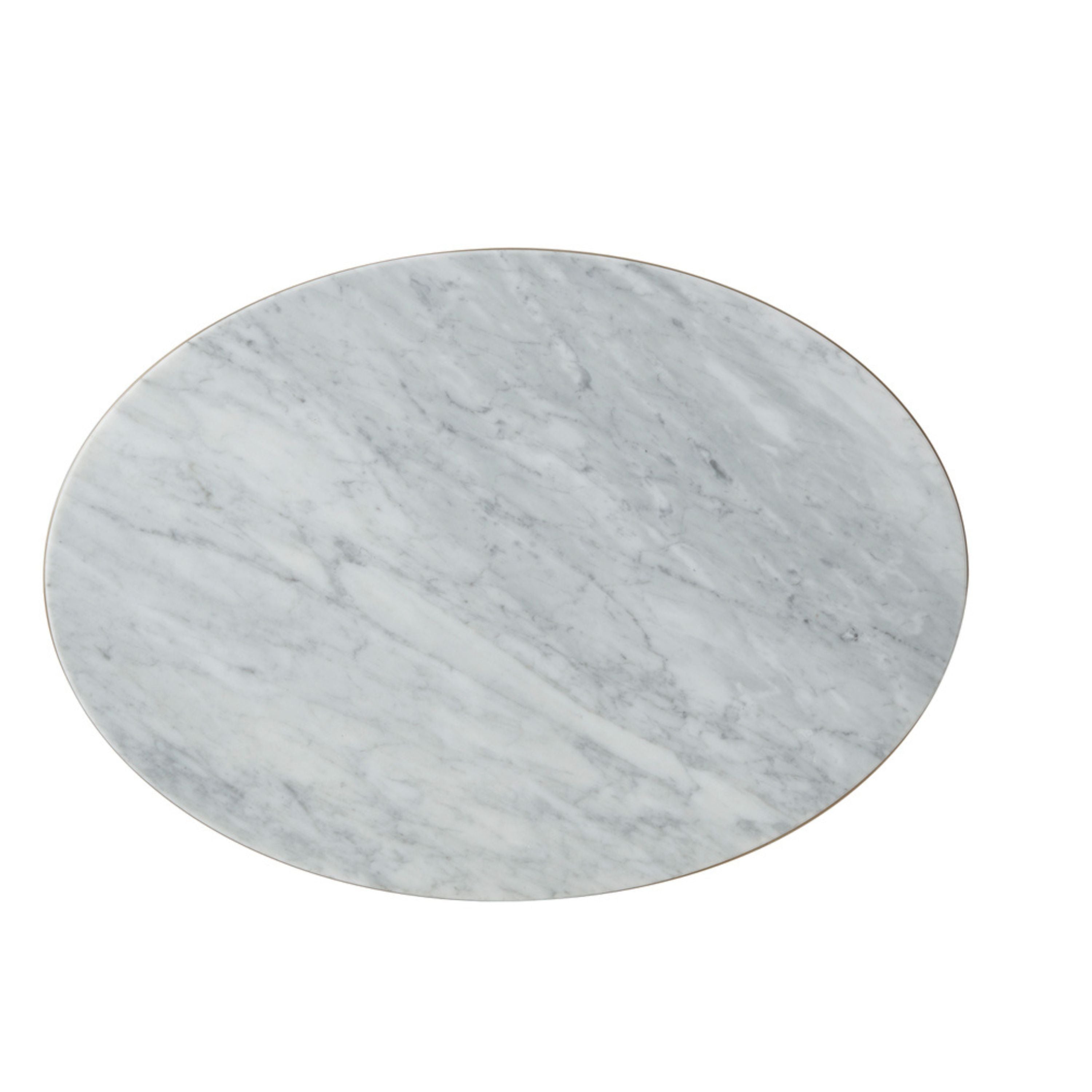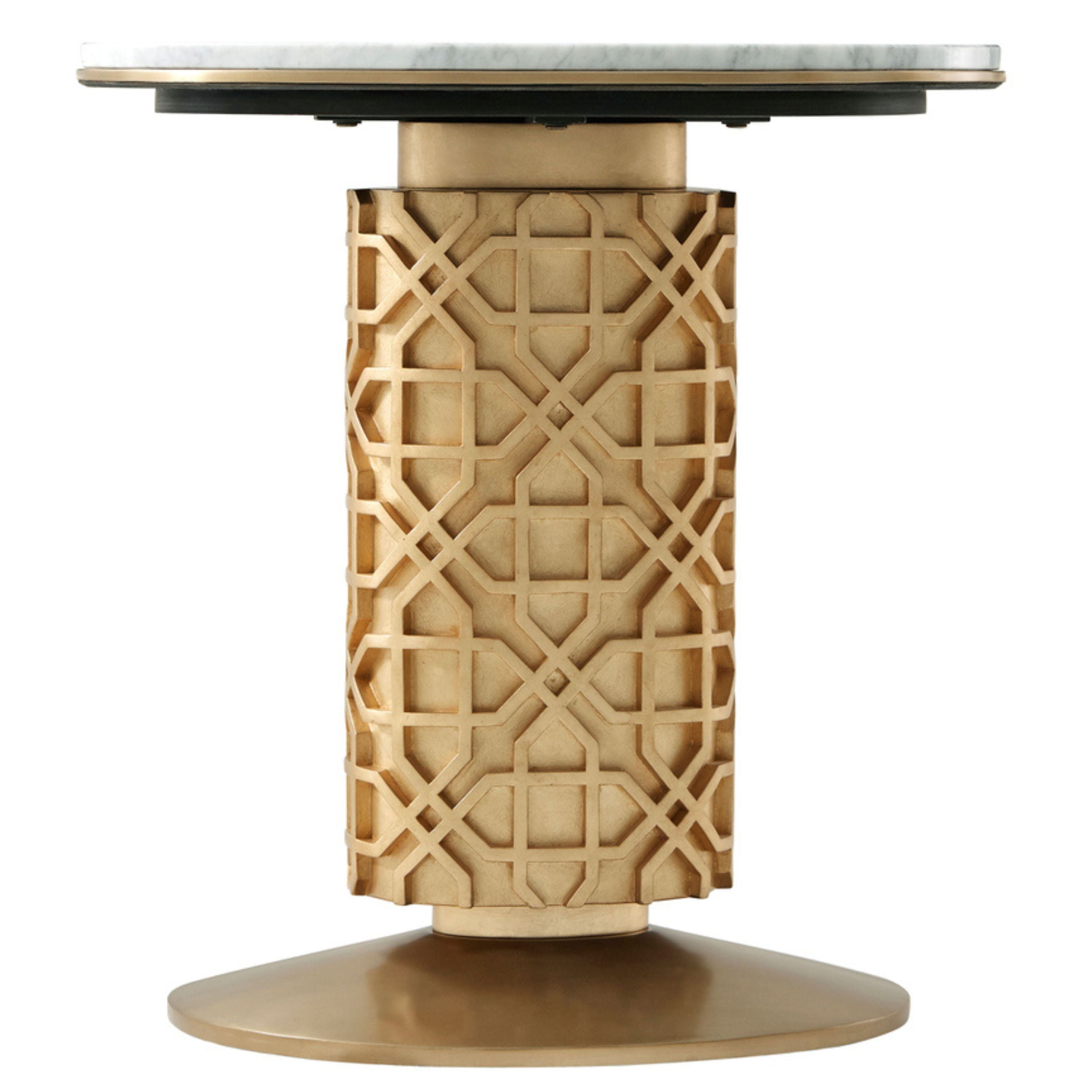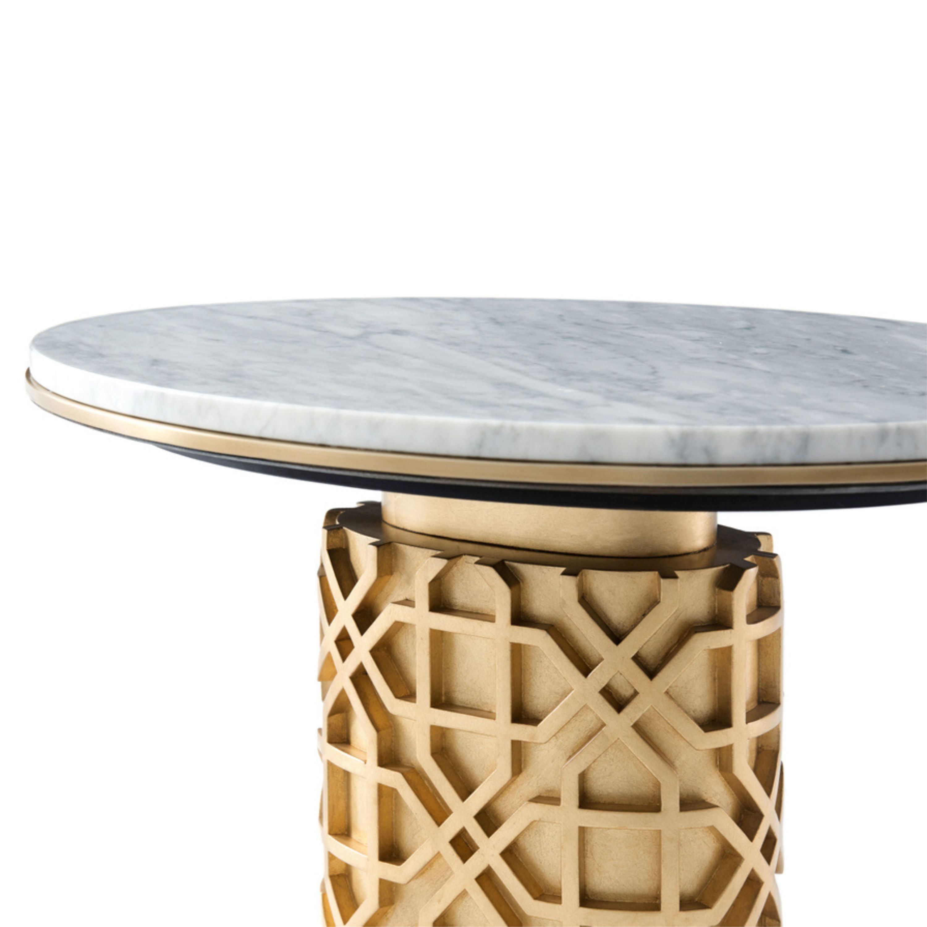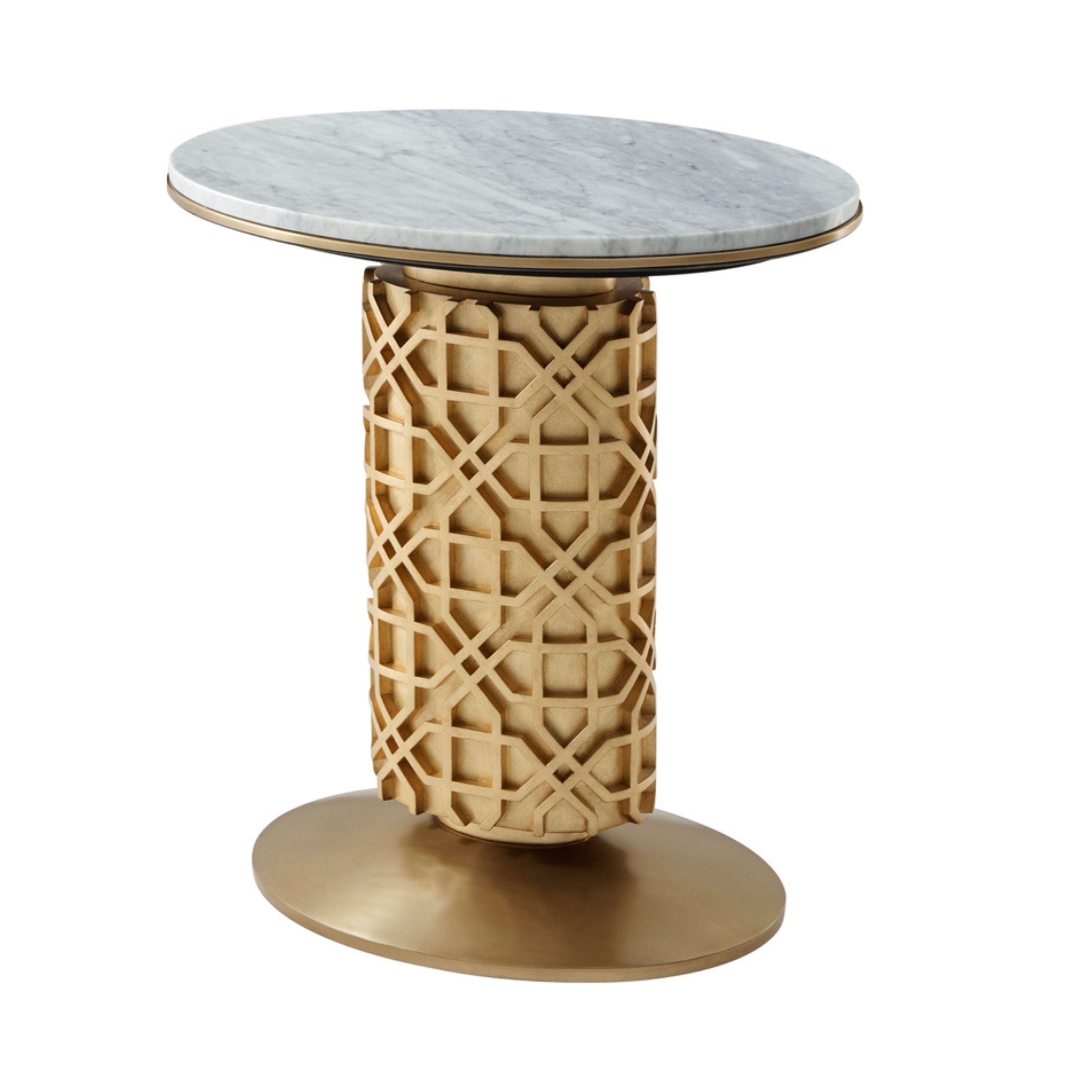 طاولة جانبية بيضاوية، مصنوعة من رخام بيانكو كارارا مع تفاصيل صب على عمود بارز مطلي بالذهب من نجوم شبكية مستوحاة من العصر المغولي، على قاعدة معدنية على شكل قرص بيضاوي مقبب.