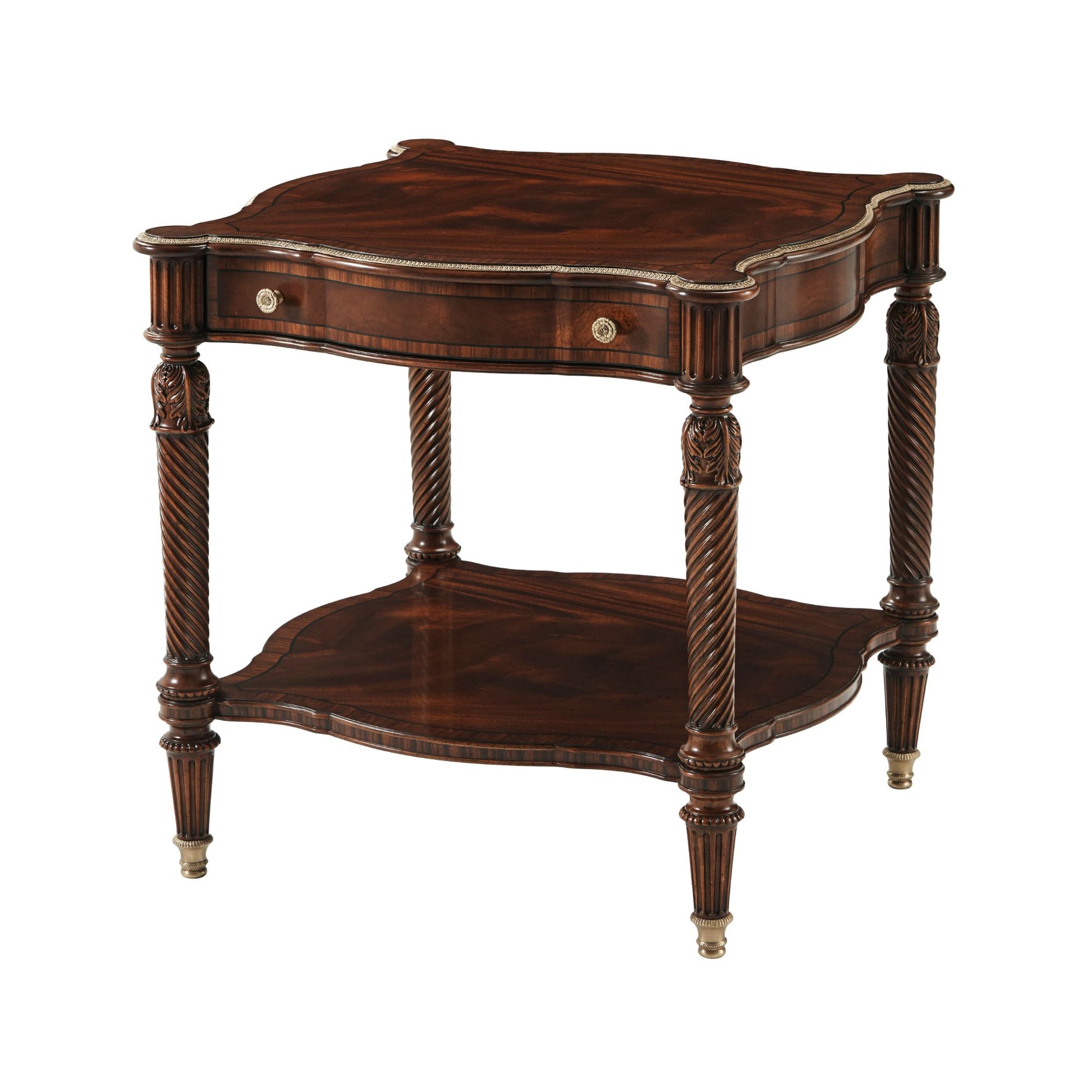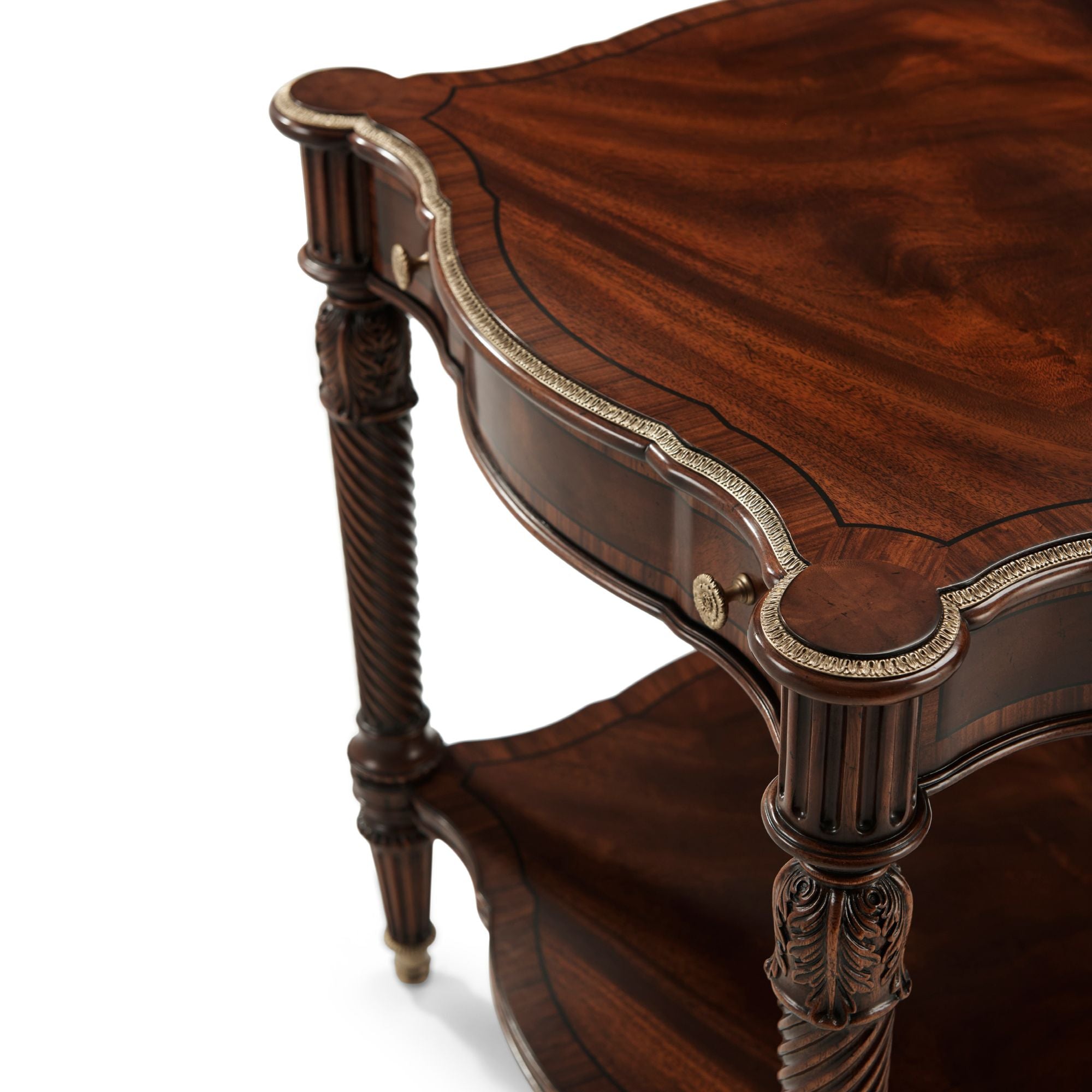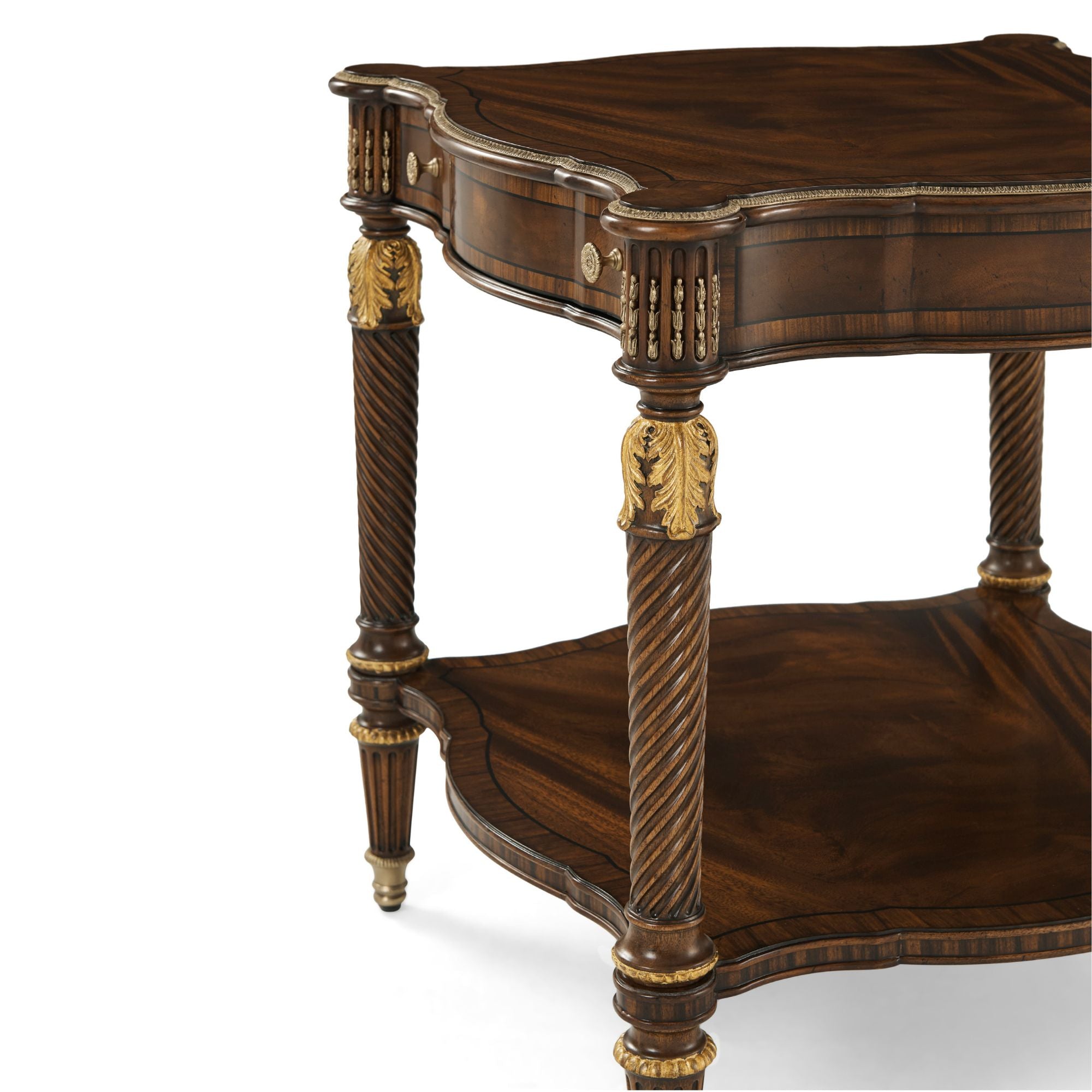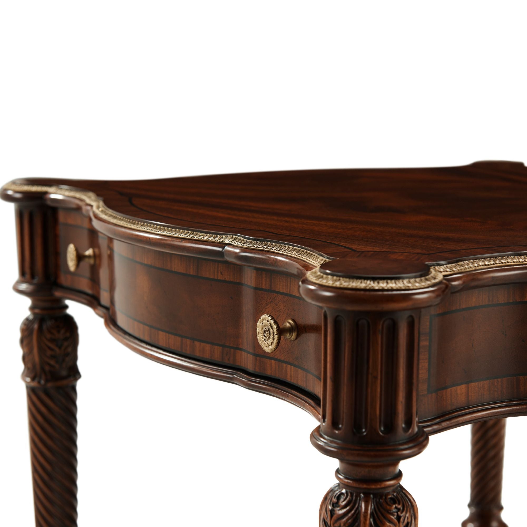 هذه الطاولة الجانبية الأنيقة والفخمة، المنحوتة يدويًا، مصممة بحواف متعرجة مزينة بتفاصيل نحاسية، فوق درج إفريز مزخرف بخطوط، مع سطح مزخرف فوق أرجل لولبية ملتوية رائعة منحوتة يدويًا، مستوحاة من أريكة في غرفة الرسم الجنوبية بمنزل ألثورب. أسفلها، ستجدون قاعدة سفلية مزخرفة بأرجل خشبية مزخرفة بأغطية نحاسية فاخرة. تظهر هنا بلمسة نهائية إنجليزية كلاسيكية مع تفاصيل ذهبية.