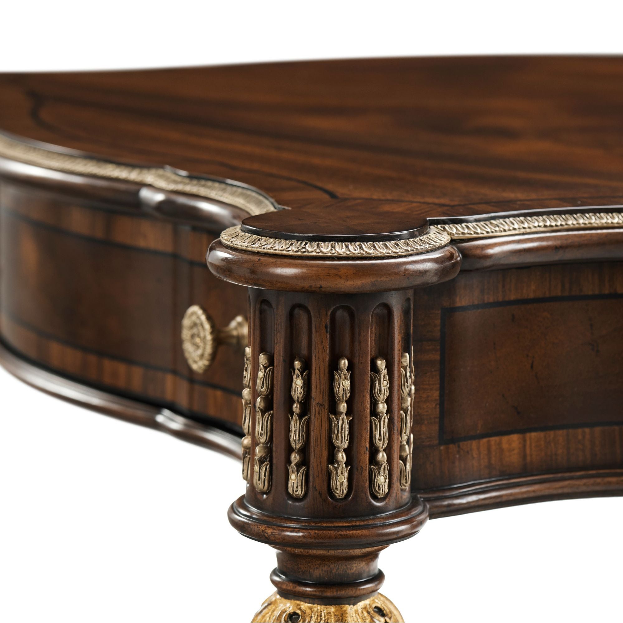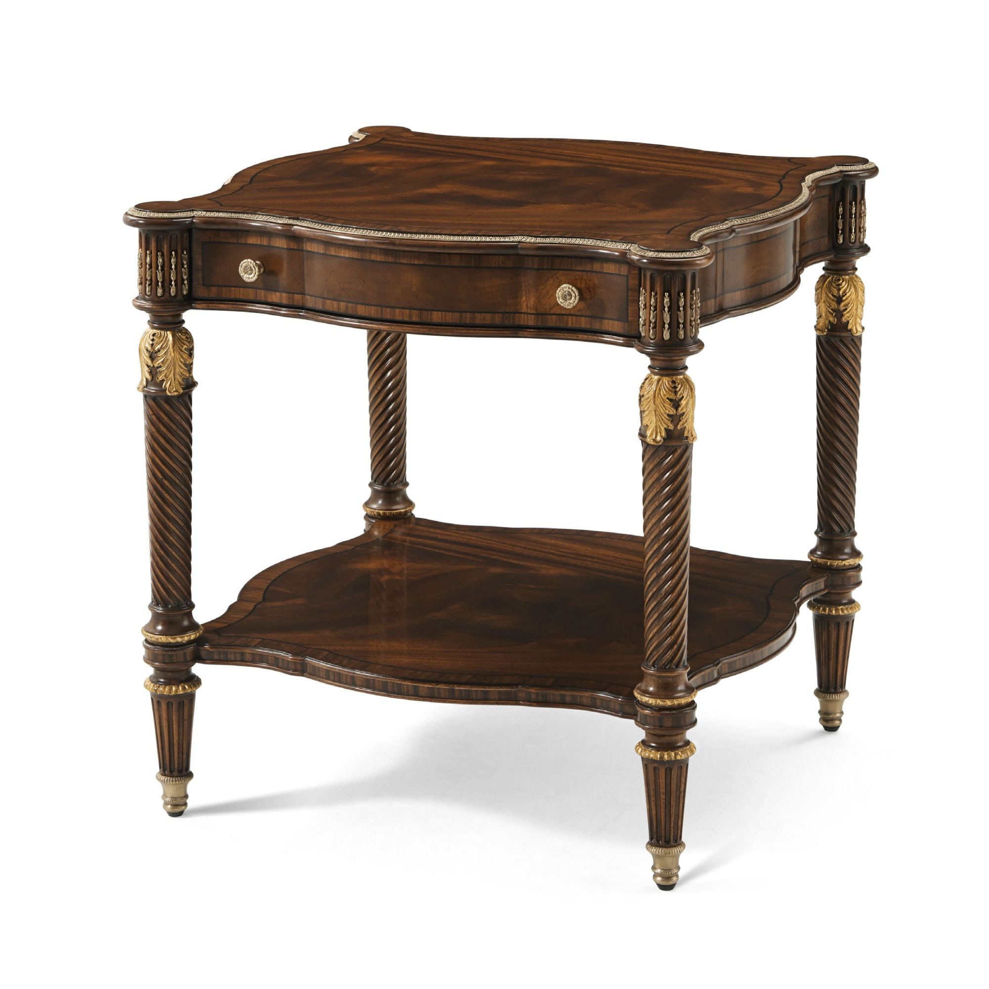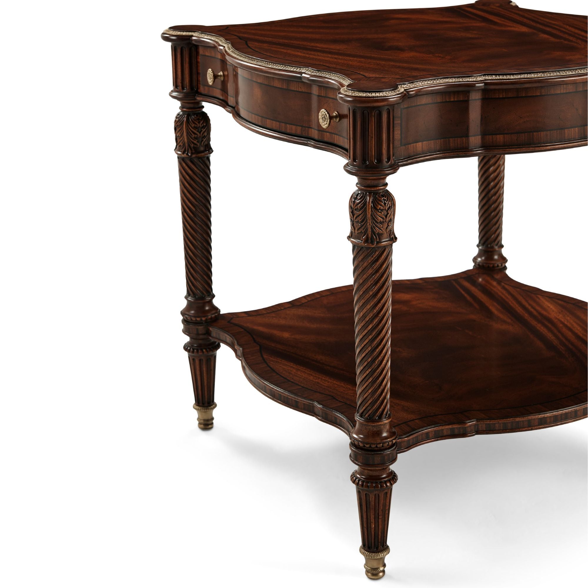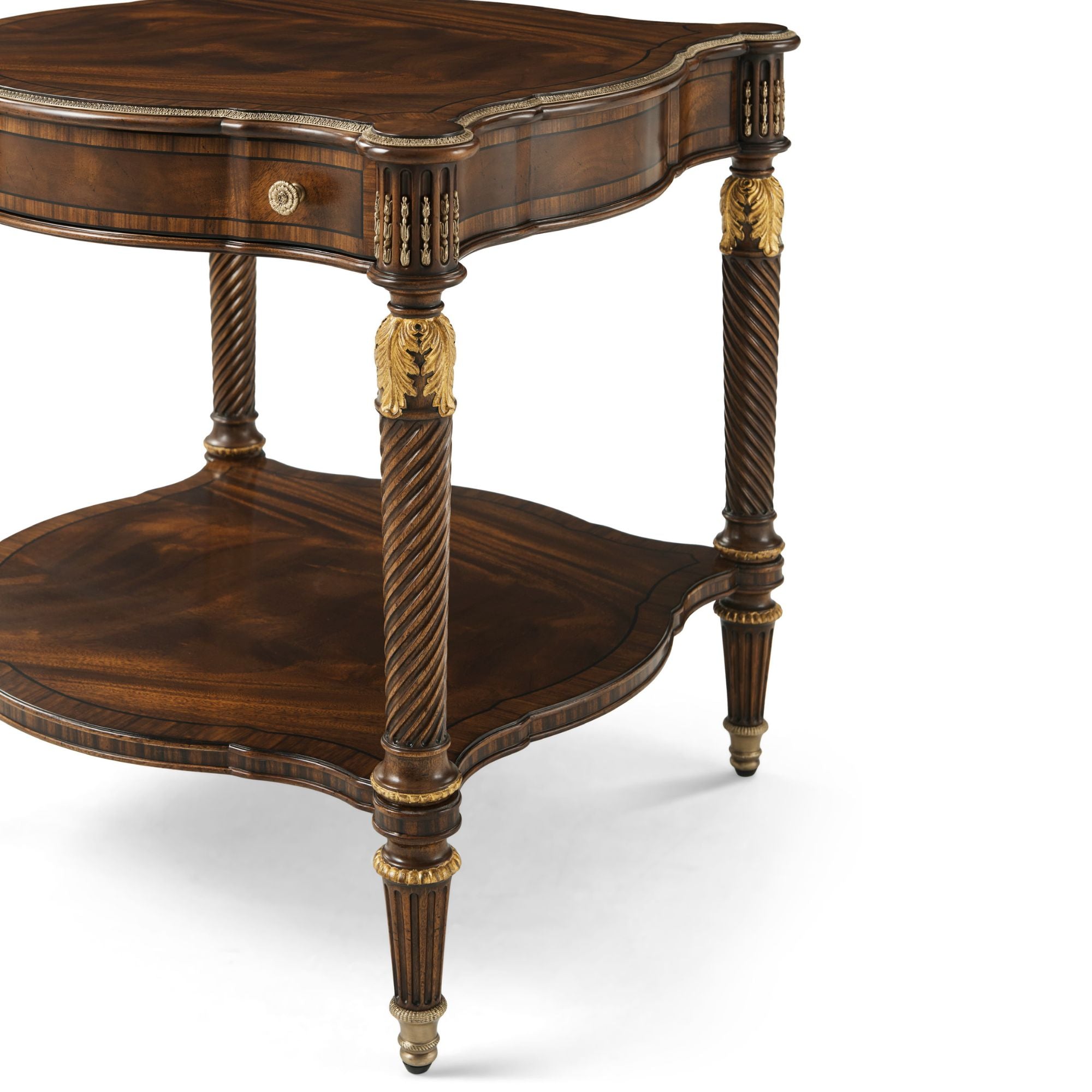هذه الطاولة الجانبية الأنيقة والفخمة، المنحوتة يدويًا، مصممة بحواف متعرجة مزينة بتفاصيل نحاسية، فوق درج إفريز مزخرف بخطوط، مع سطح مزخرف فوق أرجل لولبية ملتوية رائعة منحوتة يدويًا، مستوحاة من أريكة في غرفة الرسم الجنوبية بمنزل ألثورب. أسفلها، ستجدون قاعدة سفلية مزخرفة بأرجل خشبية مزخرفة بأغطية نحاسية فاخرة. تظهر هنا بلمسة نهائية إنجليزية كلاسيكية مع تفاصيل ذهبية.