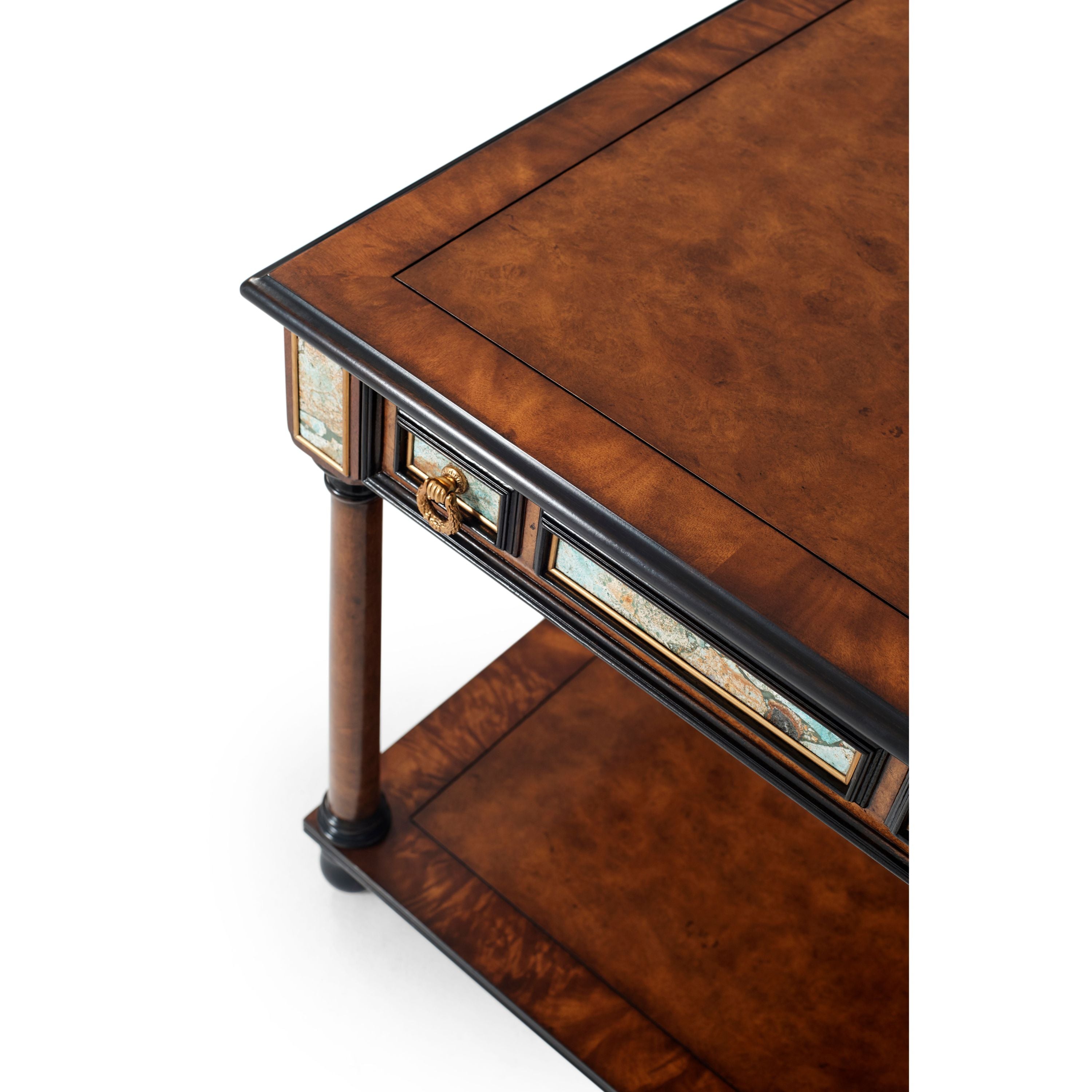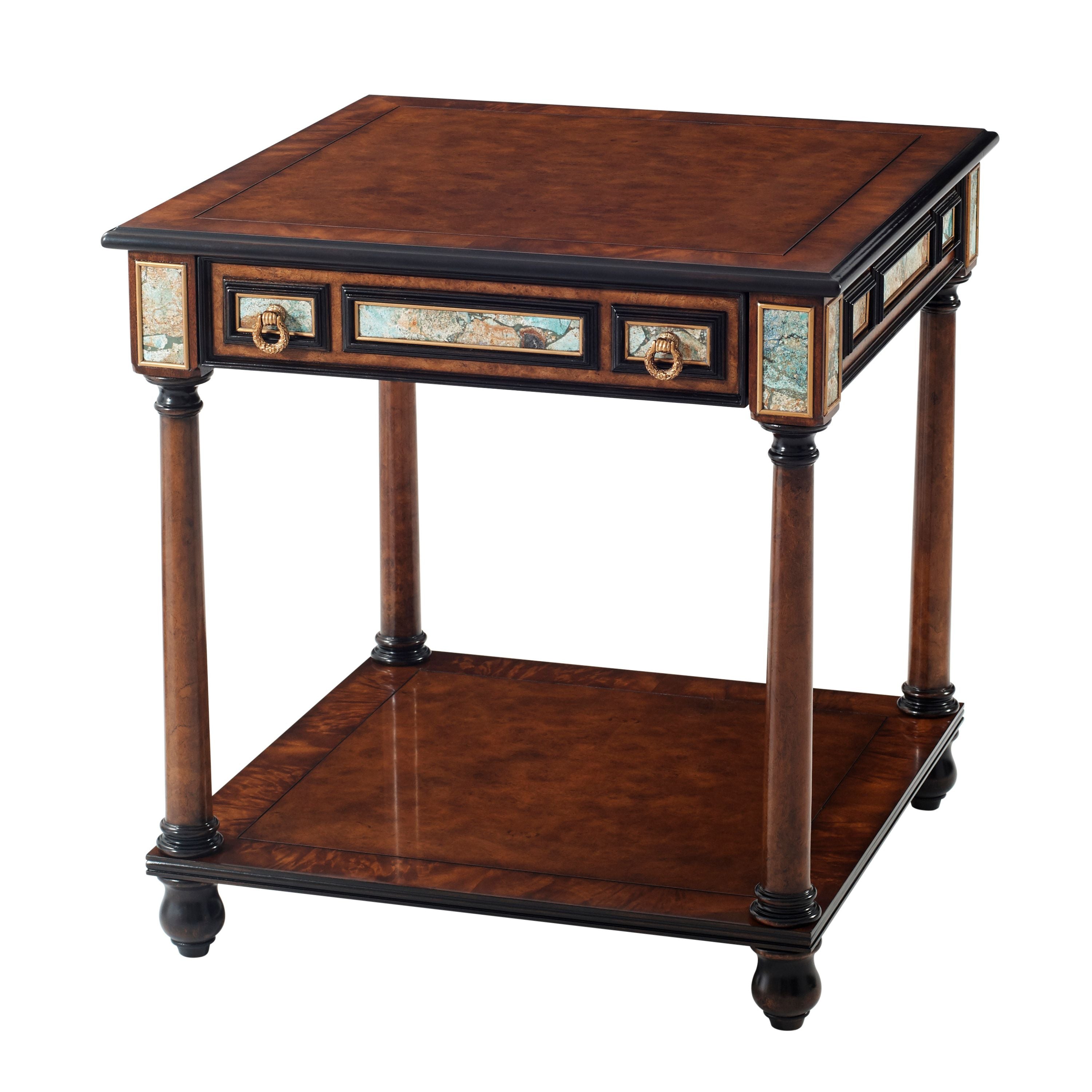 طاولة مصباح مصنوعة من خشب البرل المقطوع والحجر الفيروزي، حافة مربعة مصبوبة وجزء علوي متقاطع فوق درج إفريز مقسم إلى أجزاء، وأرجل دائرية متصلة بطبقة سفلية.