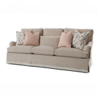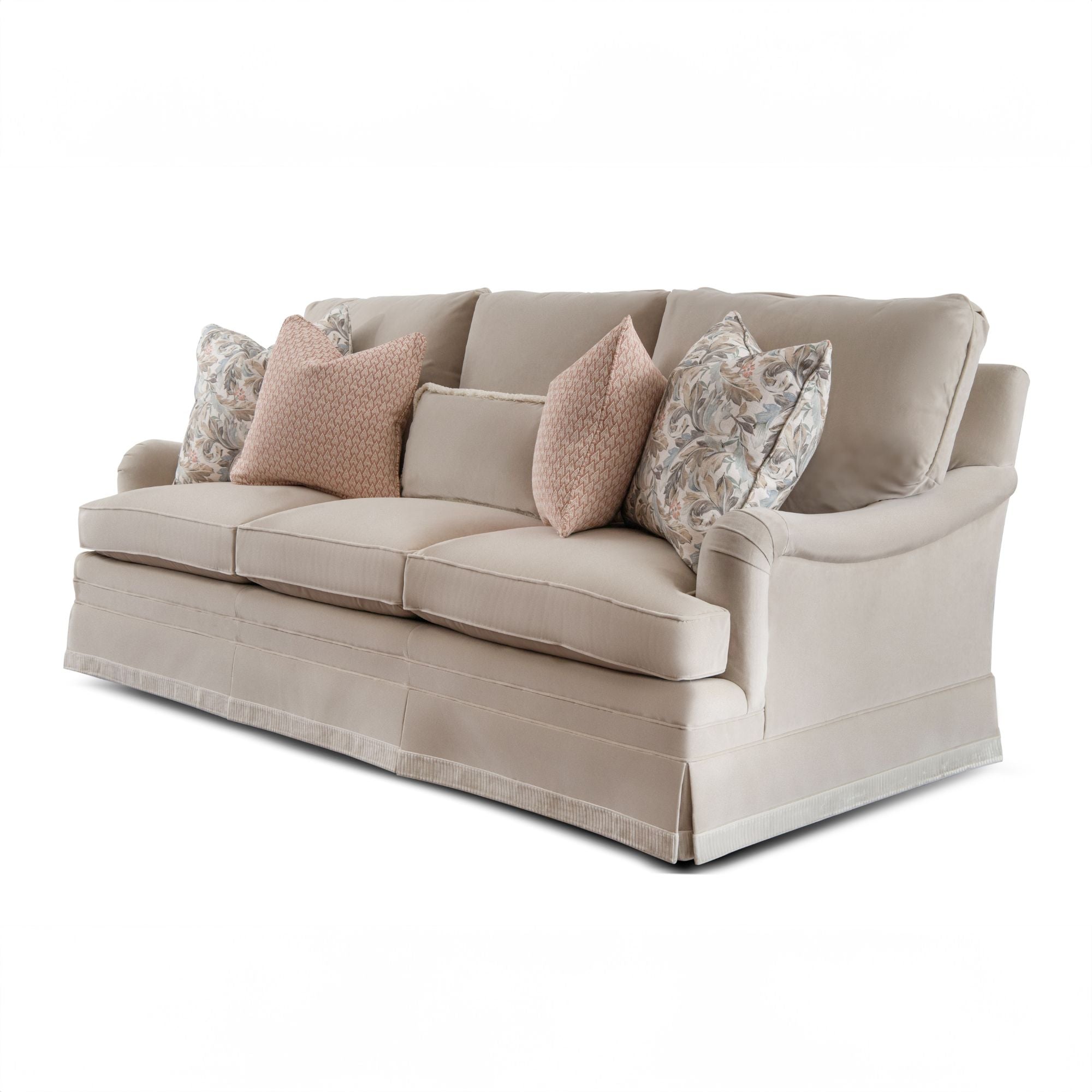 An English arm sofa, the triple loose pillow back and loose cushion seat with four throw pillows and a kidney pillow standard, on reeded carved legs.