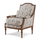 A finely carved fauteuil, the paper twist carved, arched top rail and down swept padded arms with scroll terminals enclosing an upholstered back and cushion seat, on a finely carved seat rail with flowerhead capitals to the turned and fluted legs. Inspired by a Louis XVI original.