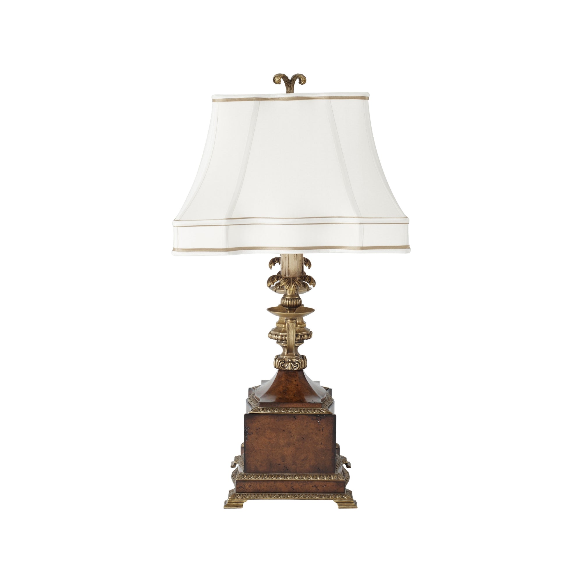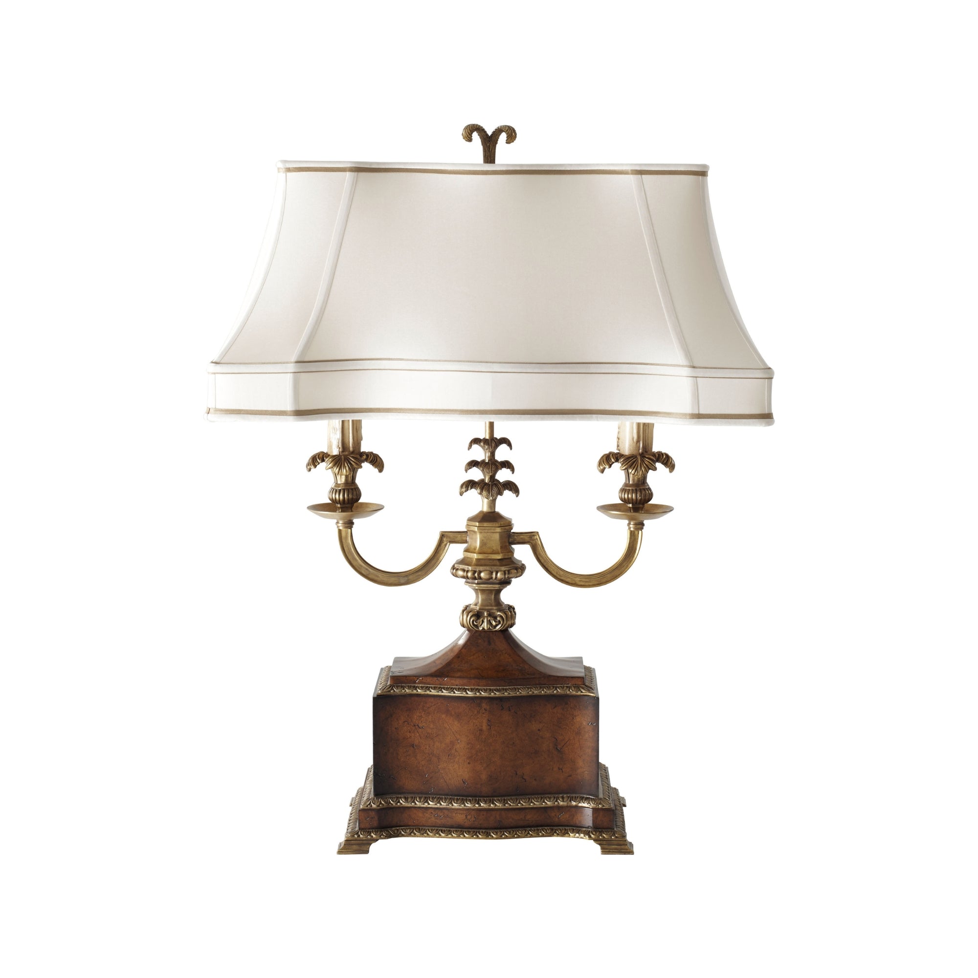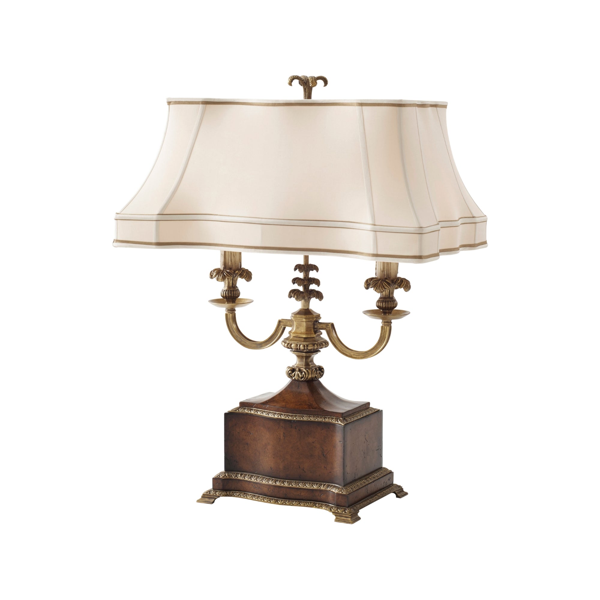 A pollard burl and finely cast brass table lamp, the twin light arms above a shaped base with brass mounts surmounted by hand sewn silk shade. The original Louis XVI.