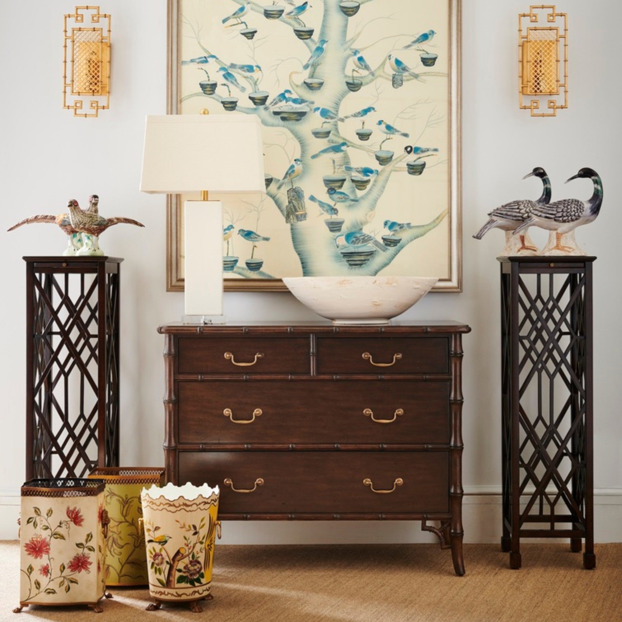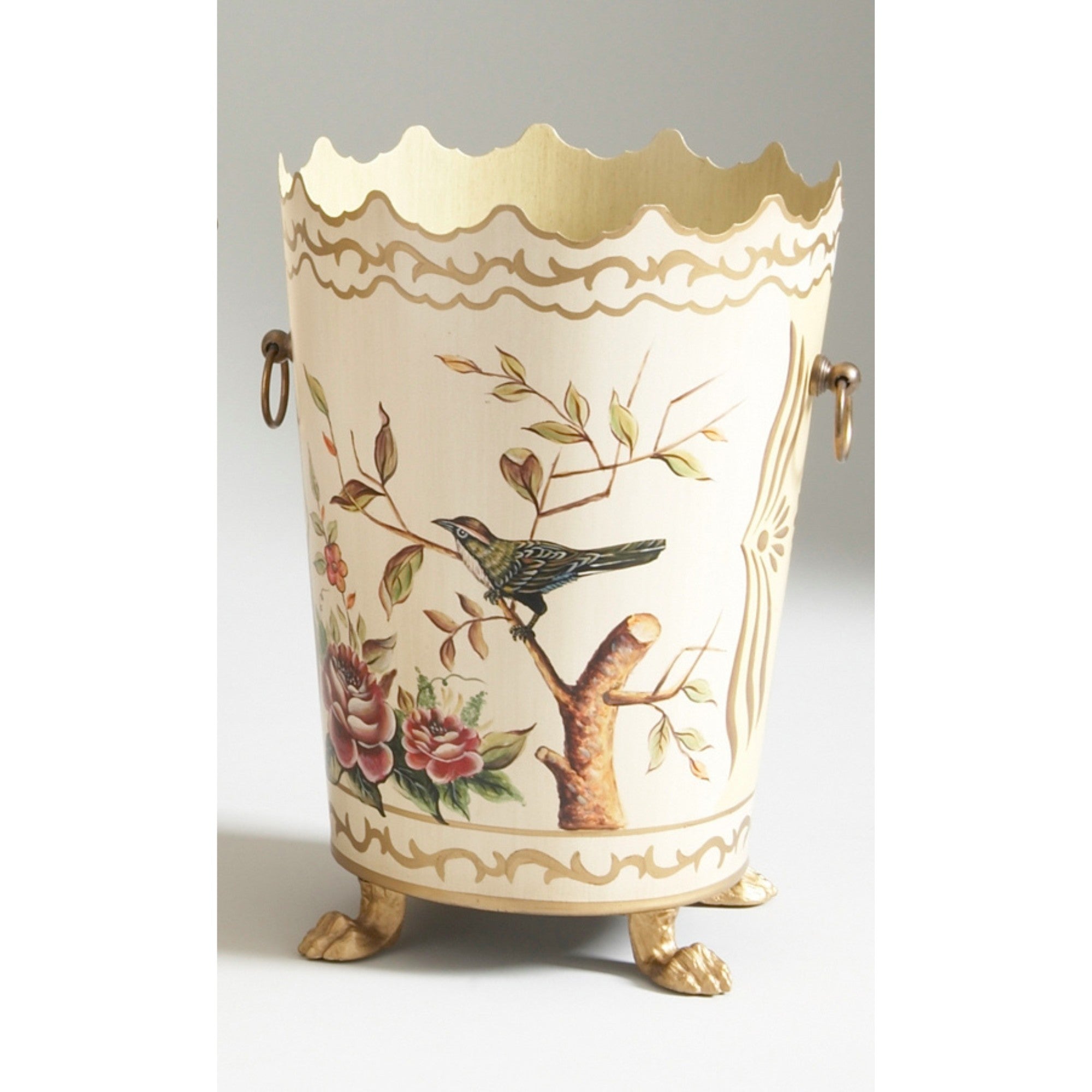 Elegant tole wastebasket with a hand painted foral and bird motif. Features antique gold claw feet, ring handles and a detailed scalloped top edge. Designed to collect waste in upscaled homes or offices.