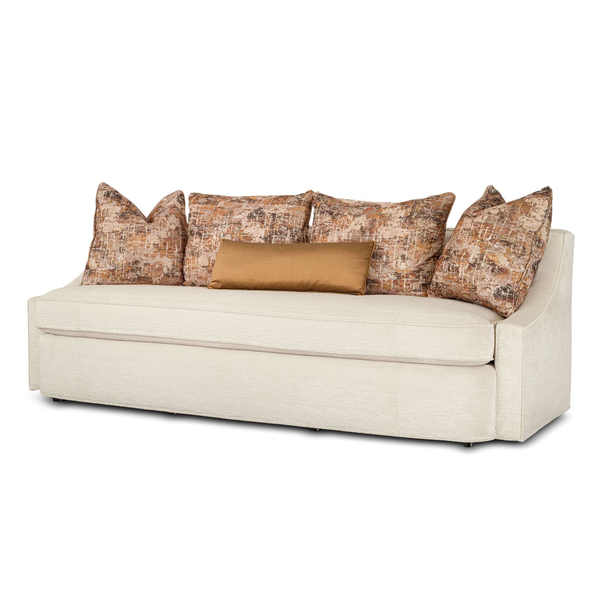 An upholstered sofa, the gently curved back with downswept low arms enclosing a shaped loose bench cushion seat with quadruple loose pillow back, on an upholstered base.
