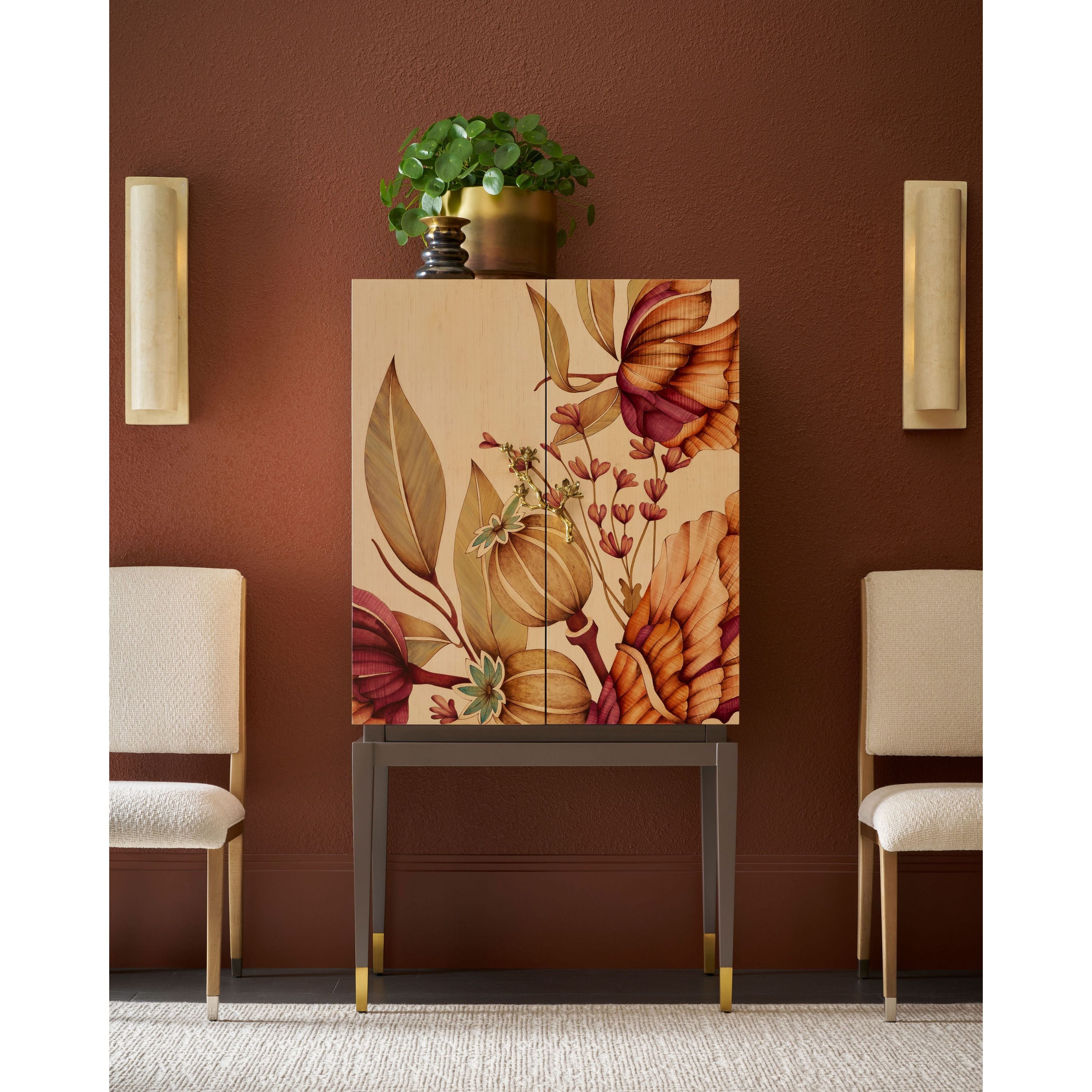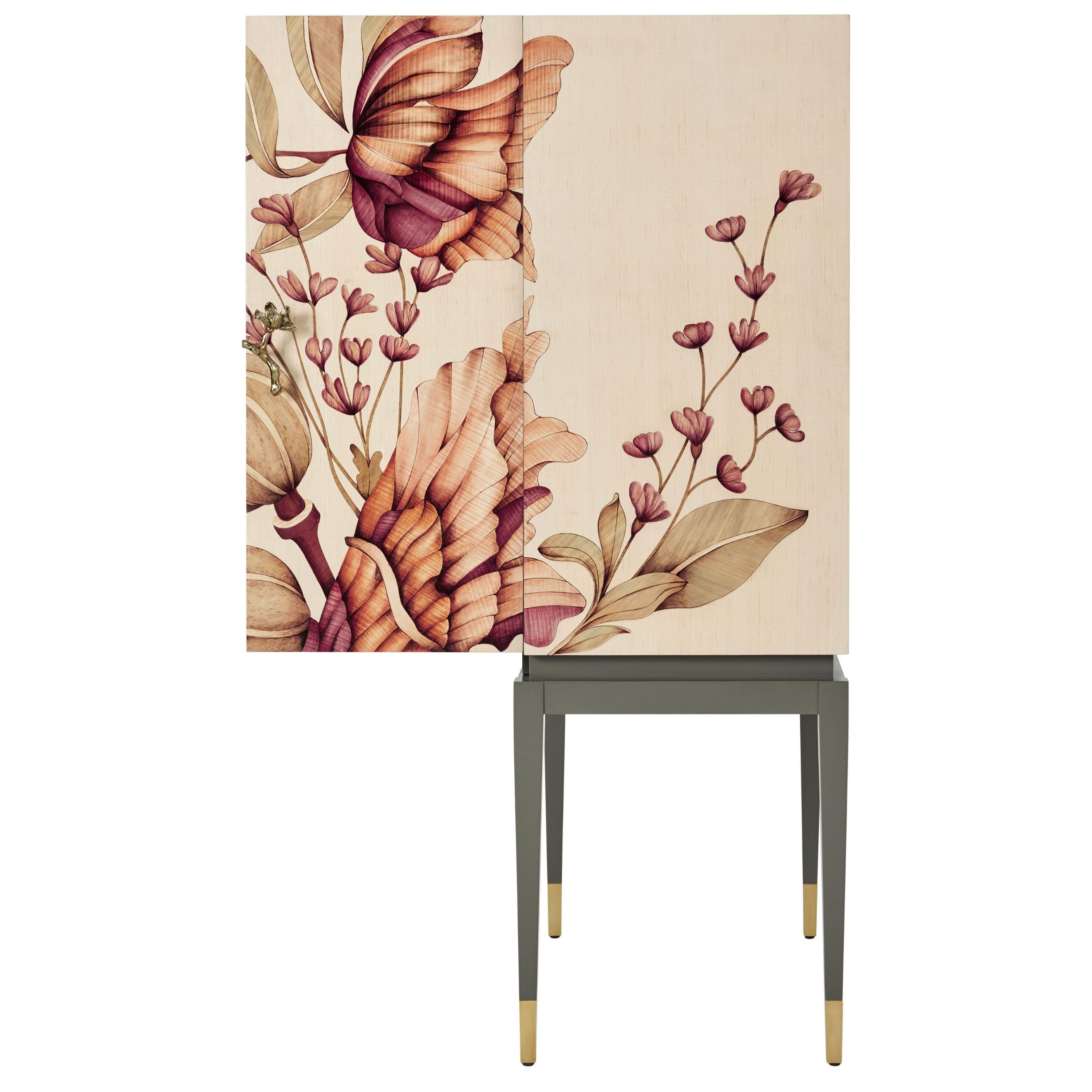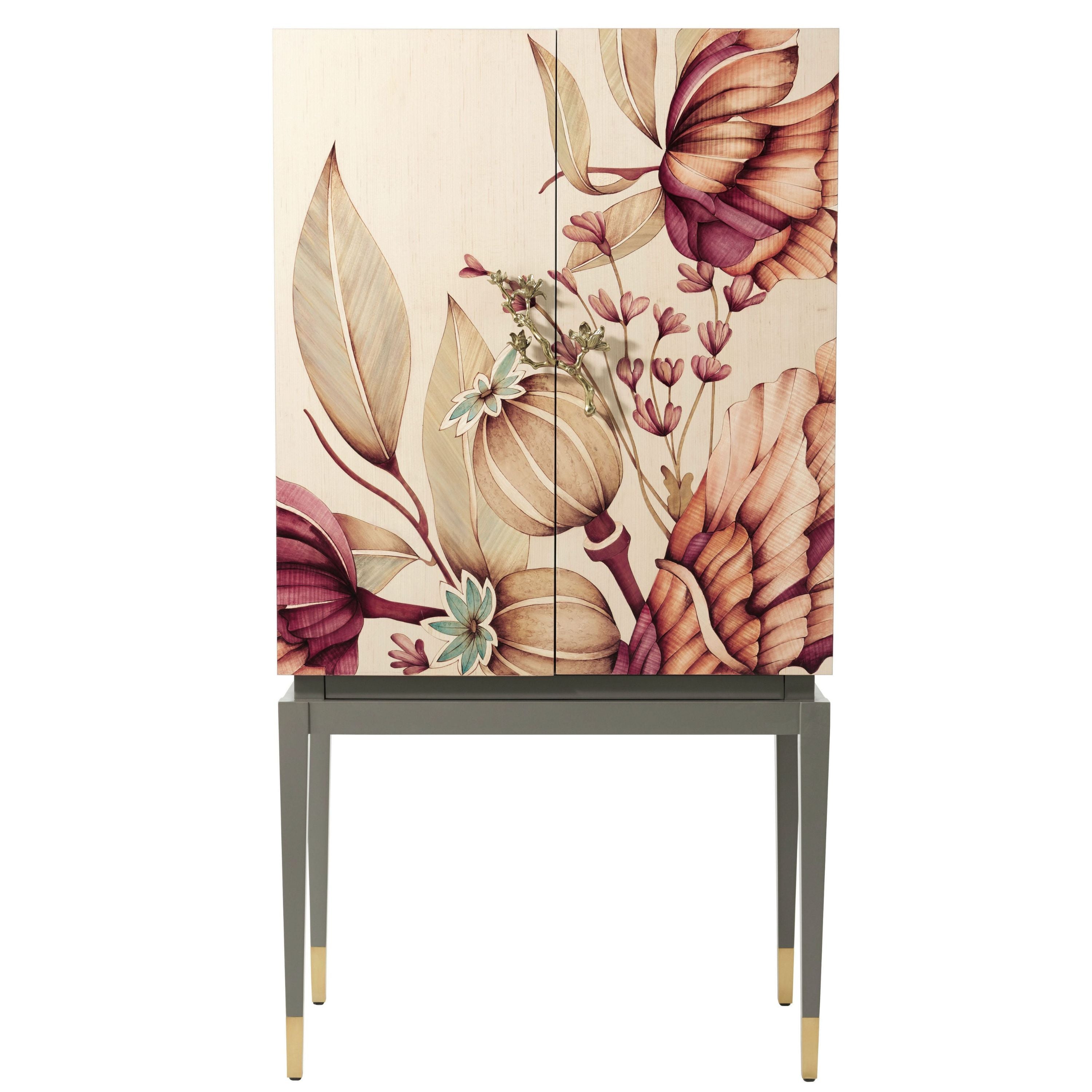 بفضل لونها وشكلها، تُصبح خزانة بار الباقة قطعةً مركزيةً زهريةً رائعة. في الداخل، تُضفي مرآة زجاجية لمسةً من الرقي. أبواب مُطعّمة بالقشرة. قاعدة مطلية بالبرونز.