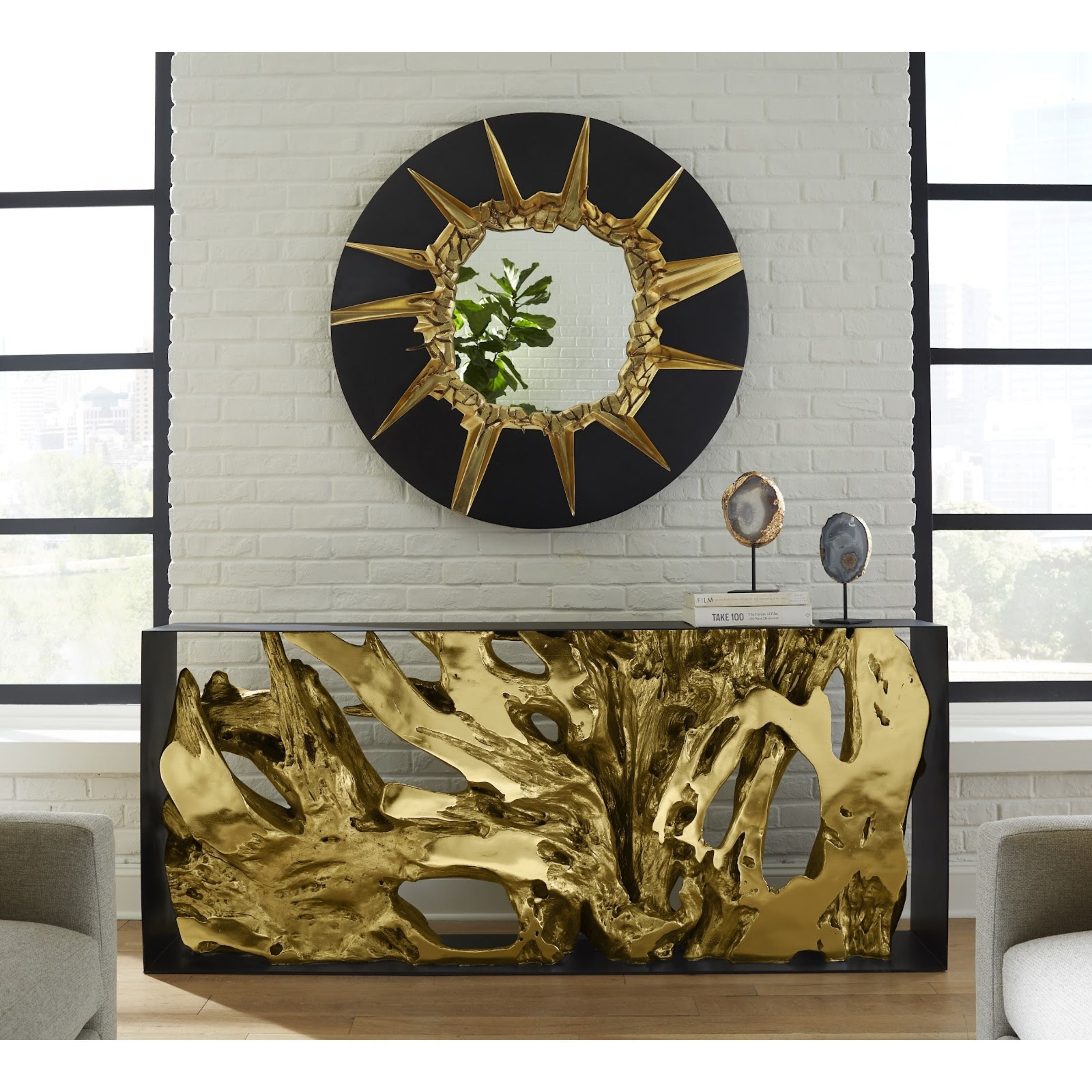 بإطارٍ يبدو وكأنه قد تحطم ليكشف عن جمالٍ داخليٍّ متألق، تُعدّ المرآة الدائرية المتشققة باللونين الأسود والذهبي مرآةً زخرفيةً دائريةً مصنوعةً من مادةٍ مركبةٍ بمزيجٍ من الأسود غير اللامع وأوراق الذهب. يجعل تناغم الأسود الداكن والذهبي اللامع هذه المرآة قطعةً فنيةً جداريةً تُضفي تباينًا على المساحة، وهو عنصرٌ بالغ الأهمية لابتكار ديكوراتٍ داخليةٍ أنيقة. كما تُعدّ جودة نسيج الجزء الذهبي المُشكّل بشكلٍ عضويٍّ المحيط بالمرآة تفصيلًا تصميميًا بارزًا. تعكس هذه المرآة المستديرة فلسفة مجموعة فيليبس: التصميم العضوي الحديث.