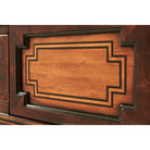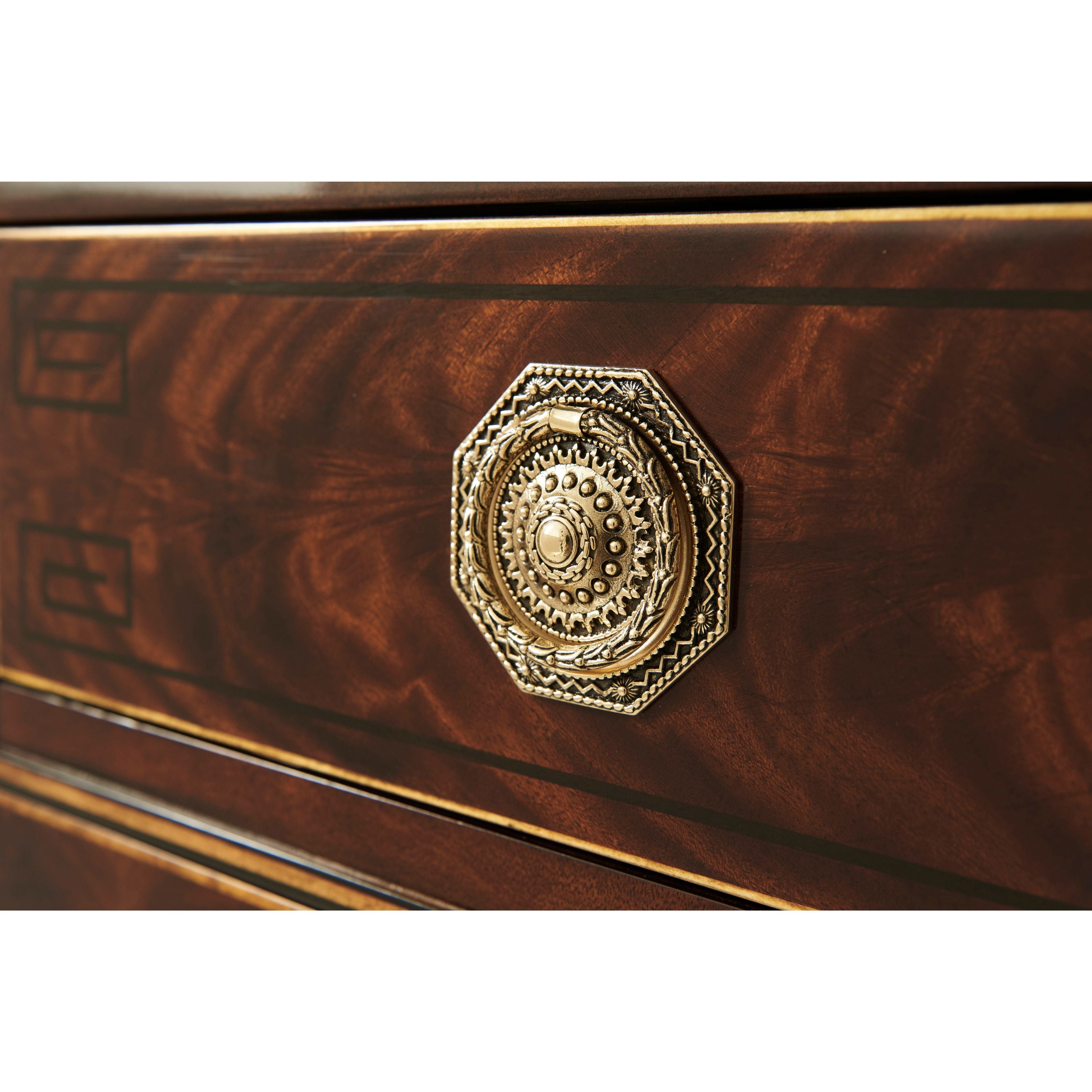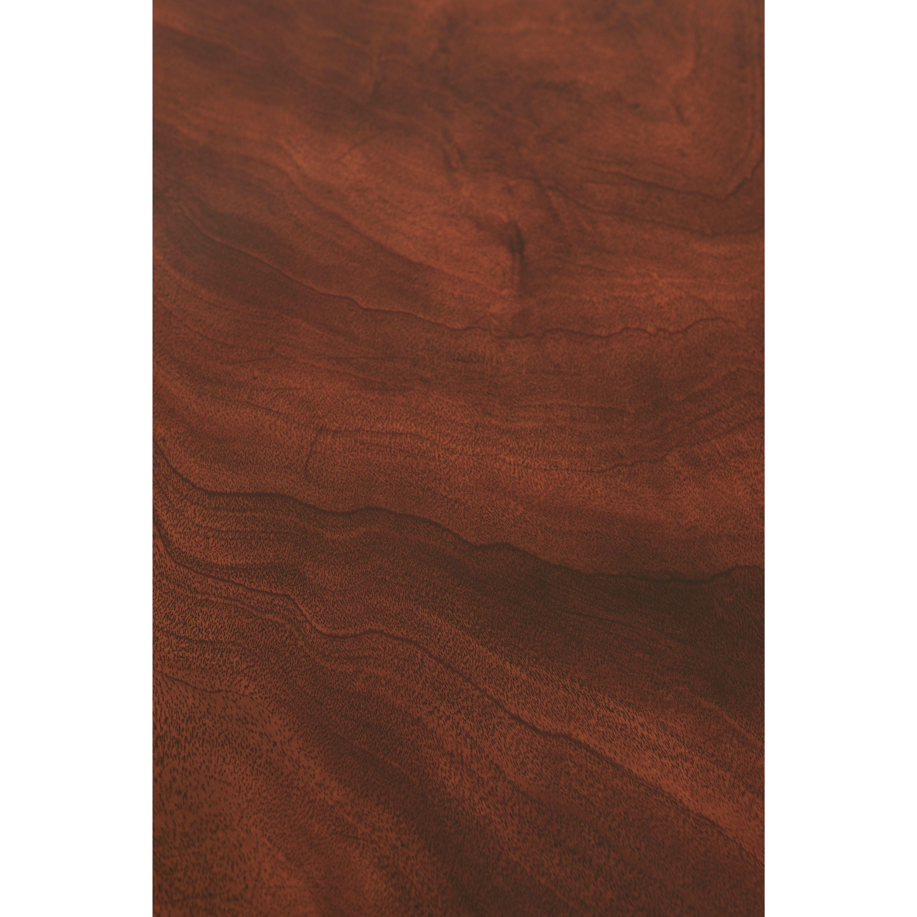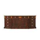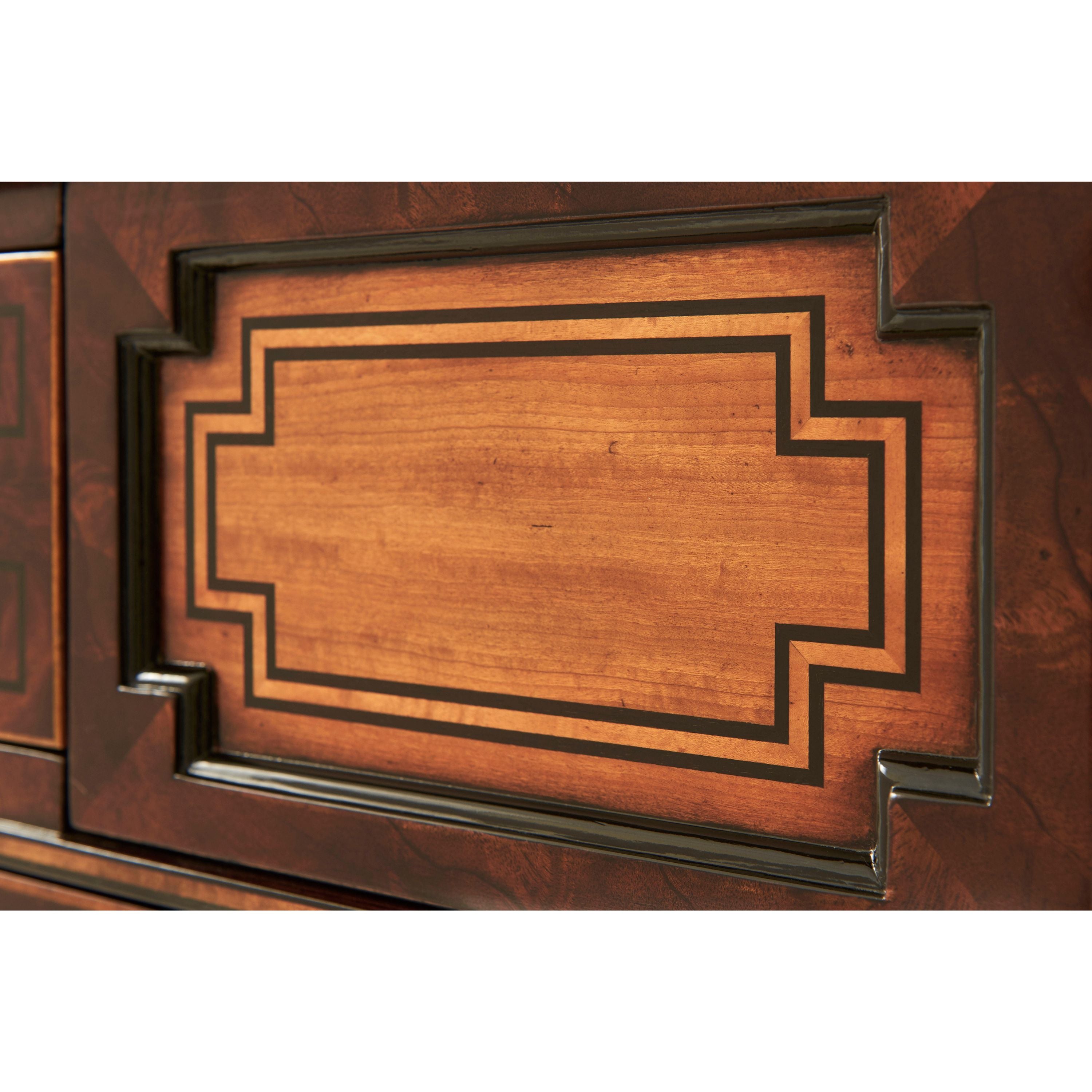 طاولة طعام مصنوعة من خشب الماهوجني الفاخر ومغطاة بشريط من خشب الطقسوس، الجزء العلوي من مقدمة الطاولة مزين بحافة من الأبنوس والنحاس، فوق ترتيب من أربعة أدراج إفريز وأبواب خزانة مركزية تحيط برف قابل للتعديل، محاطة بمجموعتين من ثلاثة أدراج متدرجة وأعمدة مخروطية مدببة، على قاعدة خطية مترابطة.