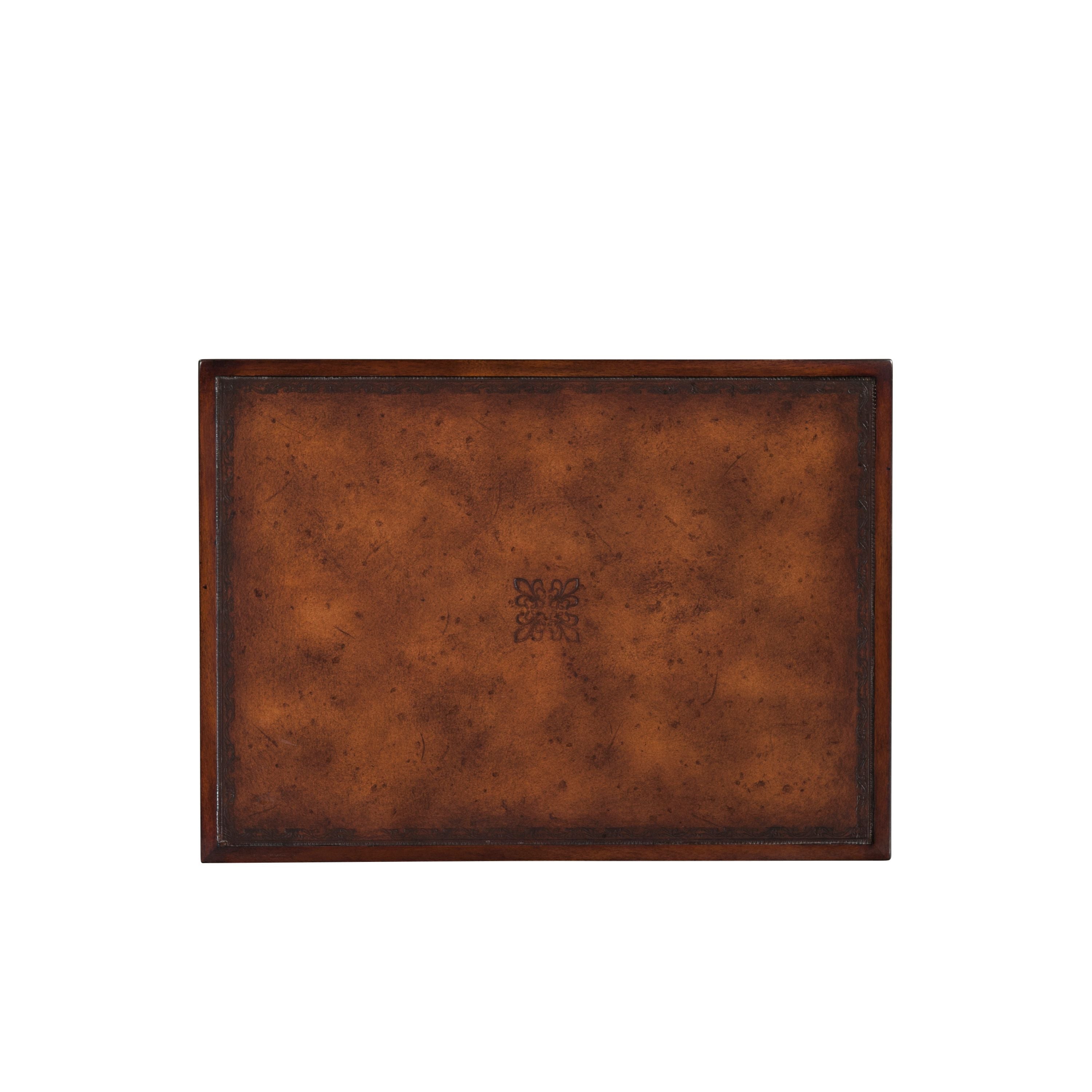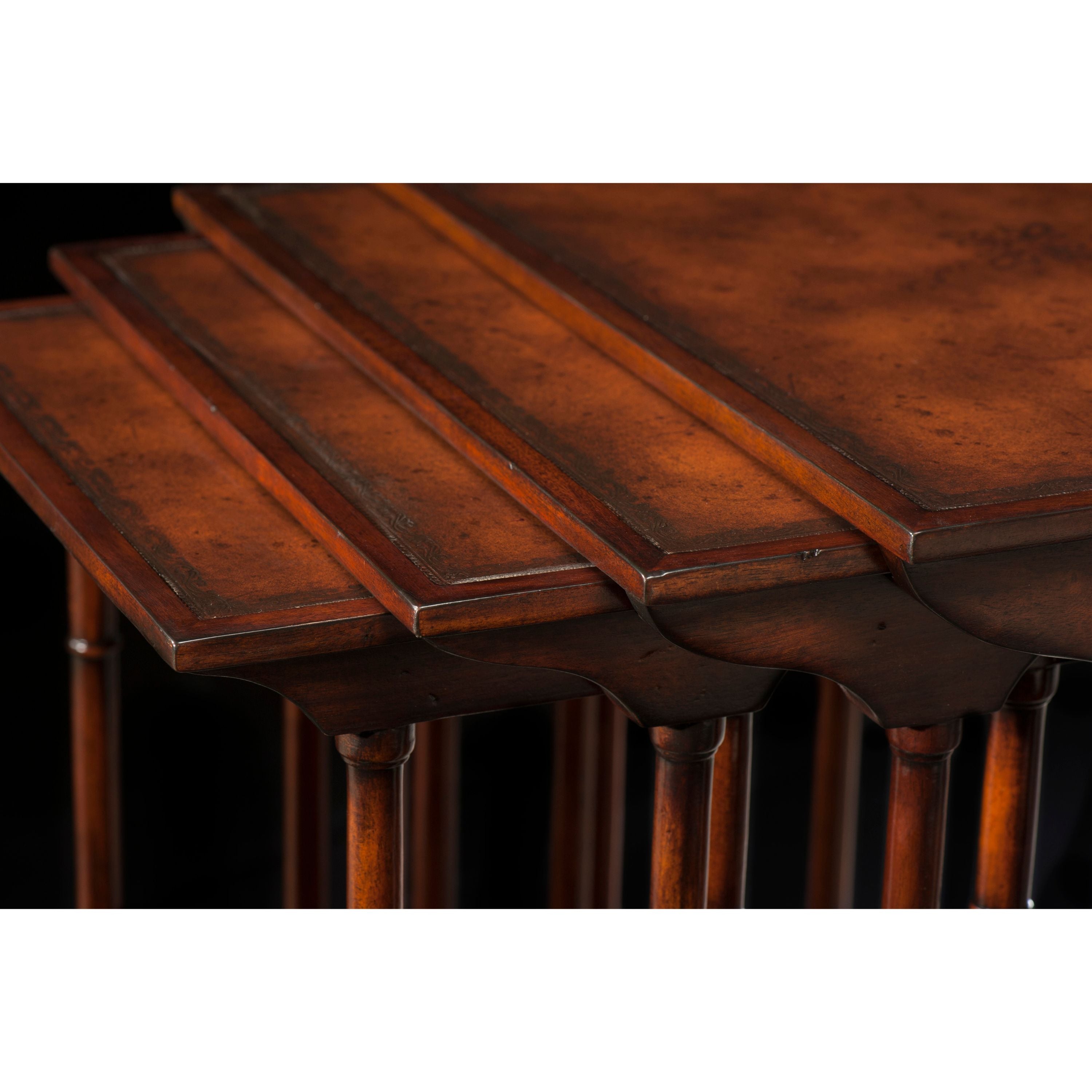 مجموعة من أربع طاولات من خشب الماهوجني، بأسطح جلدية بنية مدمجة، على دعائم منحنية وأرجل متباعدة. تصميمها الأصلي من عصر ريجنسي.