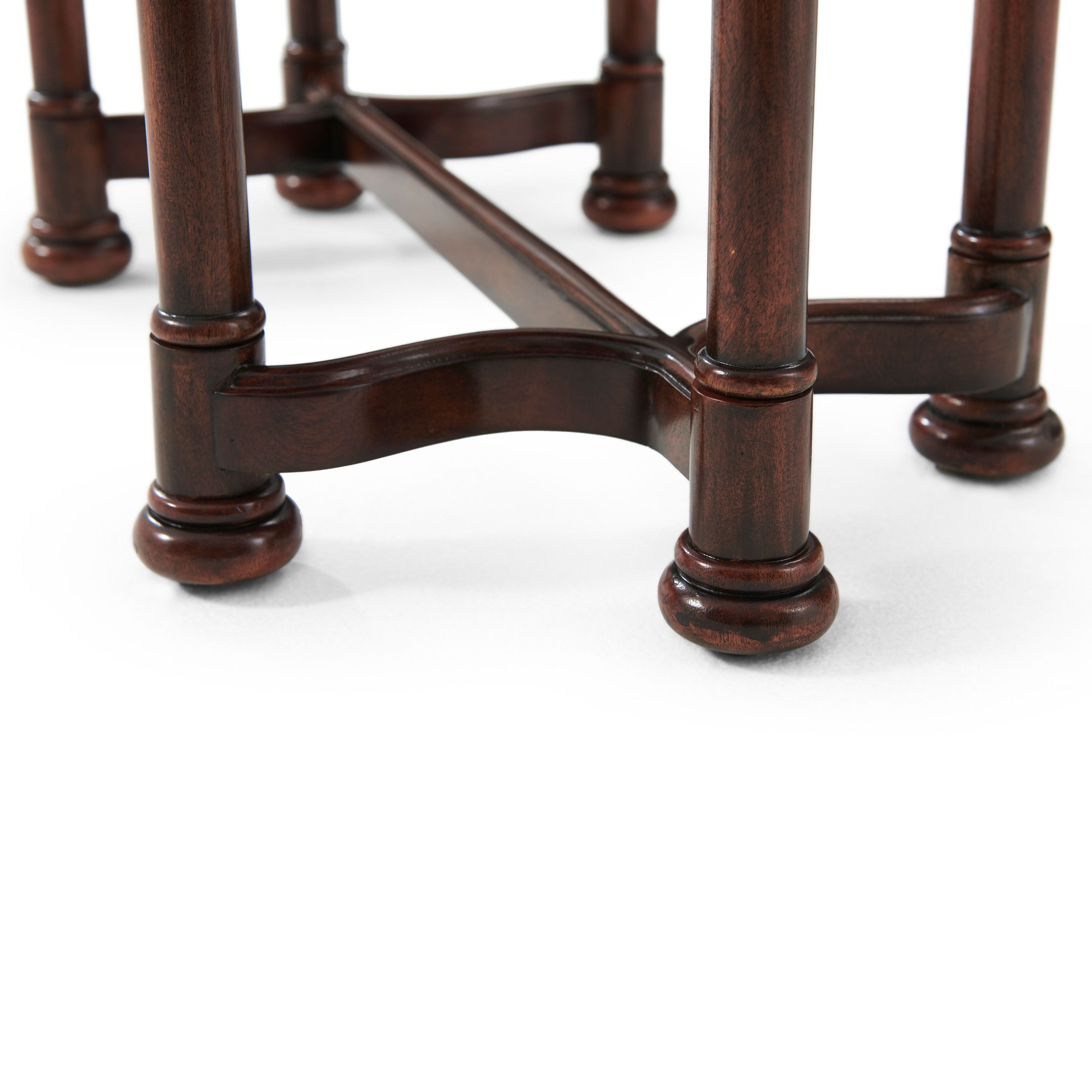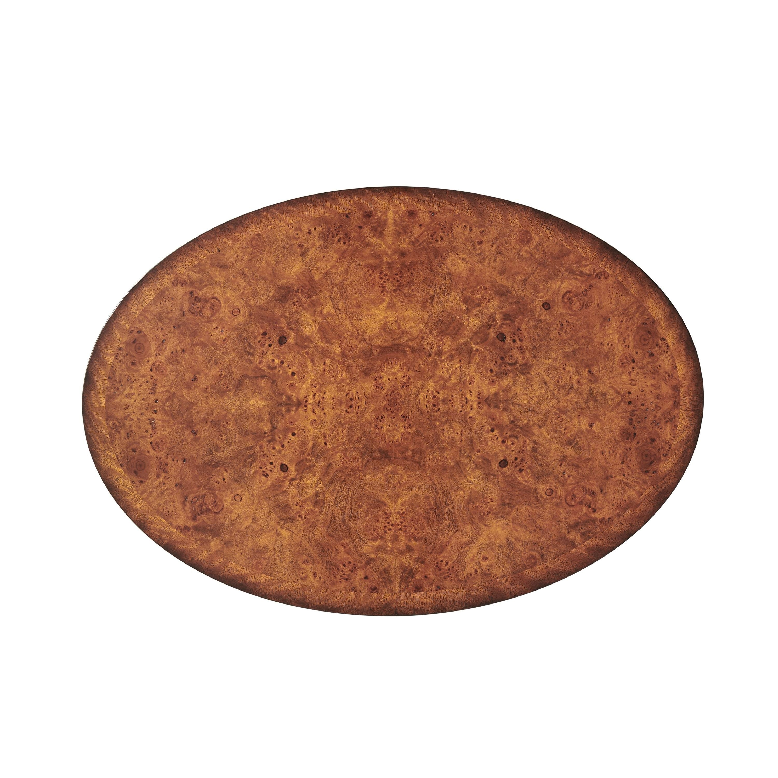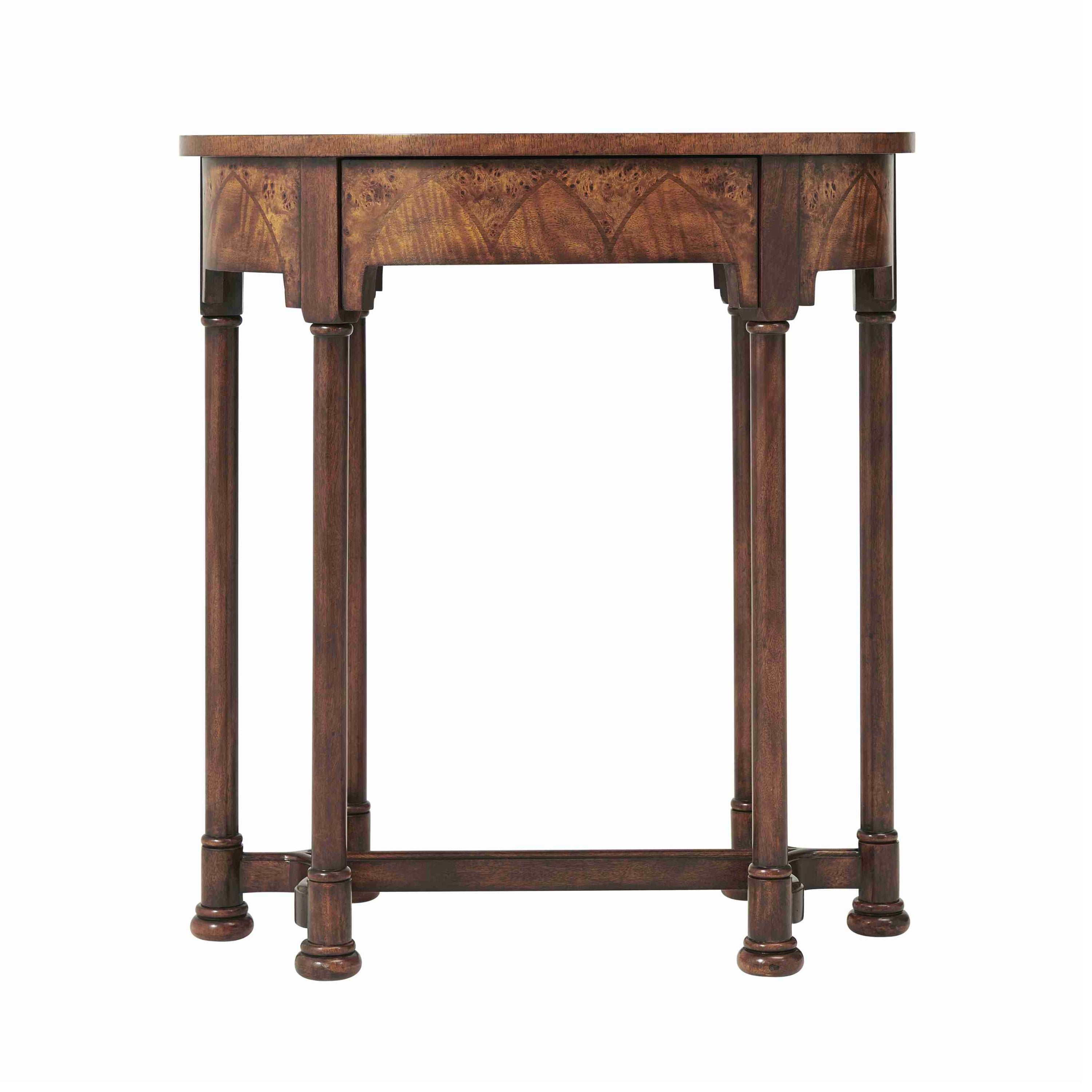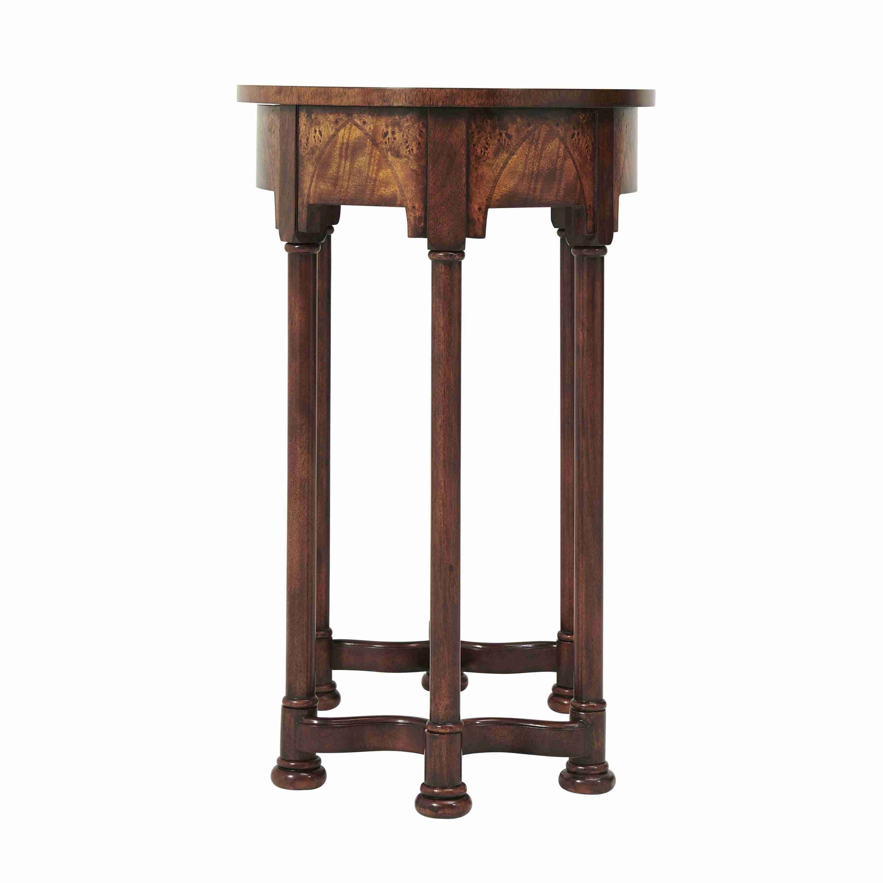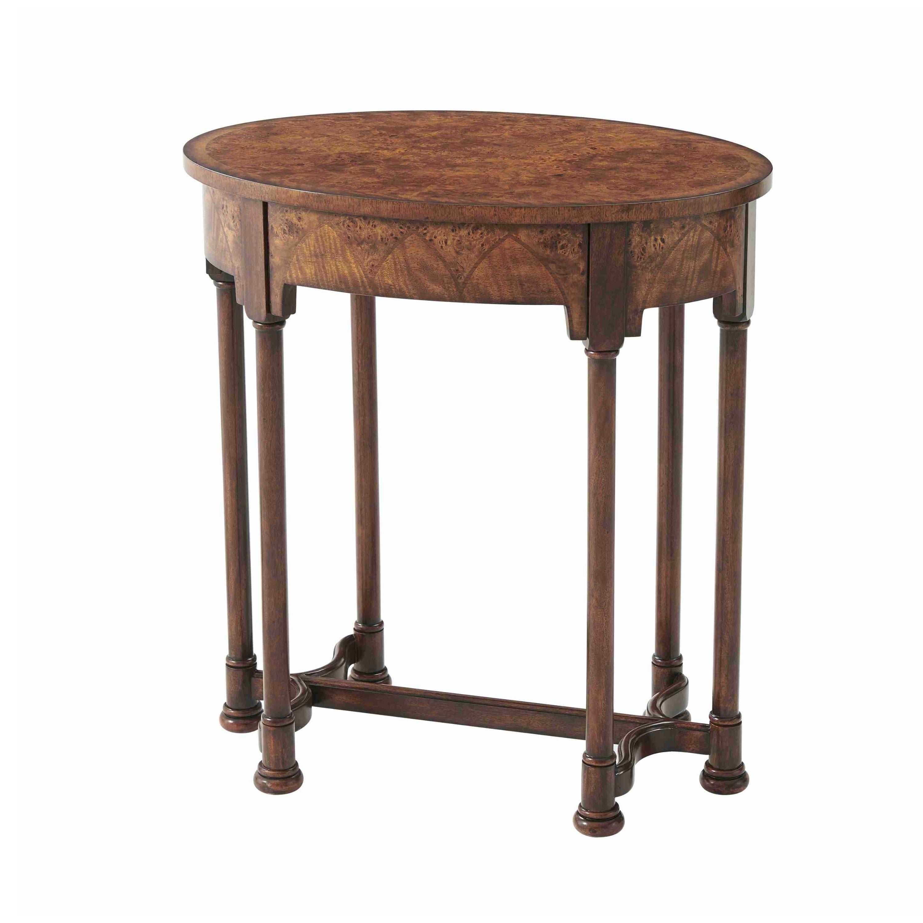 A Gothic Revival poplar burl oval lamp table, the arched inlaid frieze with a central drawer, on turned legs joined by shaped stretchers.