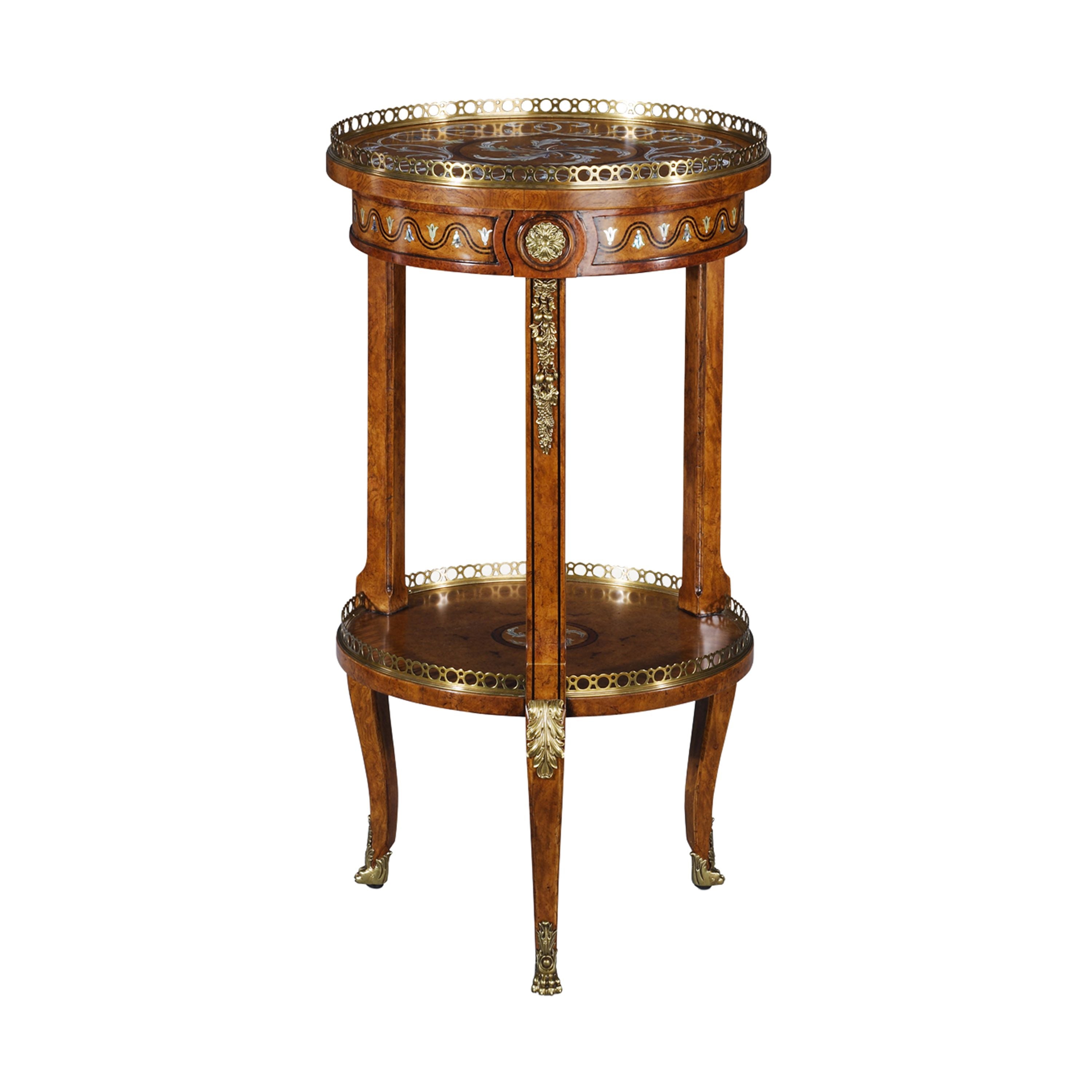 A burl and mother of pearl inlaid lamp table with fine brass mounts, the circular brass