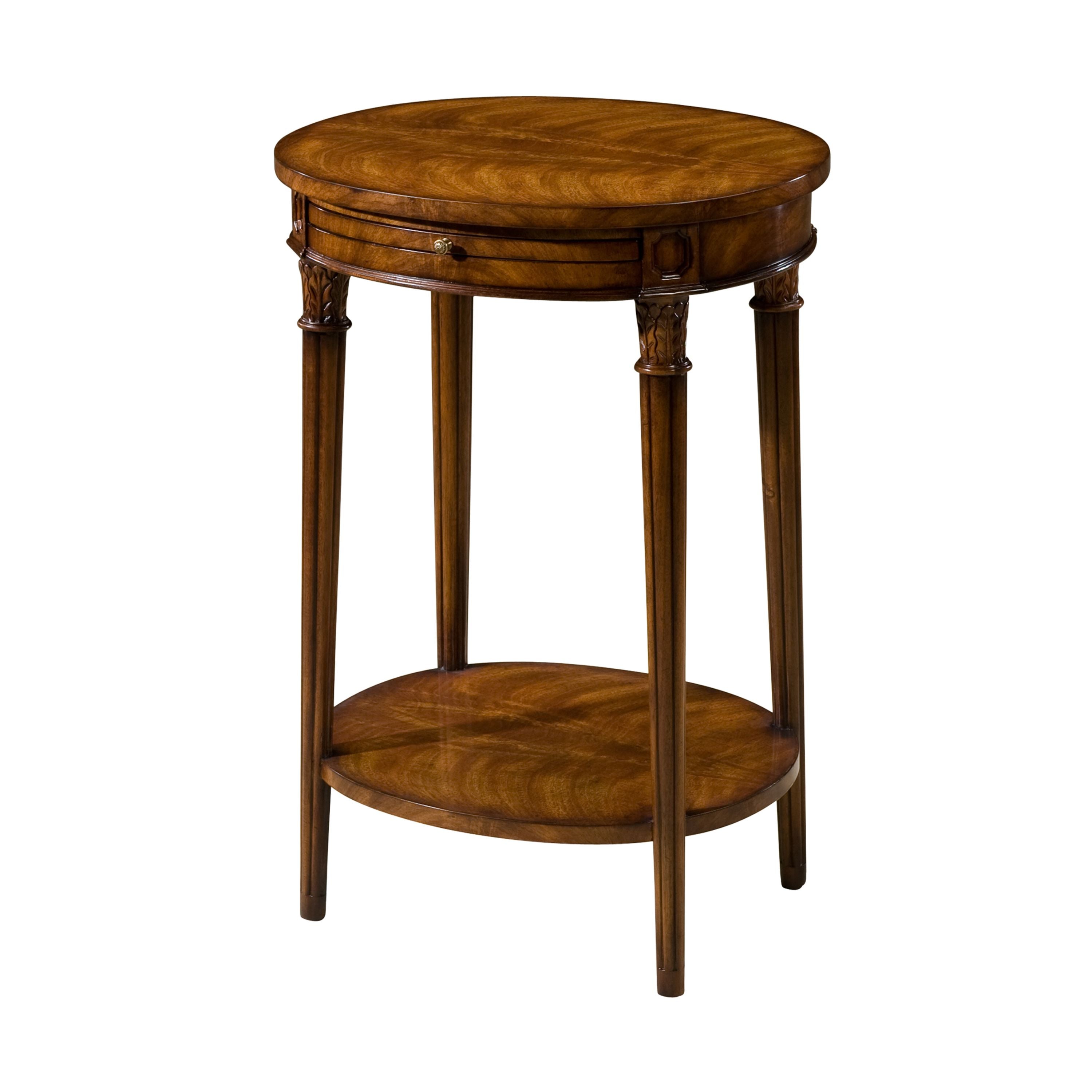 A flame veneered and mahogany lamp table, the oval top on gently splayed acanthus capital and reeded tapering legs joined by an undertier.