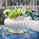 Create an alluring centerpiece for your dining room table or buffet with our Oval Pot. This 12.5" oval pot is crafted of white hand-glazed Italian ceramic with metallic gold trim. The fluted sides and scrolled handles add texture and a touch of elegance. Made in Italy.