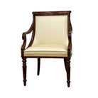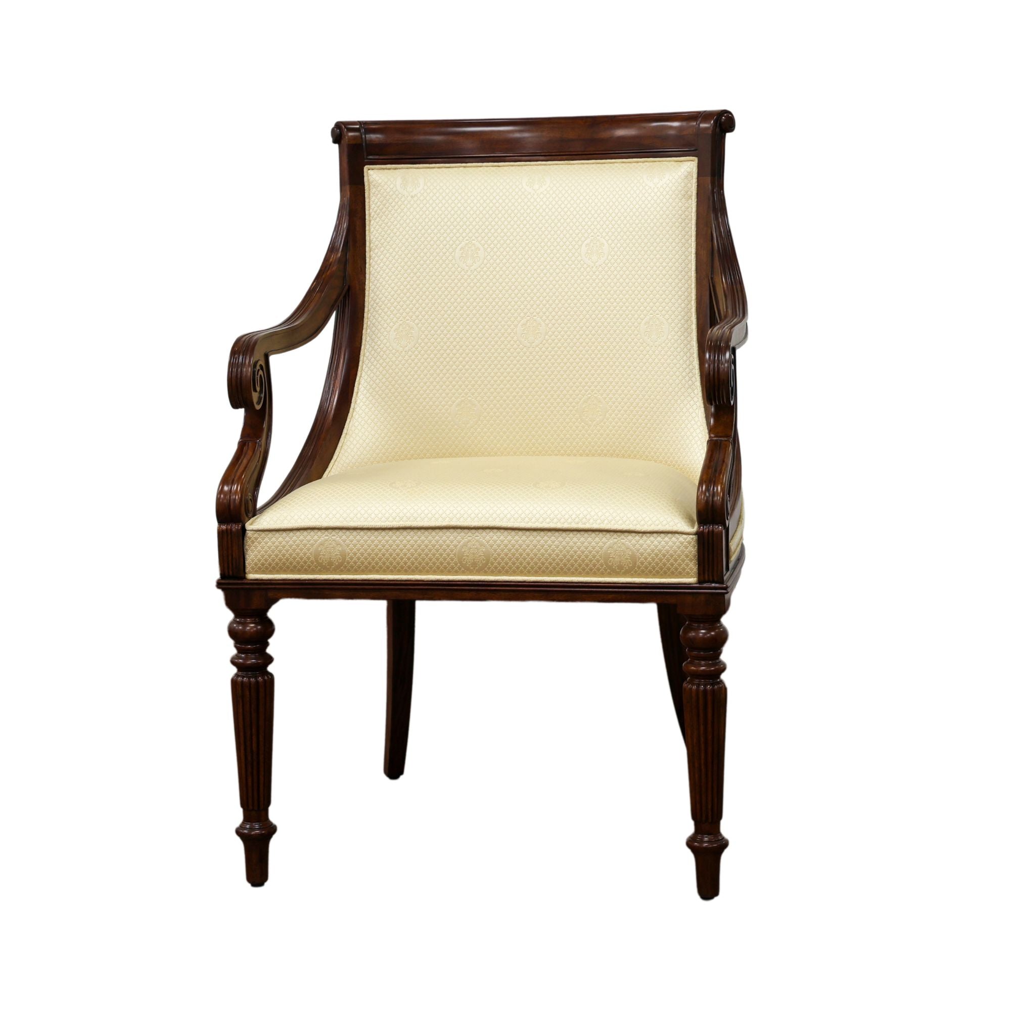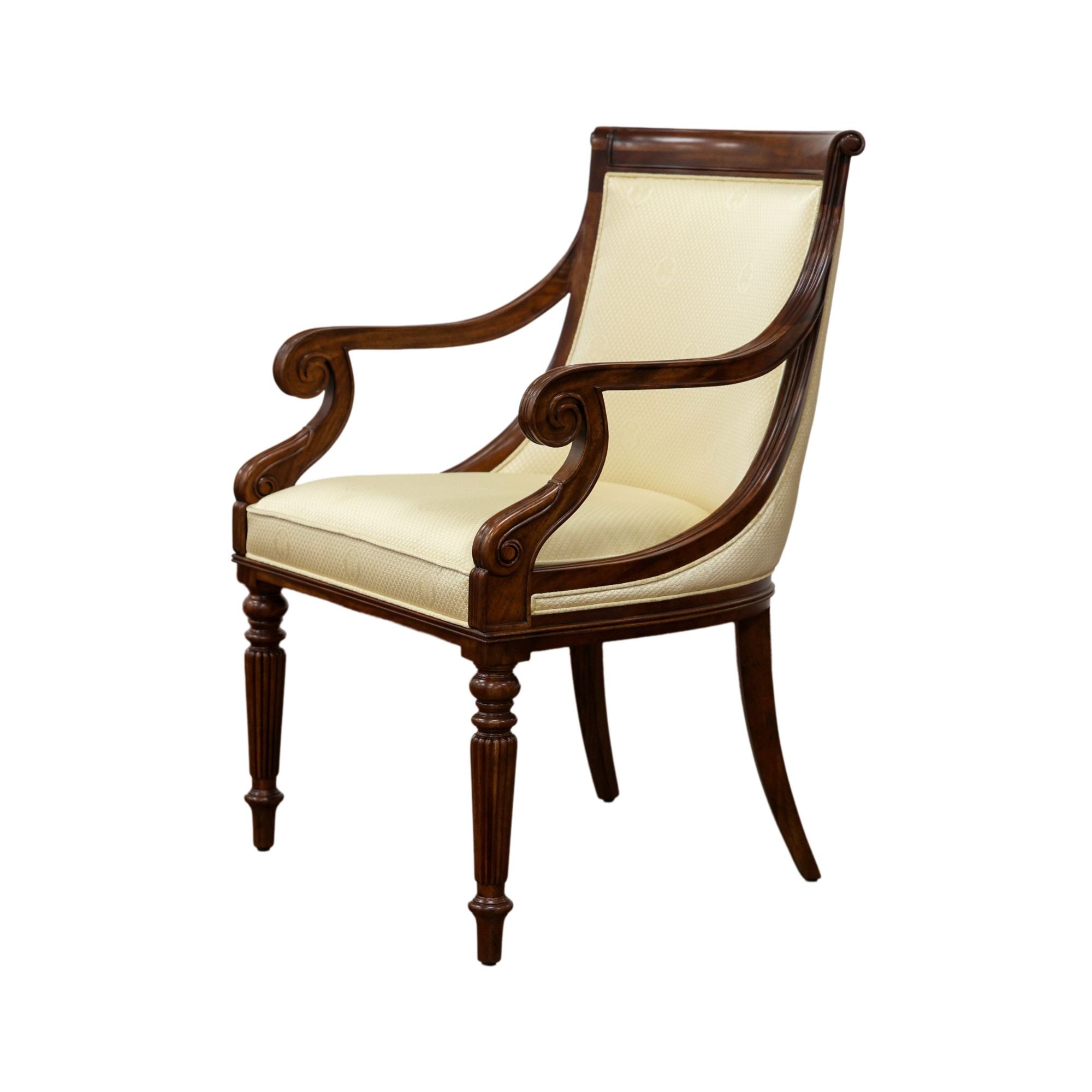 A hand-carved mahogany scoop back dining armchair, the panelled and upholstered back above an upholstered seat flanked by scroll arms, on turned and reeded legs.