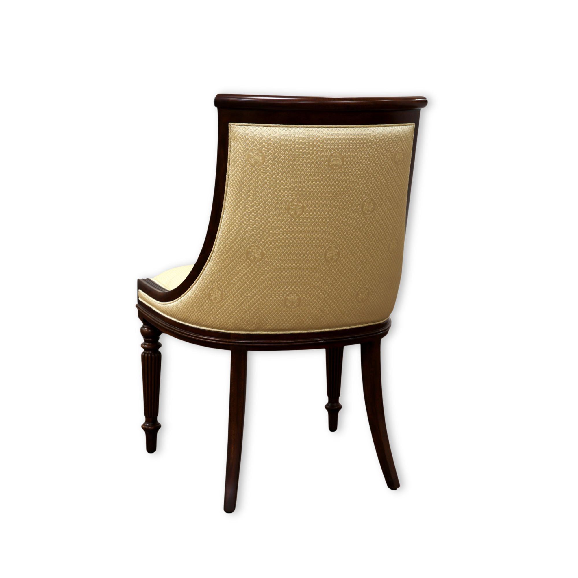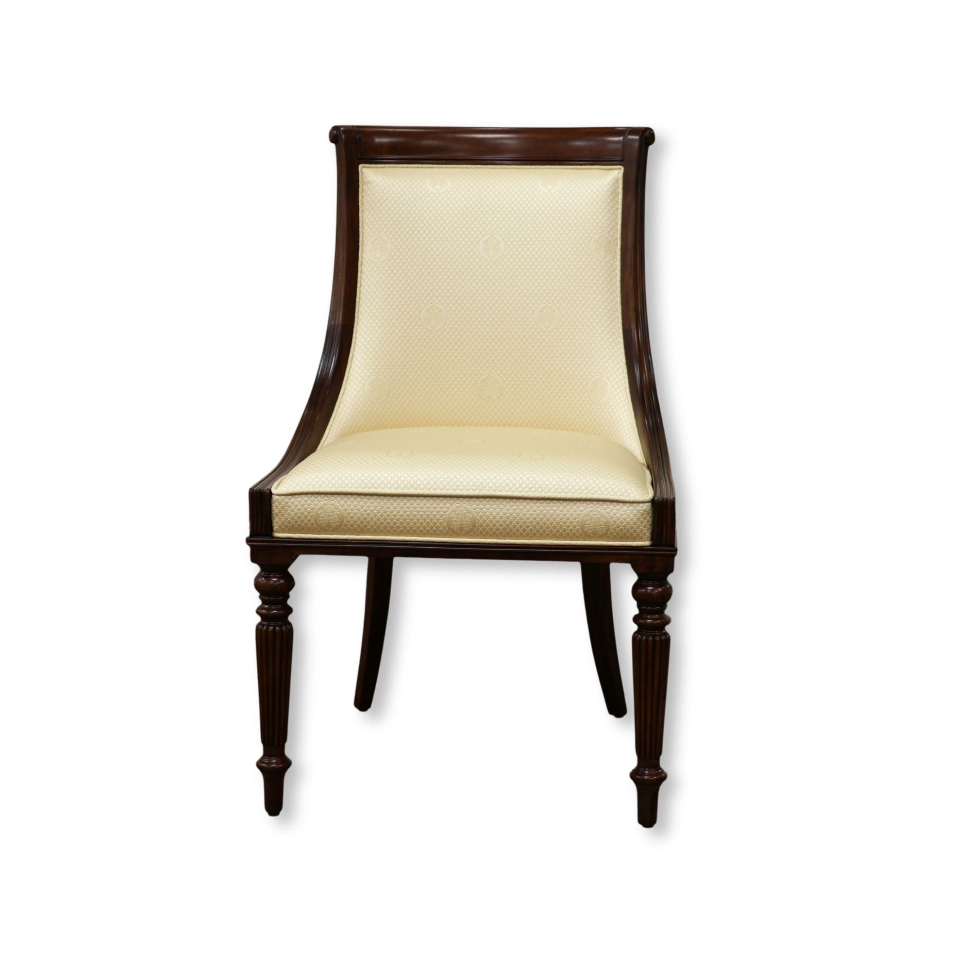 A hand carved mahogany scoop back dining chair, the panelled and upholstered back above an upholstered seat, on turned and reeded legs.