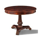 The Aston Court Center Table is a distinguished expression of classic craftsmanship, showcasing a richly figured crotch mahogany top arranged in a striking radial veneer pattern. The substantial circular top rests upon a finely turned pedestal base, elevated by carved scroll legs that lend architectural balance and presence. Subtle detailing and refined proportions make this piece an exceptional focal point for reception areas, formal living rooms, or grand entry halls.