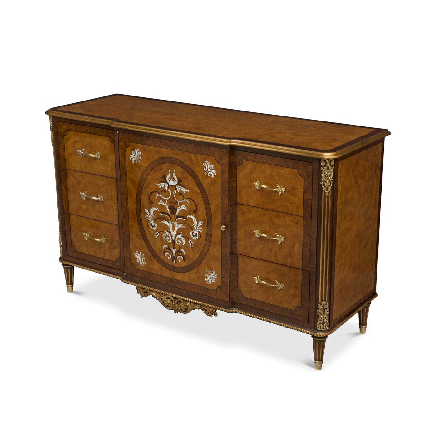 Myrtle Burl and Gold Gilt dresser with beautiful Shell Parquetry Inlay and Brass accents.