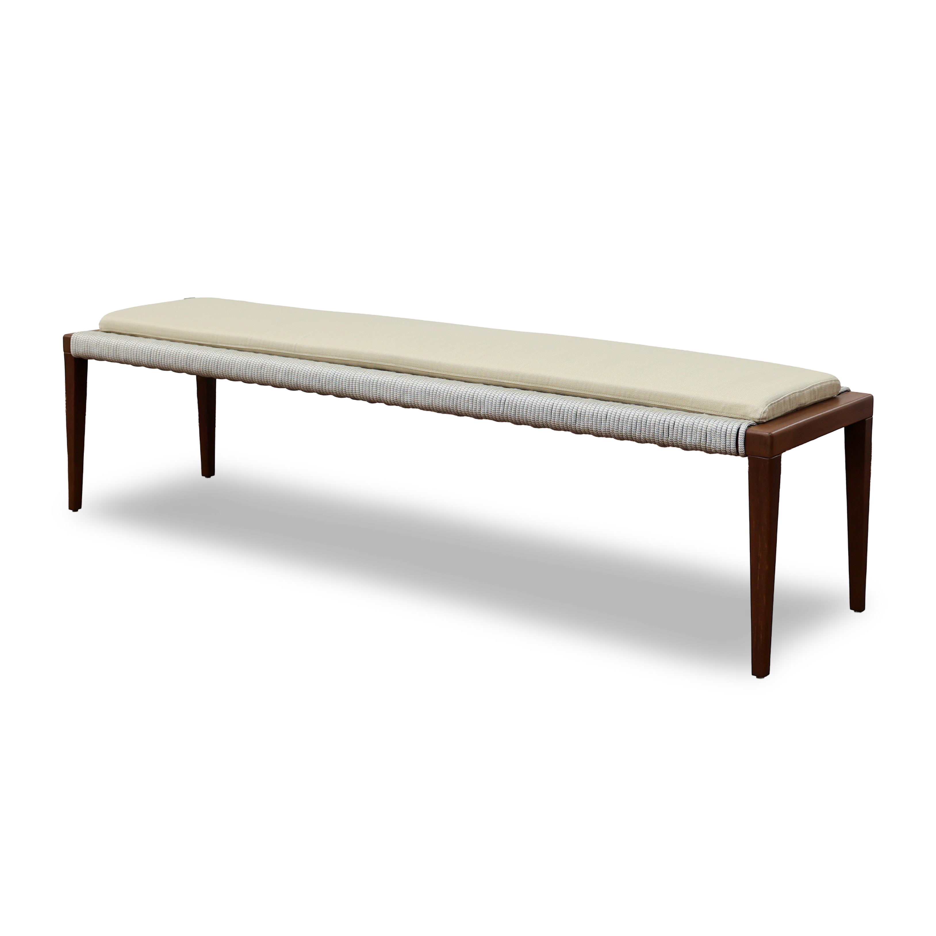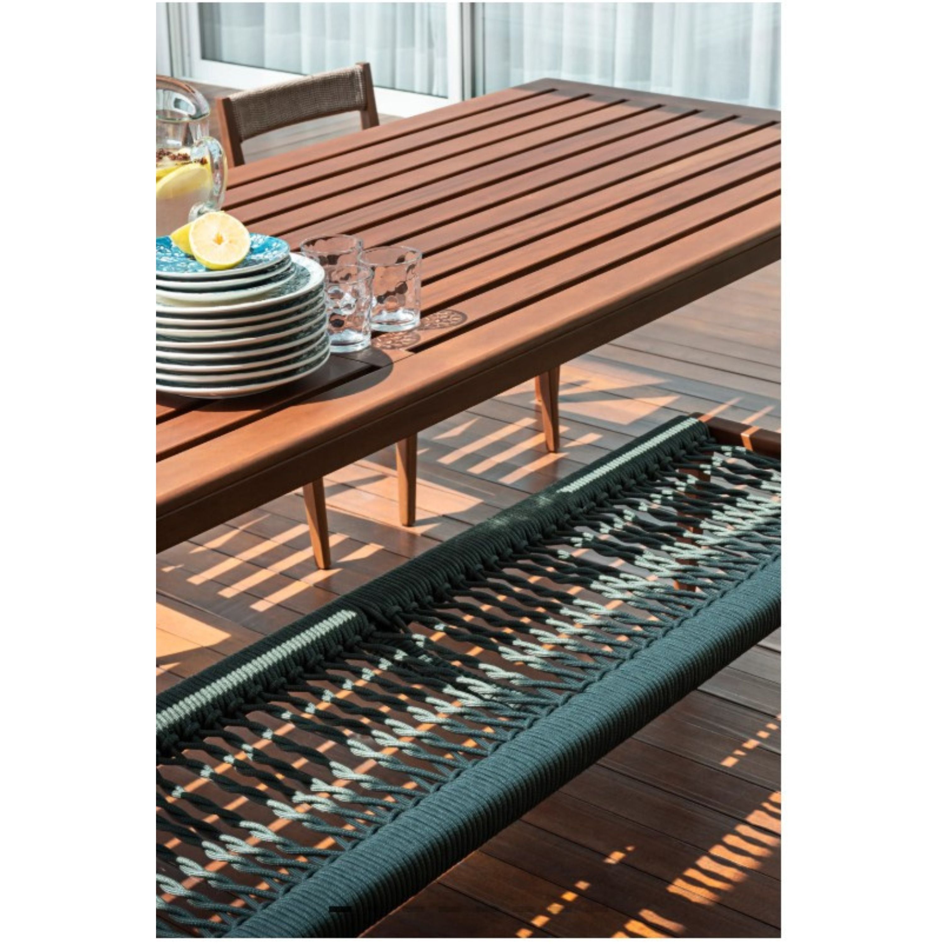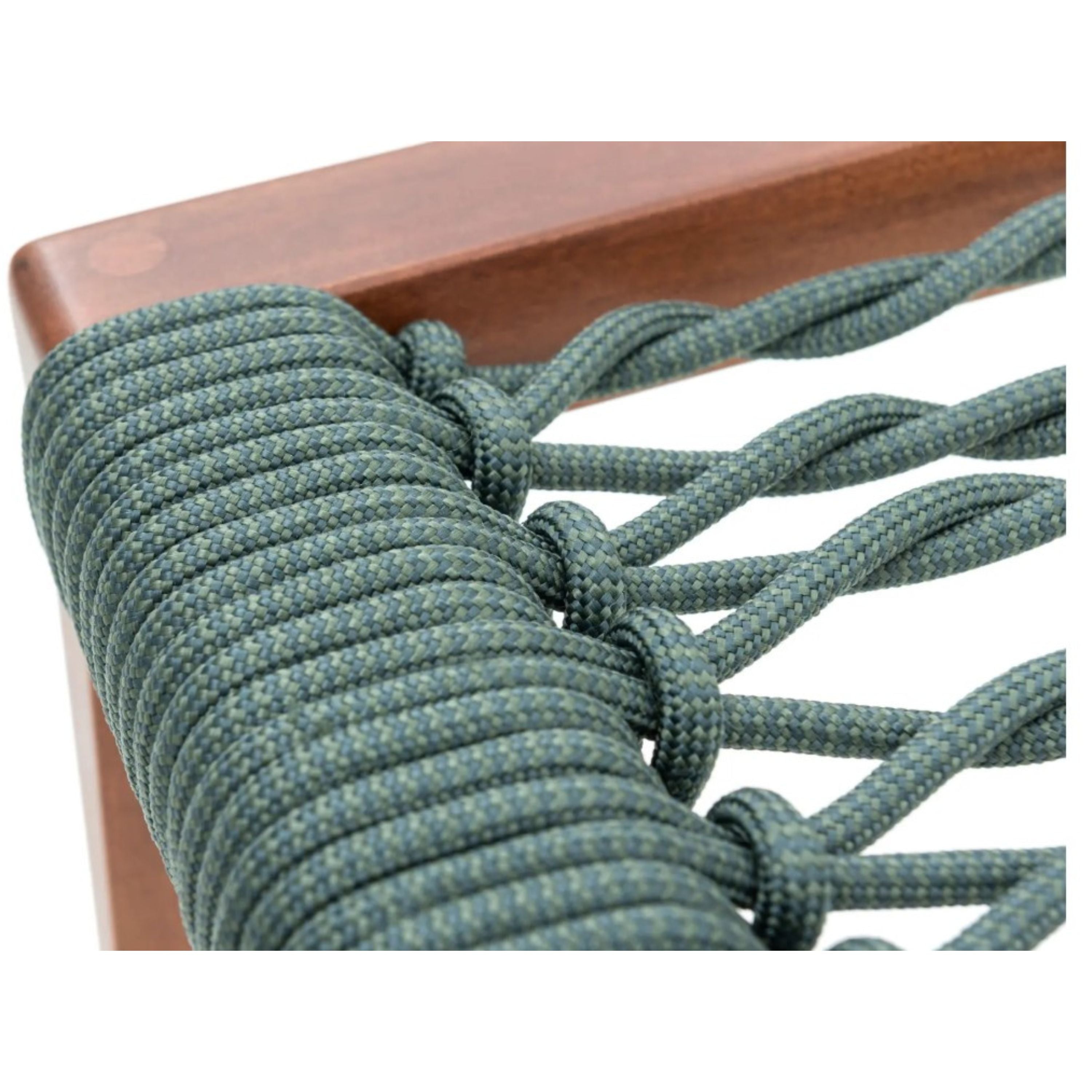 Solid wood structure with water-based paint for outdoor use. Seat woven with nautical rope. Option for seat cushion.