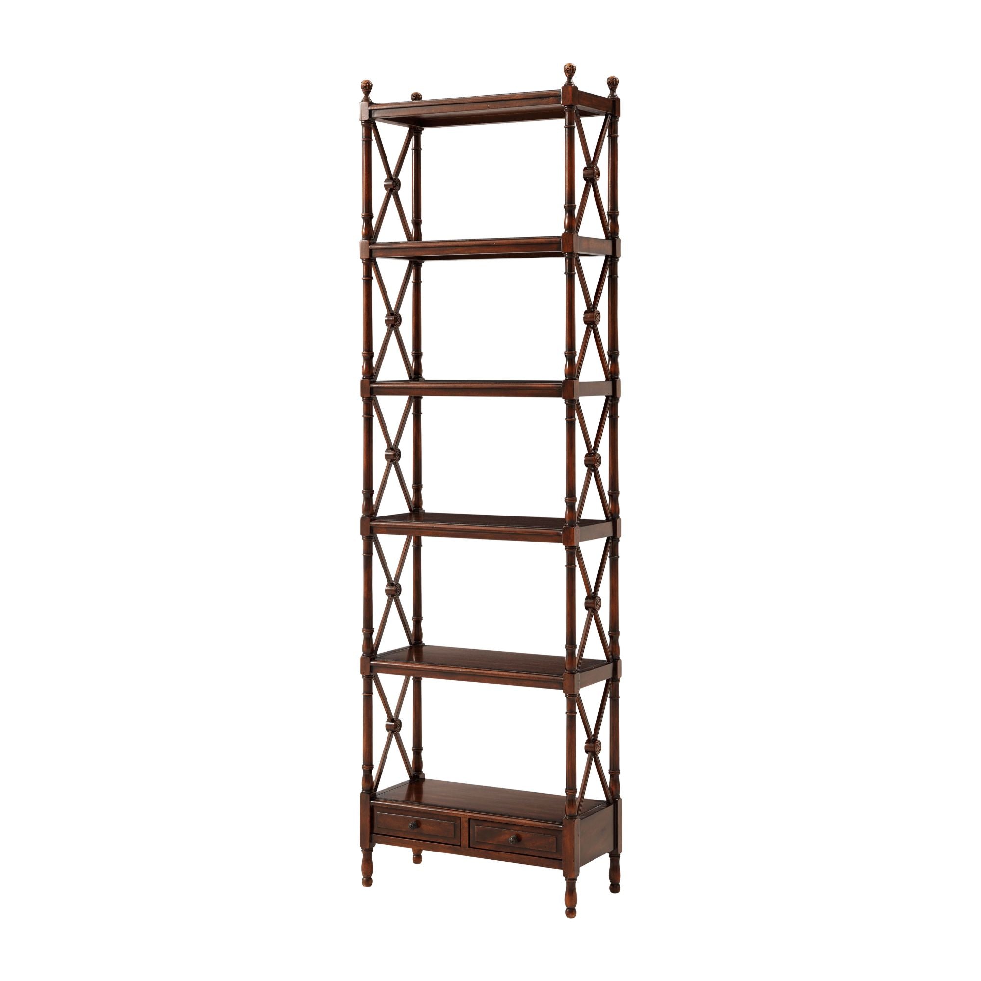 A six-tier etagere, the shelves between x supports, with two drawers to the lowest tier. The original Regency.