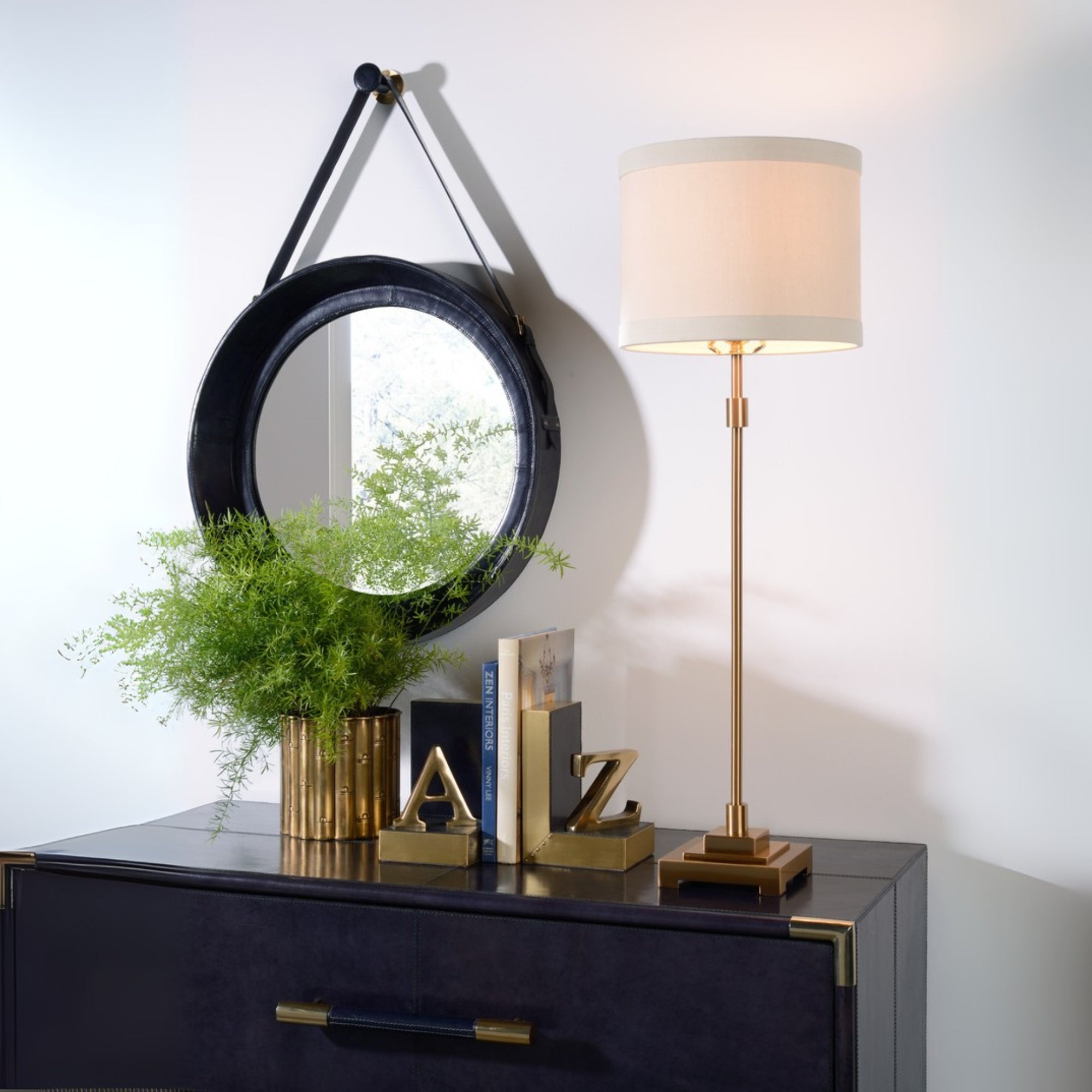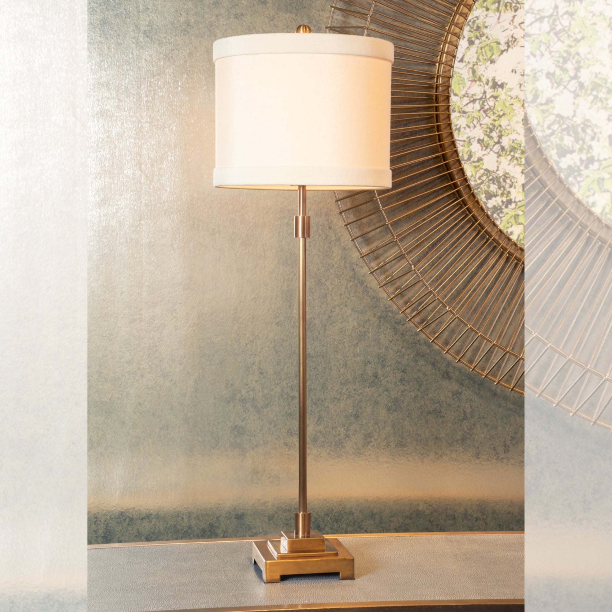 The Bailey Lamp is a refined lighting accent, combining timeless design with understated elegance. Crafted with a slender brass stem and a stepped square base, it features a lustrous antique patina that exudes warmth and sophistication. The drum shade in a soft neutral tone casts a gentle, ambient glow, making it perfect for enhancing console tables, desks, or side tables in both classic and contemporary interiors. A statement of luxury and subtle charm, ideal for elevating any living or work space.