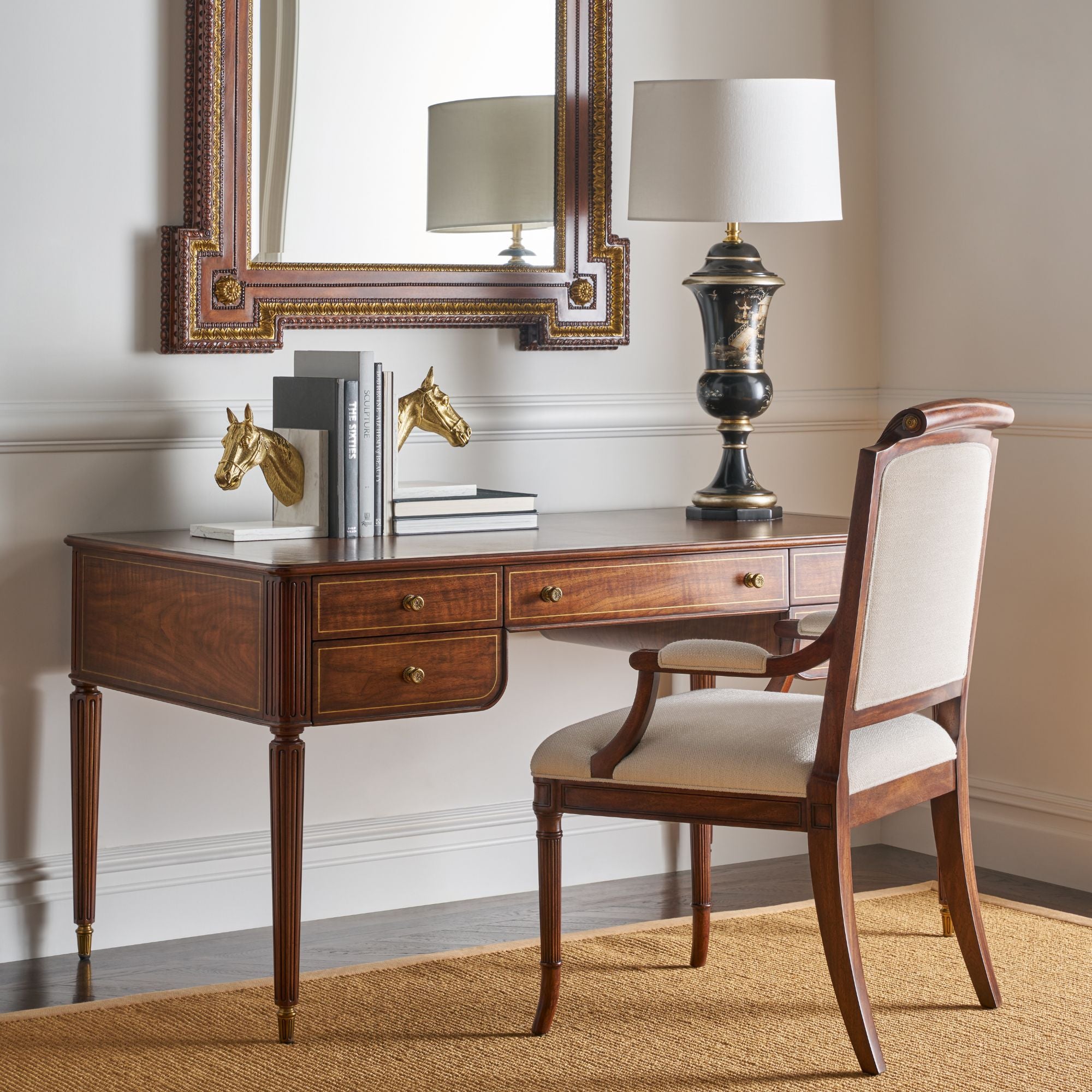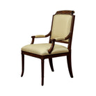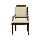 A finely carved mahogany dining armchair, the upholstered framed back with a swirl mahogany veneered scroll over top rail with fine brass details, the upholstered seat between part-padded arms, on panelled seat rails with turned and fluted legs with splay feet.