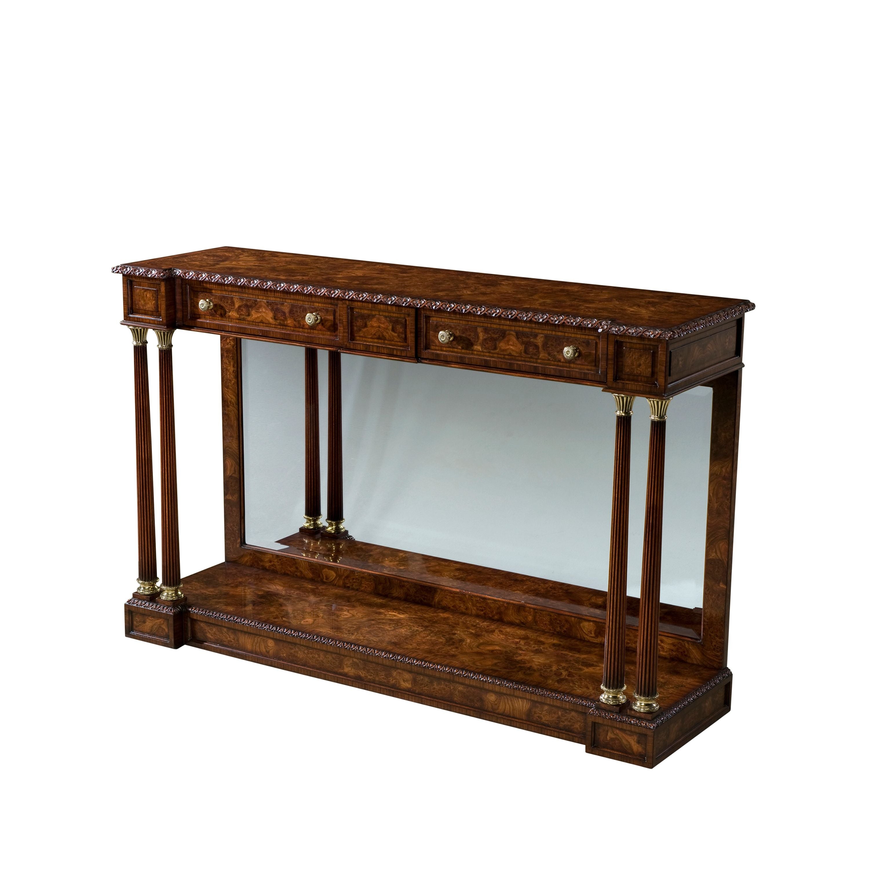A fine elm burl veneered and mahogany console table, the inverse breakfront top with a flowerhead hand carved edge, above two frieze drawers, the twin column supports with brass capitals and bases to each side before a bevelled edge mirror back panel, on a carved edge and panelled plinth base. Inspired by a Regency original.