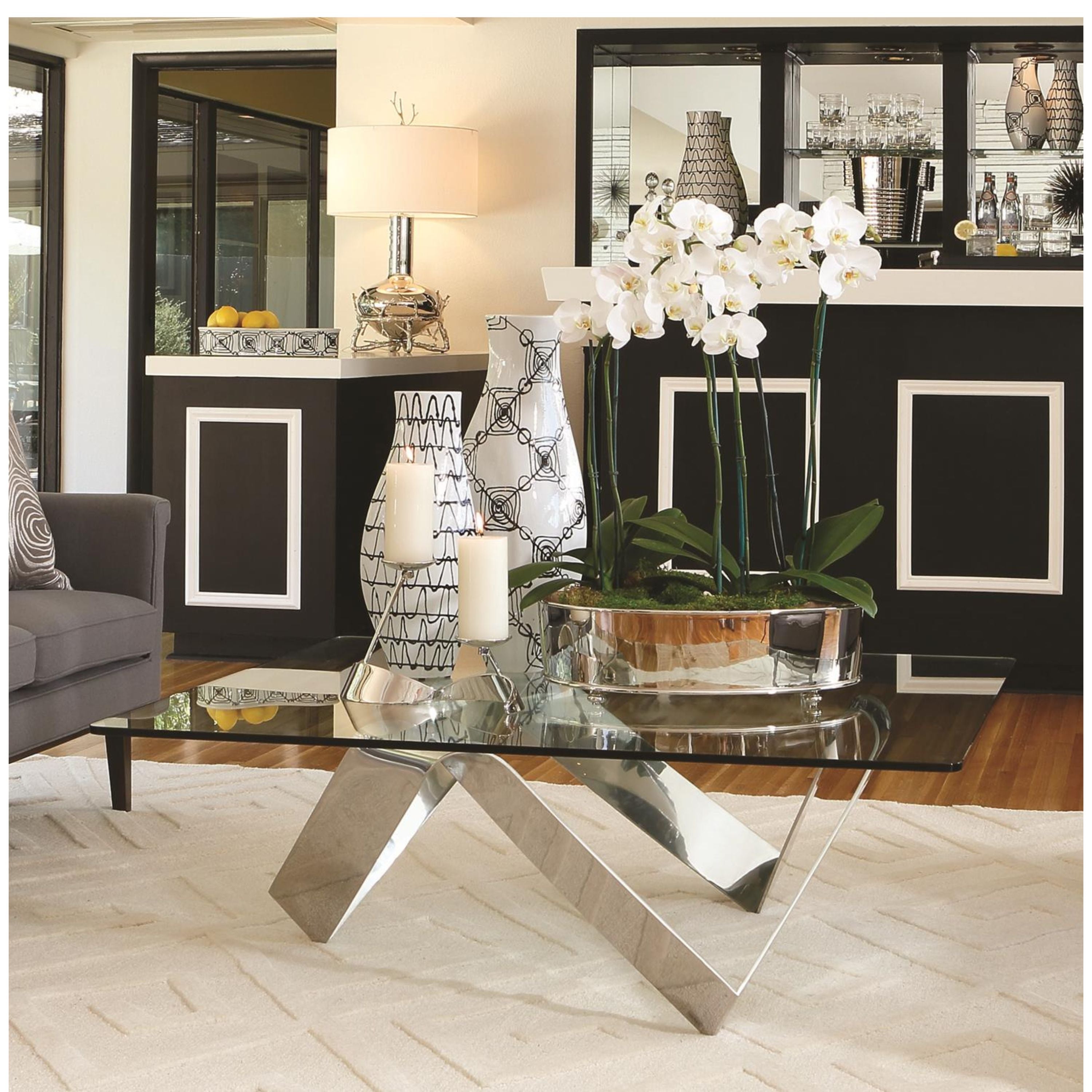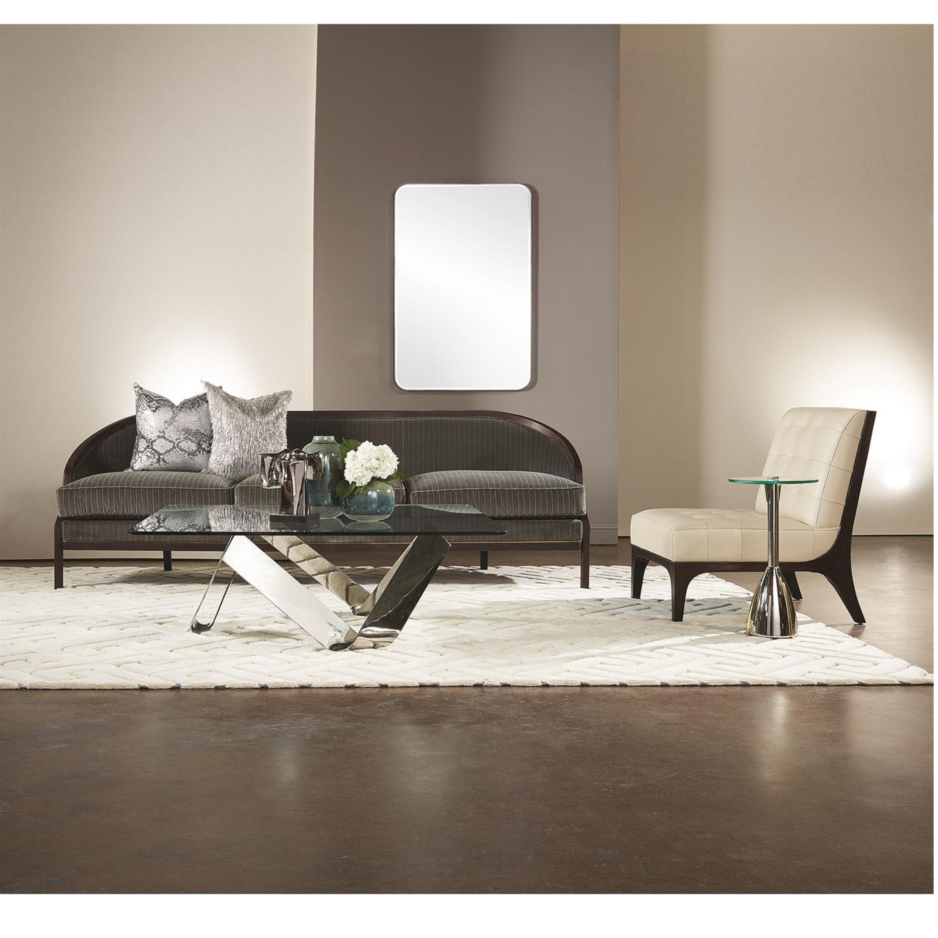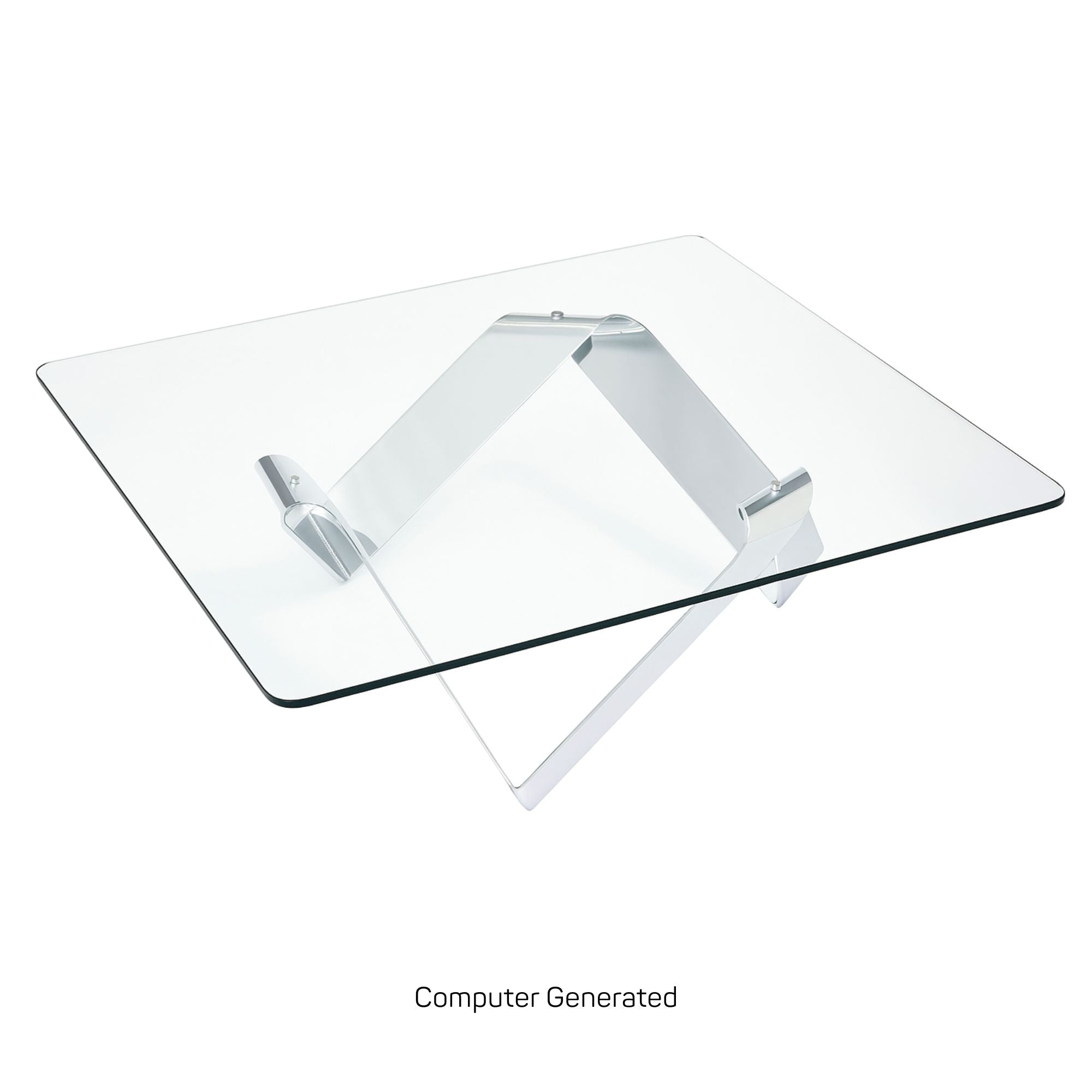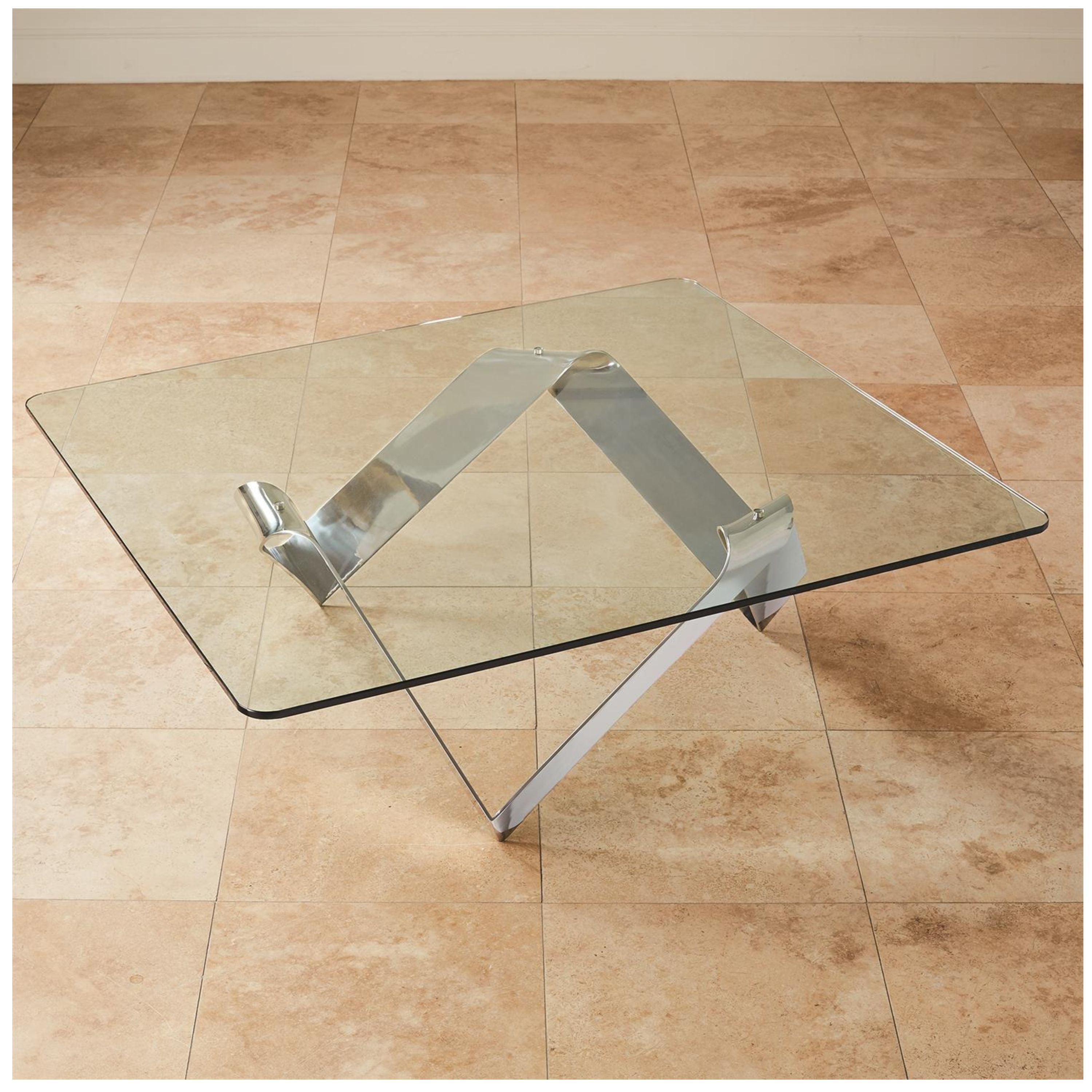 Modern and sculptural this bent stainless steel base is highlighted by the rounded square glass top.