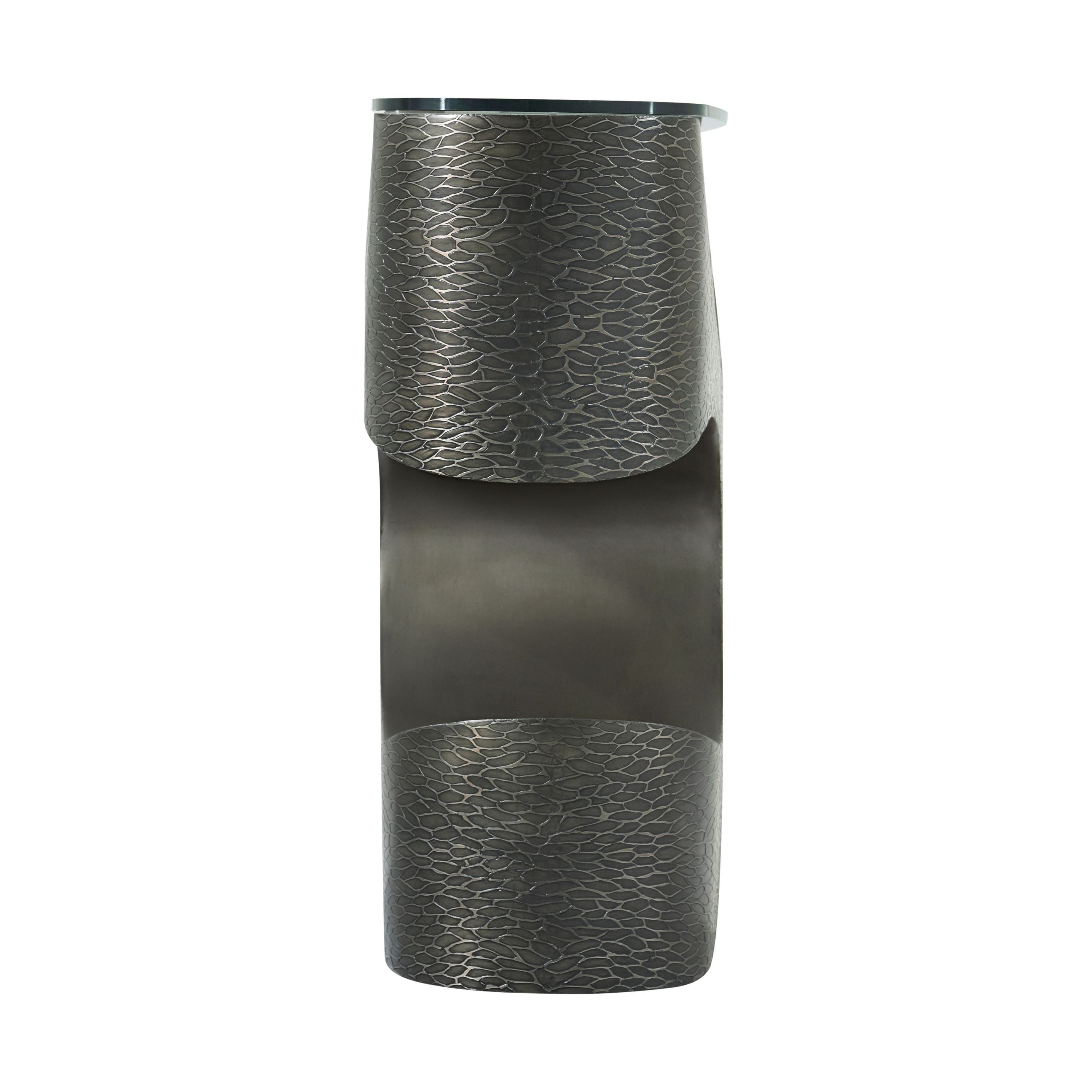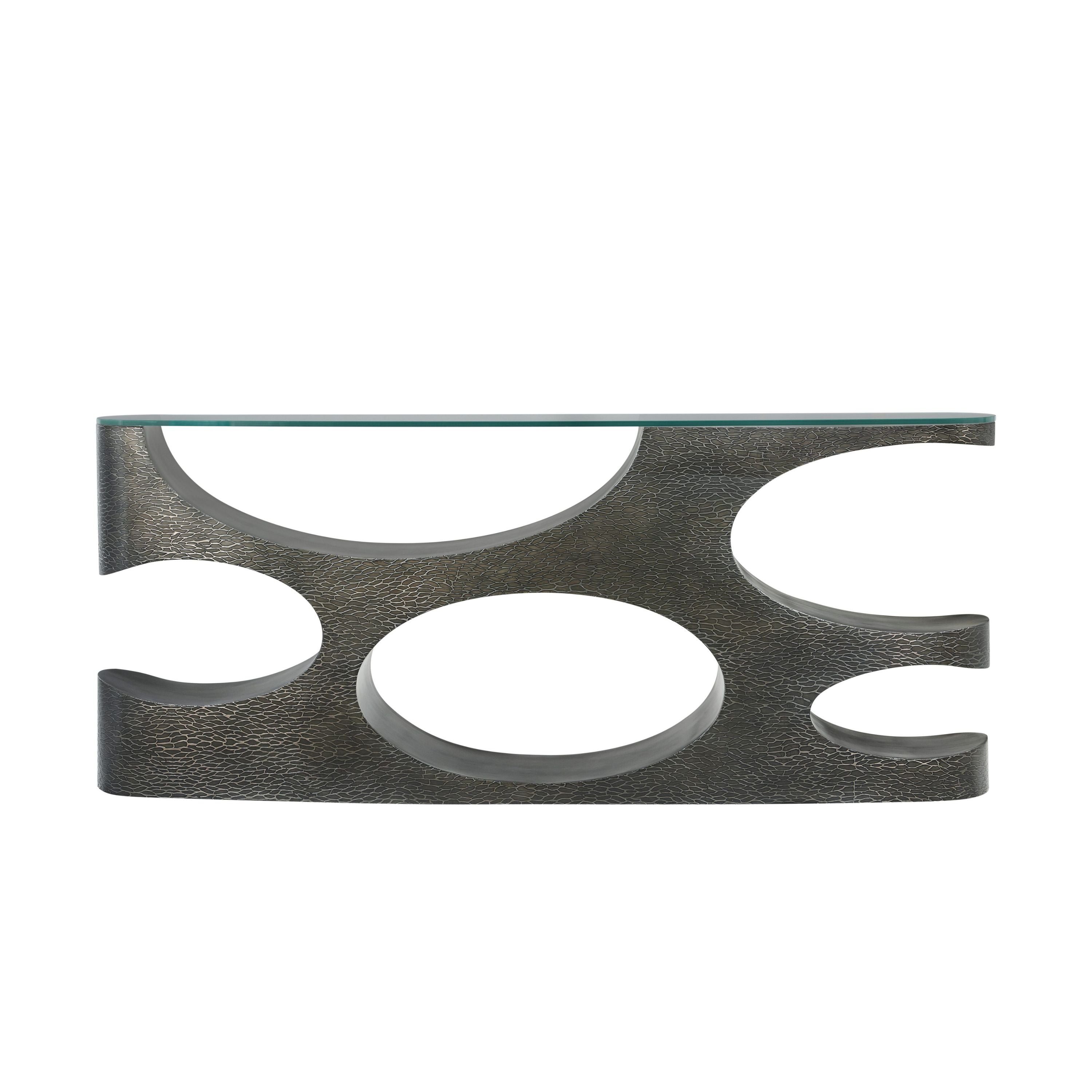 A pleasing contrast of geometric forms and textural carvings. The Essence Metal Console possesses an exquisite glass top above a metal base.