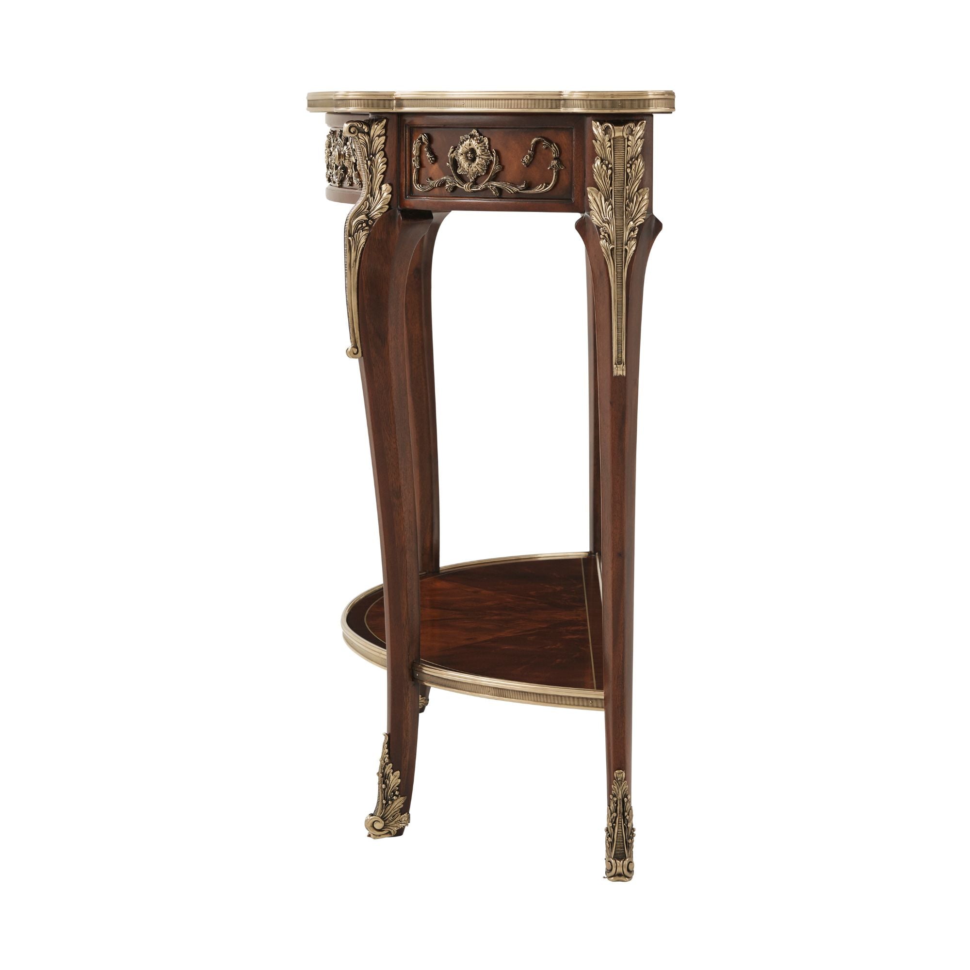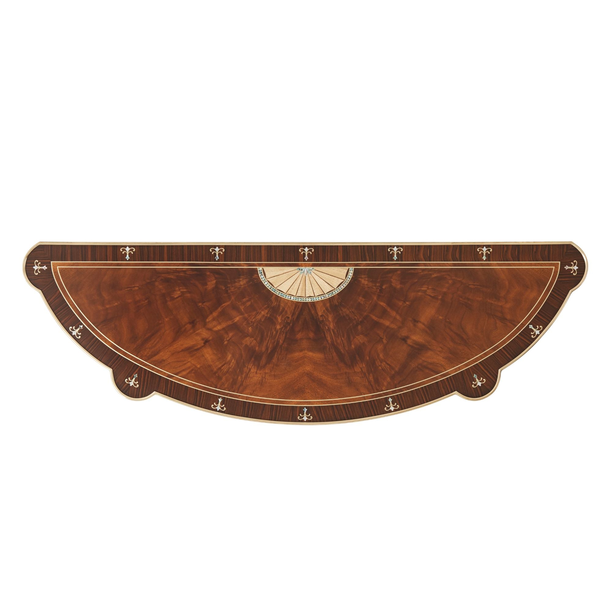 A fine flame mahogany and Morado banded console table with fan marquetry, brass line and mother of pearl inlays, the bowfront brass-bound top with lobed corners, above a Nickel Brass Finish cast brass acanthus scroll applied frieze with one drawer, on acanthus cast brass capped cabriole legs with scroll cast feet and joined by a brass-bound and veneered undertier.