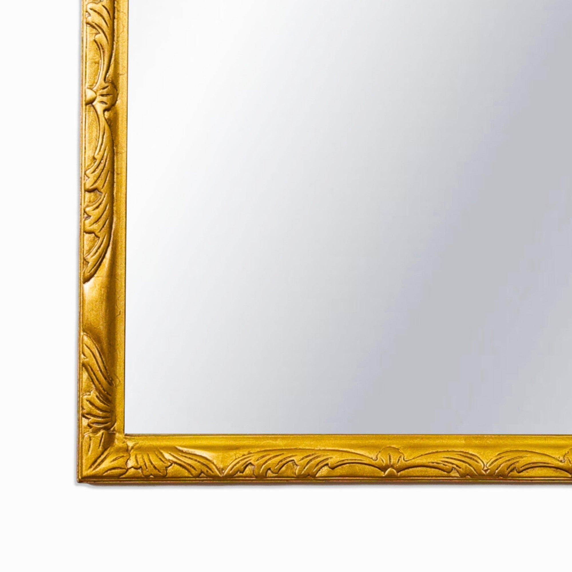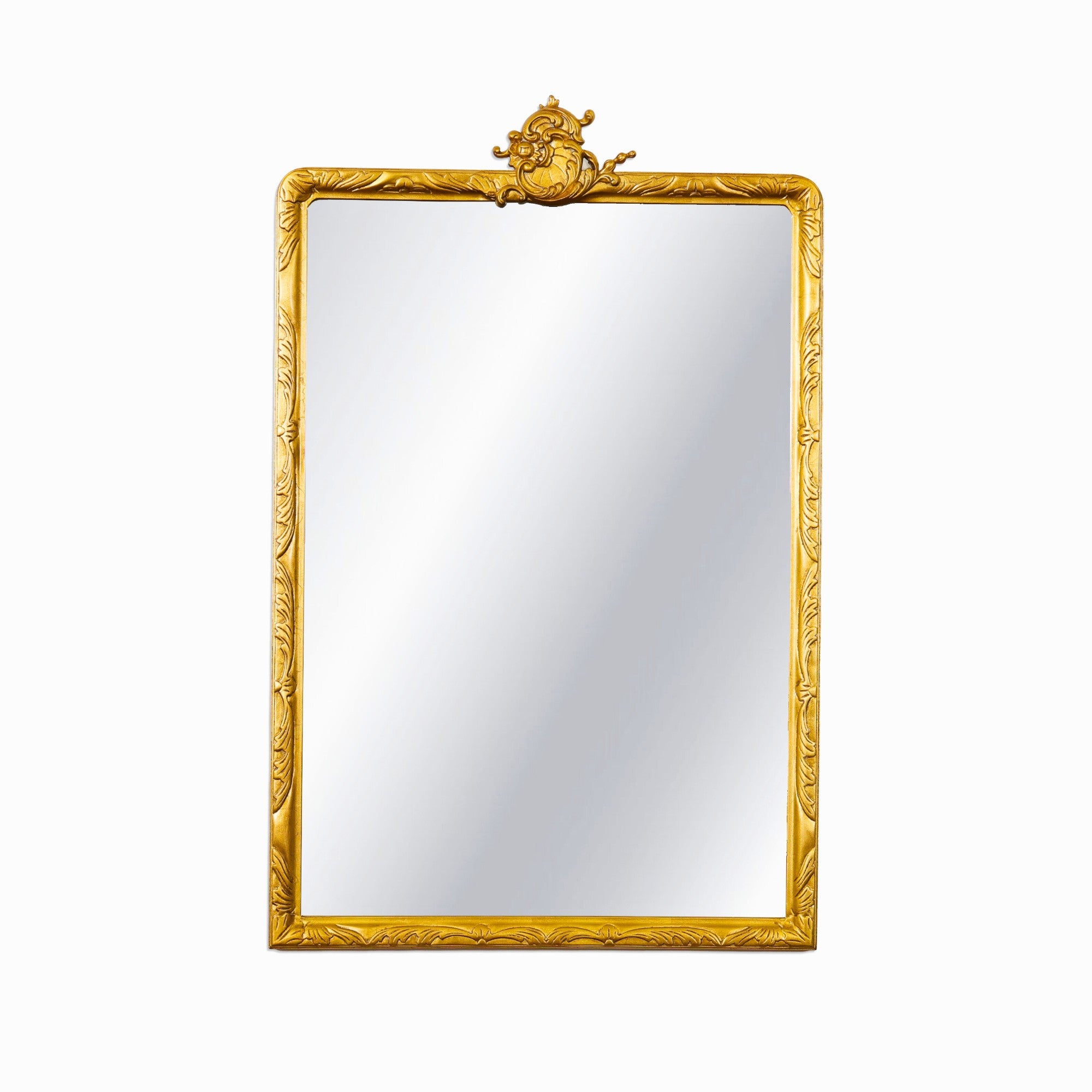 The Louis Crest Gilded Wall Mirror embodies timeless refinement drawn from classical European design. Its rectangular frame is meticulously carved with flowing foliate motifs, finished in a rich antique gold that lends depth and warmth. At the crown, a sculptural crest adds a subtle sense of heraldic grandeur, elevating the mirror from decorative accent to architectural statement. Elegant yet restrained, this piece brings balance and sophistication to formal living rooms, hallways, and refined bedroom interiors.