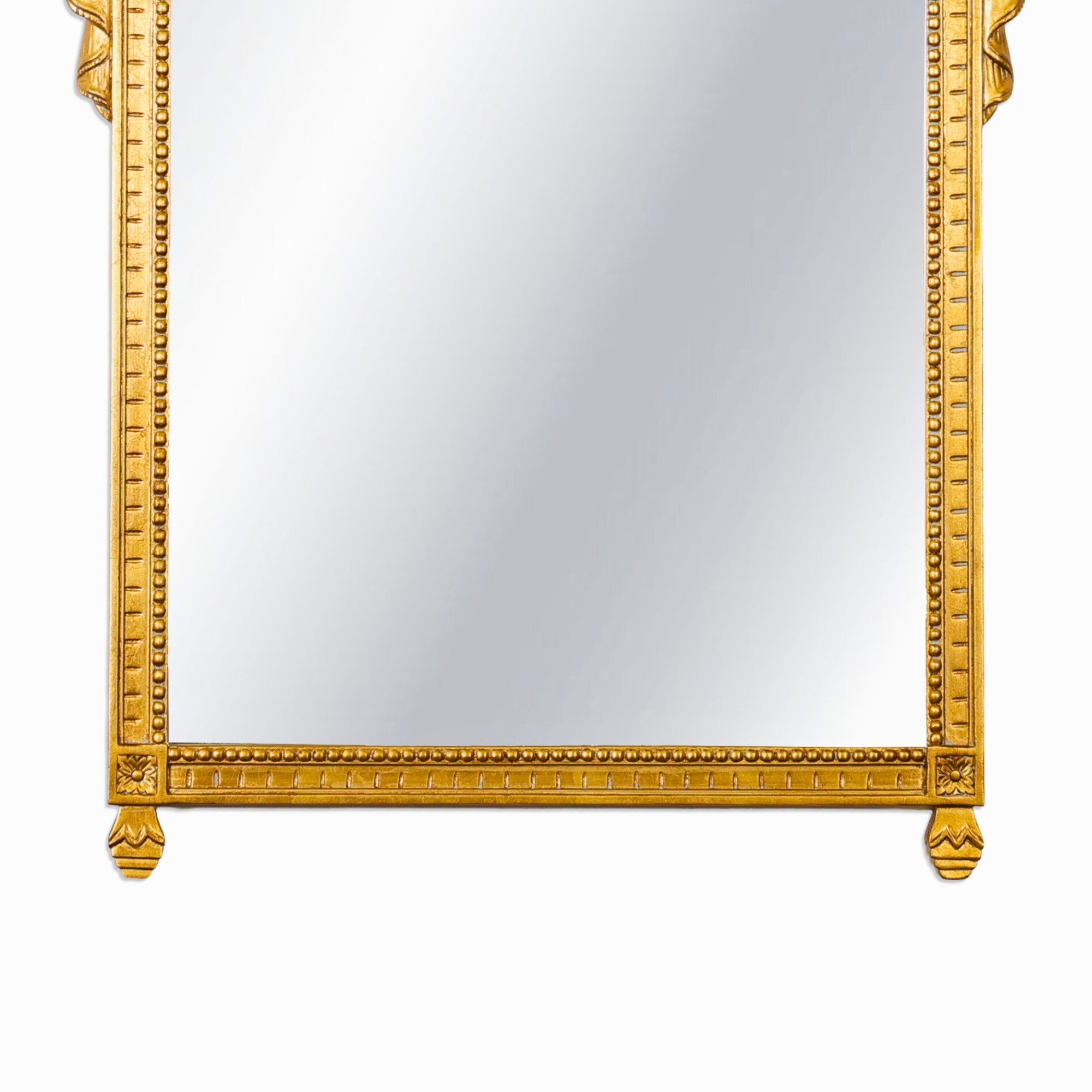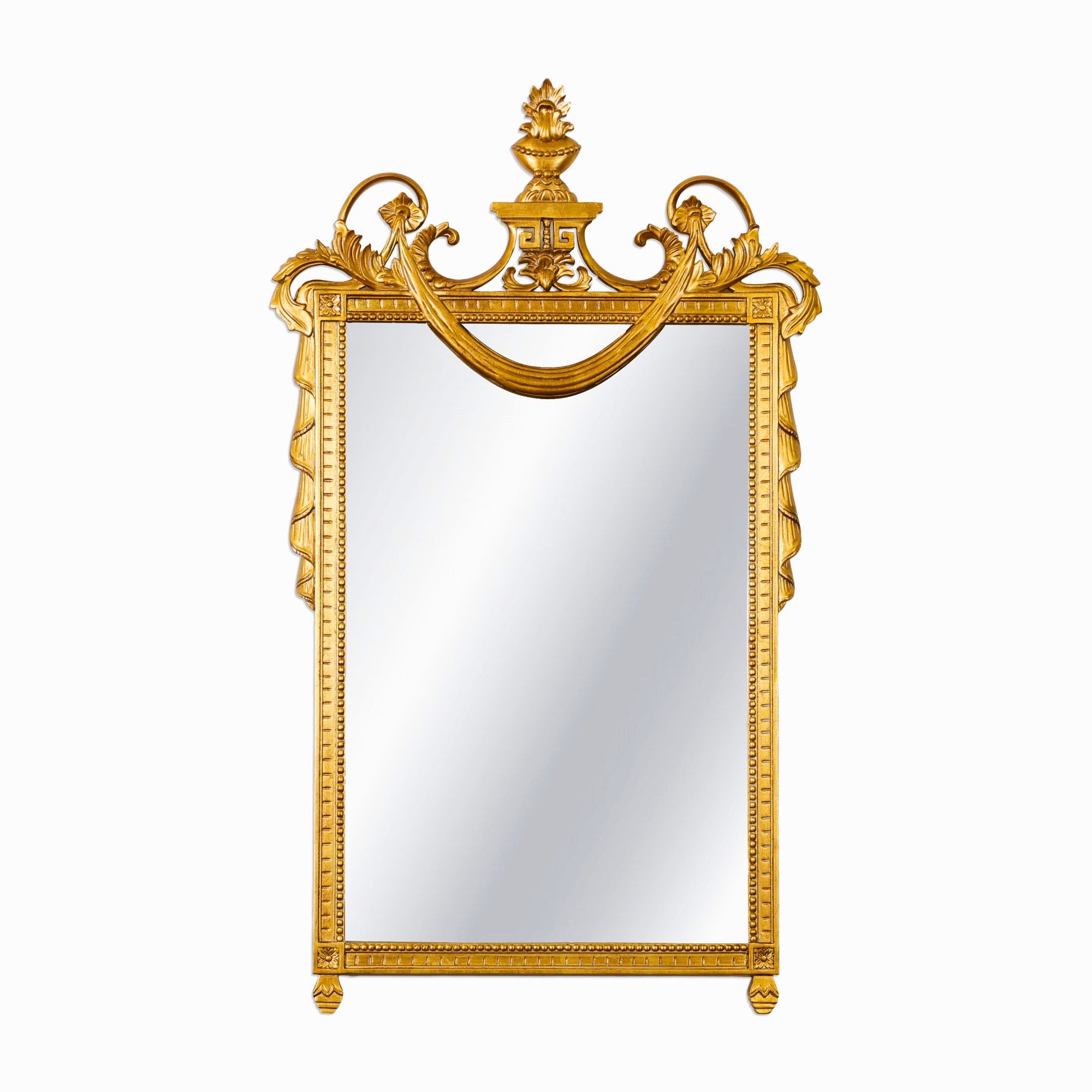 The Louis Draped Gilded Wall Mirror is a statement of regal elegance, inspired by classical European interiors. Expertly crafted with an intricately carved frame, the mirror features scrolling acanthus leaves, bead detailing, and a sculptural draped swag crowned by a decorative finial—all finished in a warm, luminous antique gold.