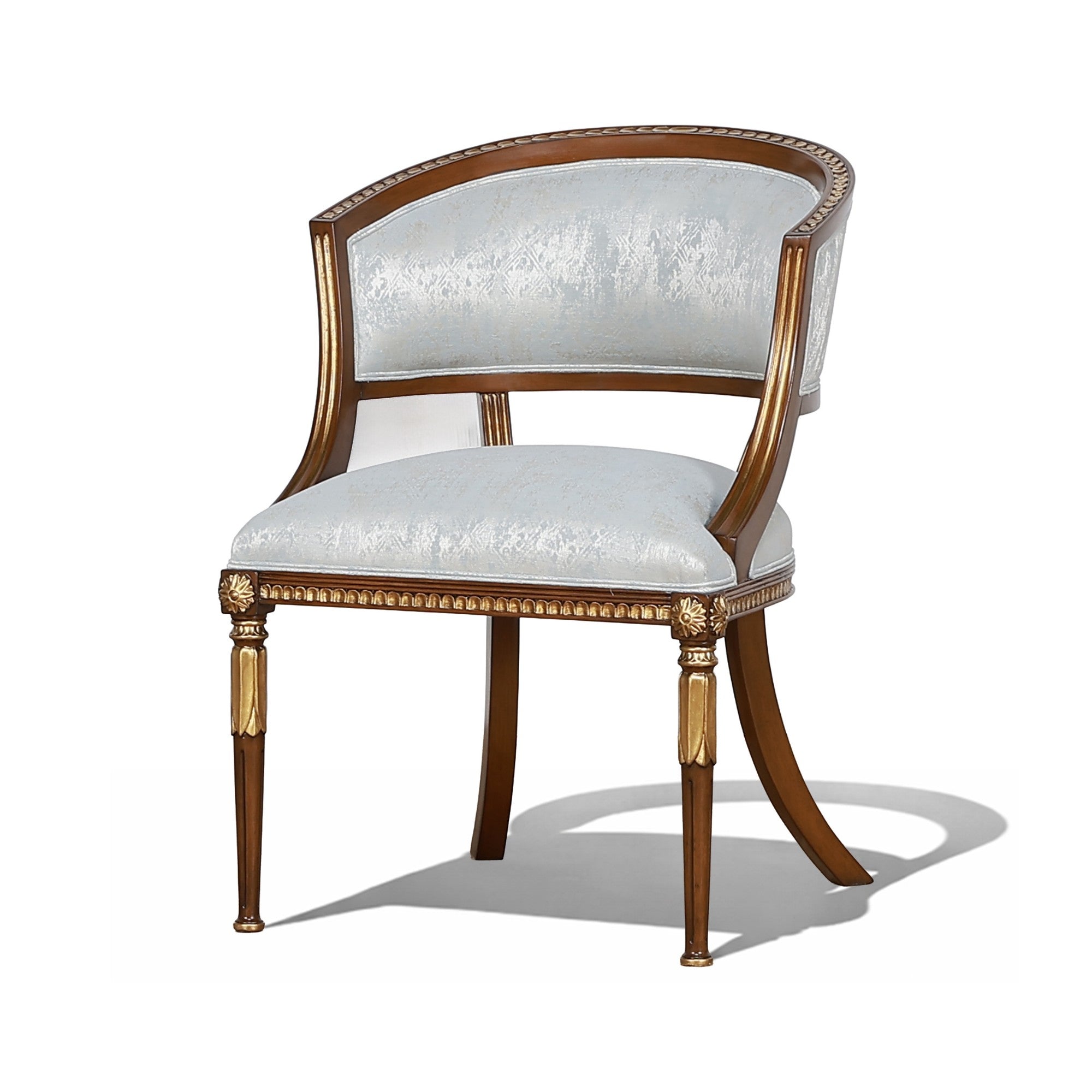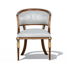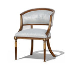 A refined accent chair with a gently curved back and classic cabriole-inspired silhouette. Upholstered in ivory damask and finished with hand-applied gold leaf accents, it offers timeless charm and poised elegance for dressing areas or formal seating spaces.